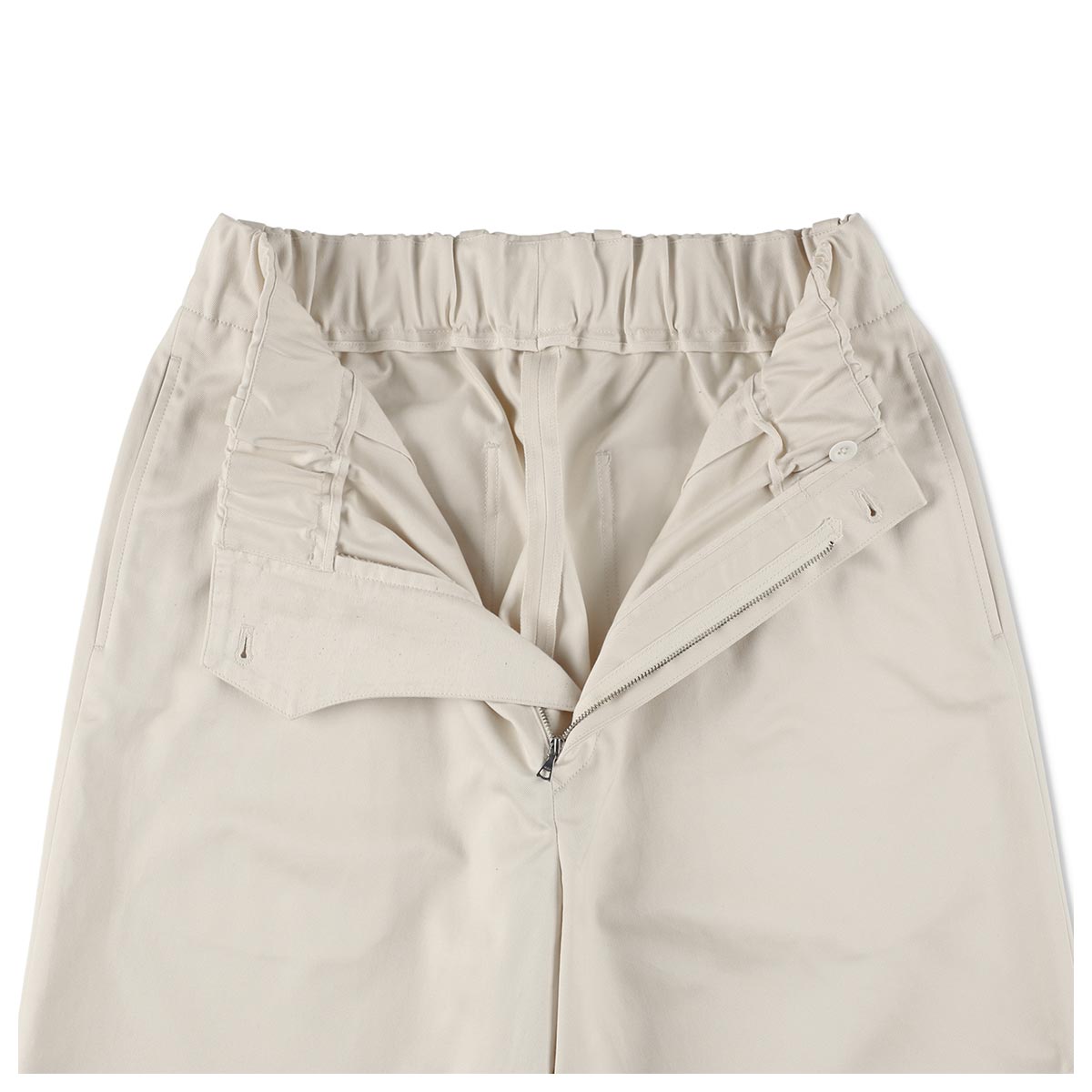 カジュアル素材ながらややドレス寄りに仕立てたトラウザーズです。 左右2 本のインタックによるゆとりある渡りから裾にかけて緩やかにテーパードしたセミワイドの シルエットが特徴です。