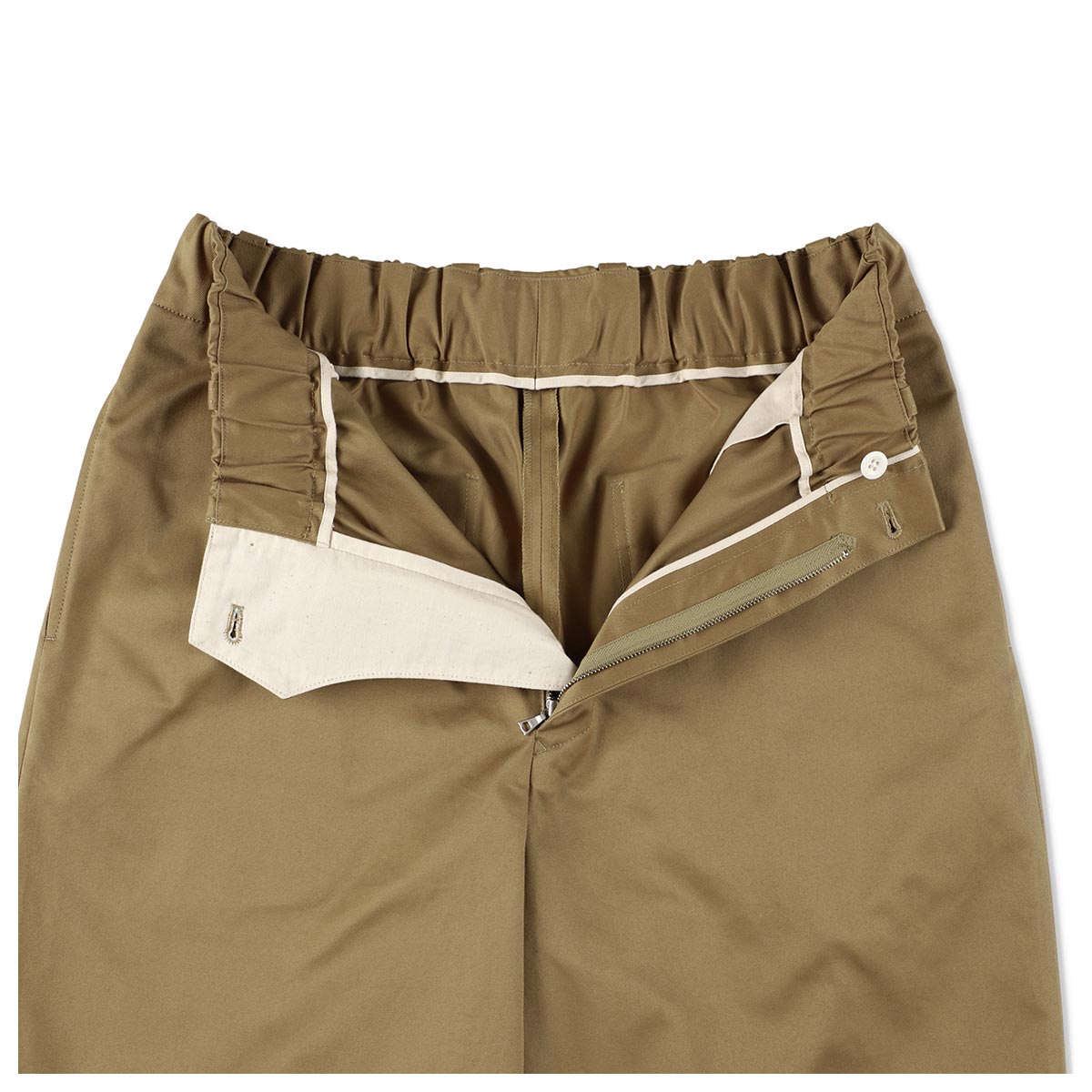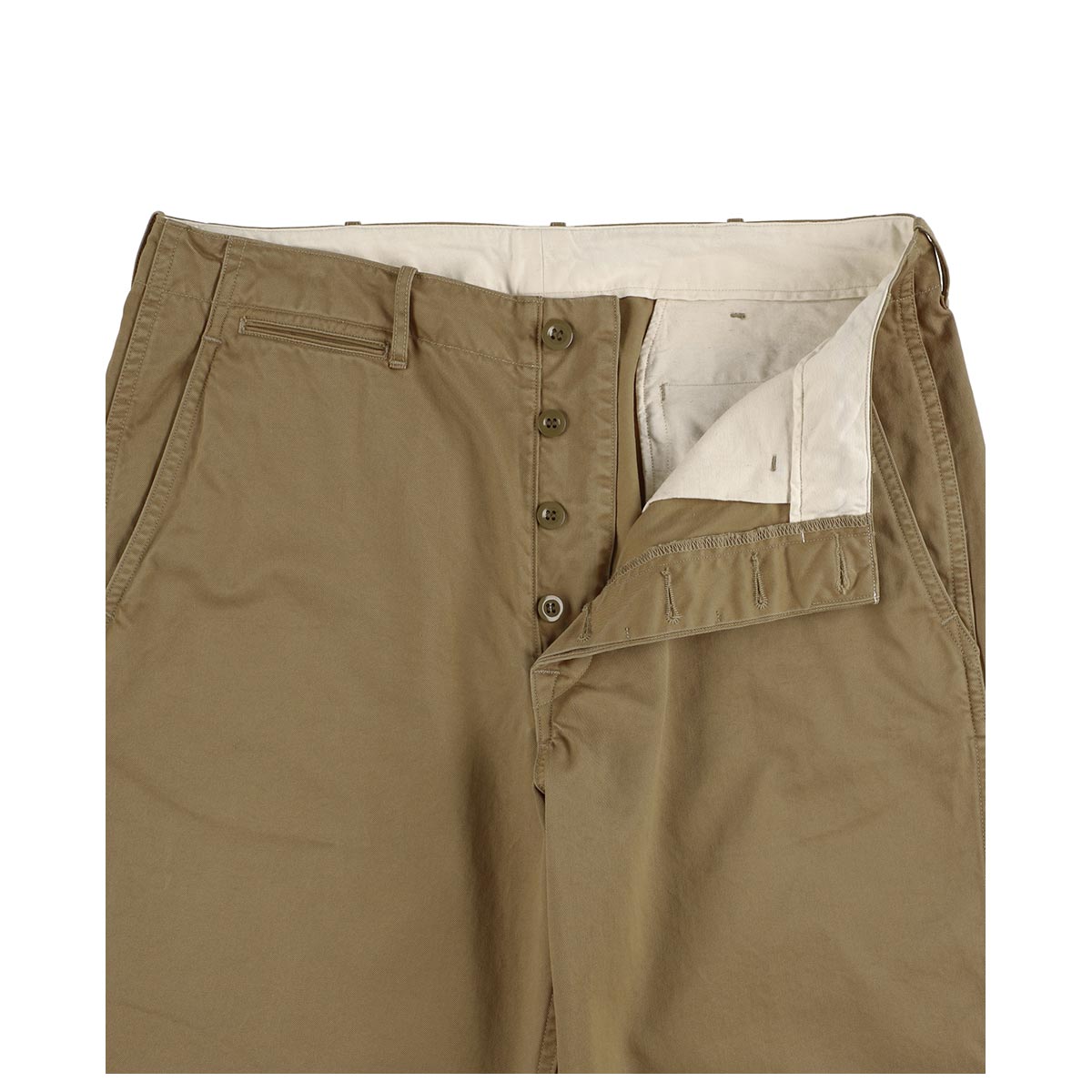 41 カーキミリタリーチノをベースに腰周りは程良くフィットさせ、 ワイドな渡りから裾にかけてわずかにテーパードさせた チノトラウザーズ。 股上を深めに設定しているため、履き込みの位置はややローライズ気味の方が全体のバランスが取りやすいです。 高密度で光沢感のあるチノ素材。ソフトさとドライな質感を併せ持つヴィンテージの米綿のクオリティを求めて糸からこだわったオリジナルのチノクロスを採用。 こなれた雰囲気を出すためにウォッシュ加工が施されています。 加工により生地が柔らかくなって、履き心地が良いのも魅力です。