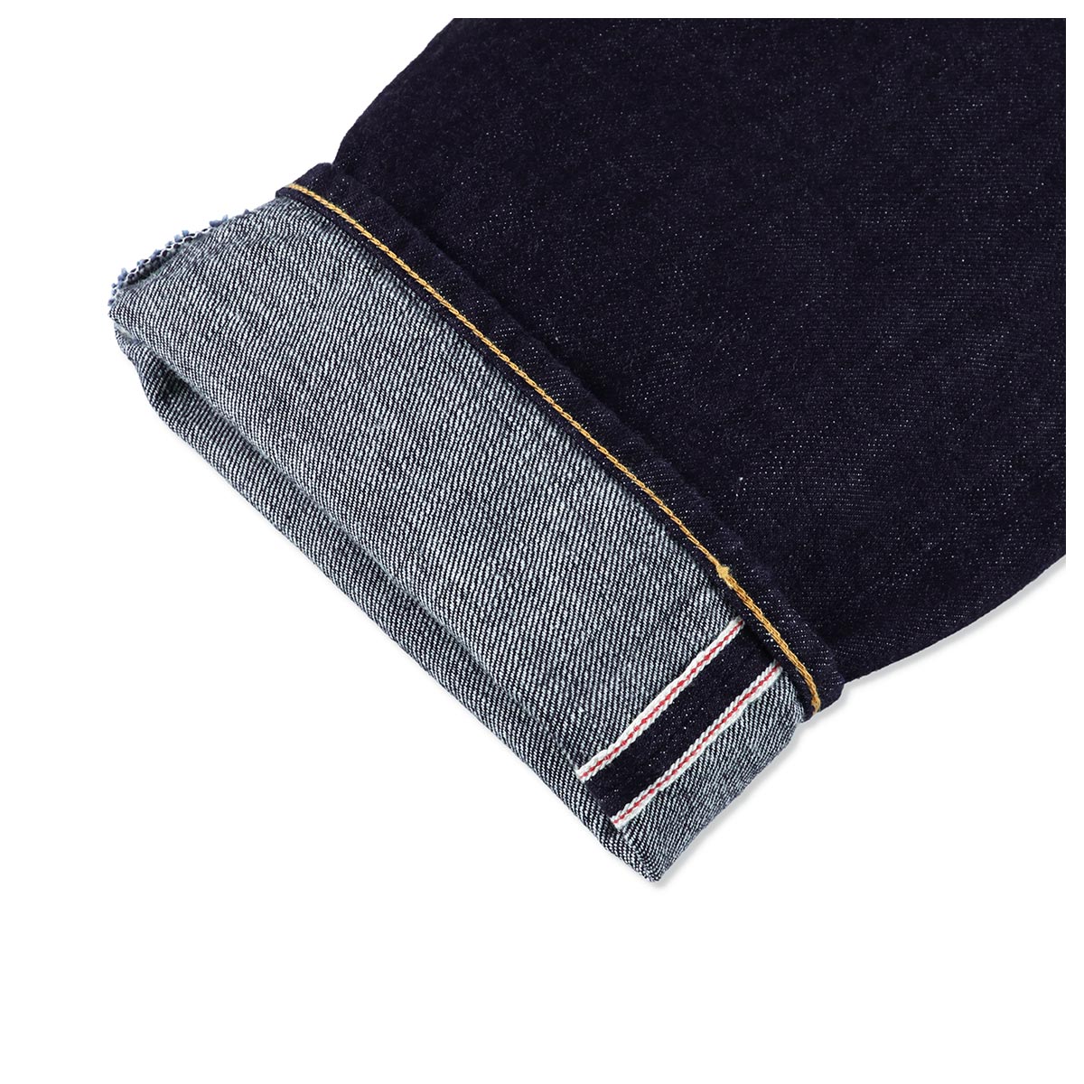 腰周りはややフィットさせ極太の渡りから裾にかけてほぼストレートのワイドシルエットのジーンズ。 経年変化による ヴィンテージ風の表情を求めて縫製仕様にもこだわっています。 番手や色の異なる 数種類の綿糸を使い分け、ミシンは現在では生産されていない米国製のユニオンスペシャルを使用して縫製しています。綿糸を使用することにより生地の縮みに合わせて糸も縮みセルビッヂデニム特有のよじれ、アタリが現れます。股上を深く設定しているため、好みに合わせて 穿きこみ位置を調整できるのも便利なポイントです。