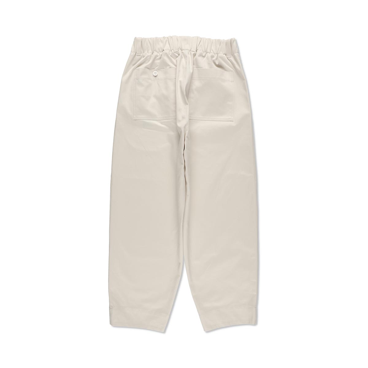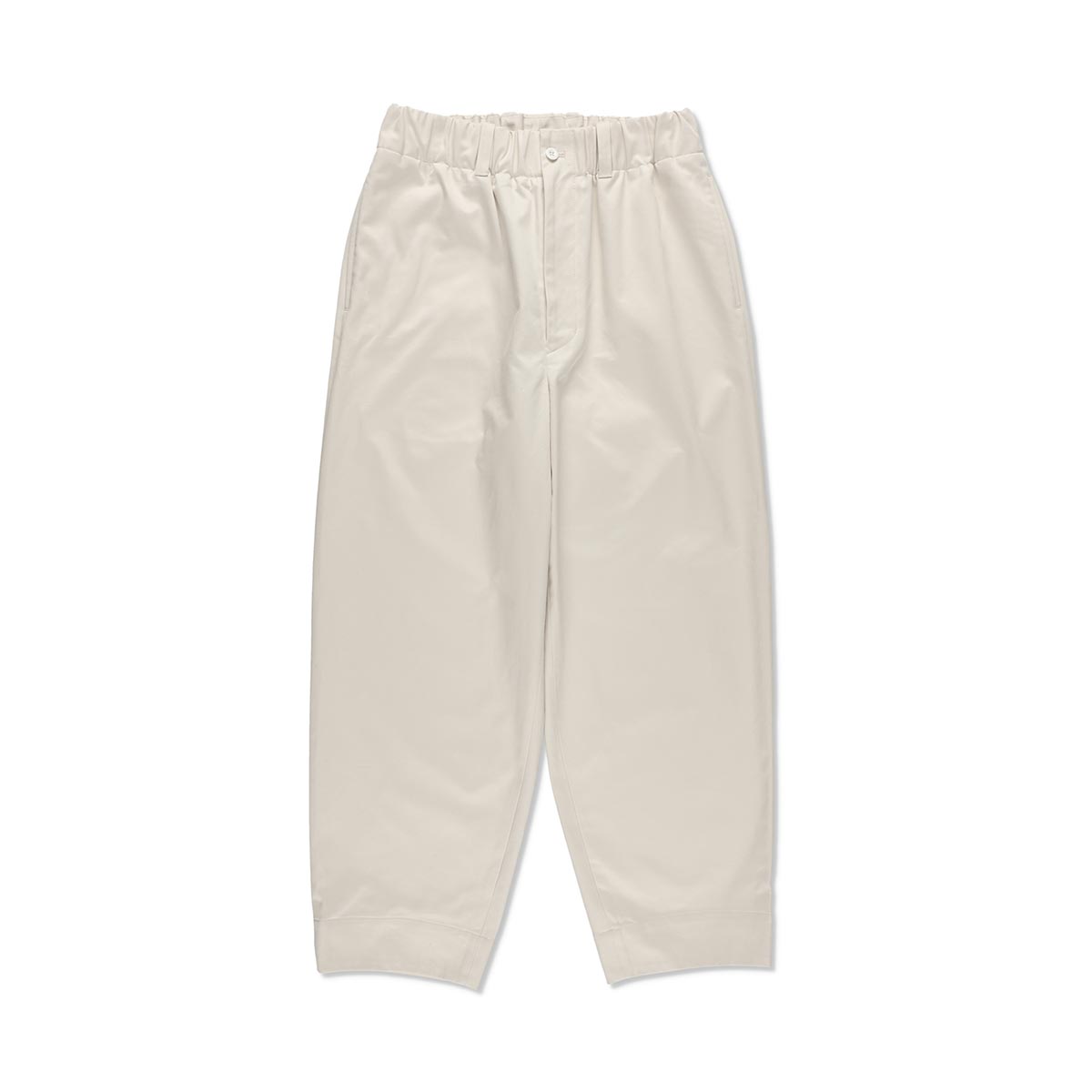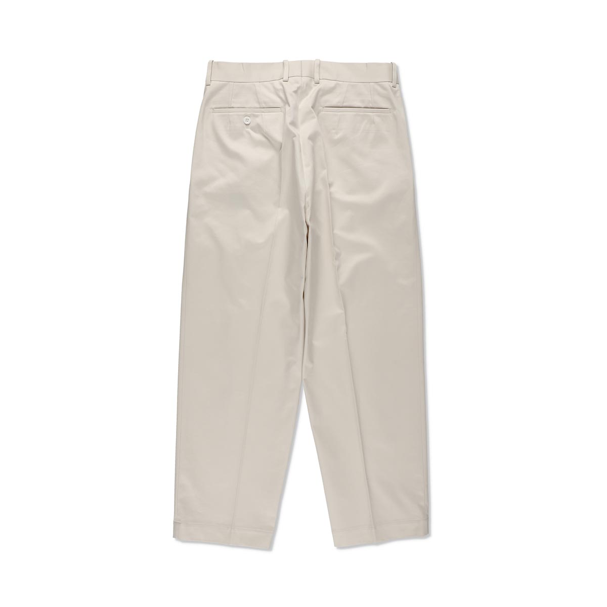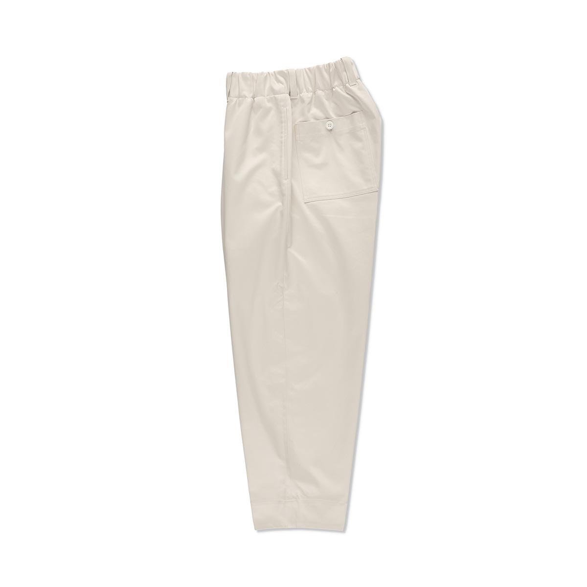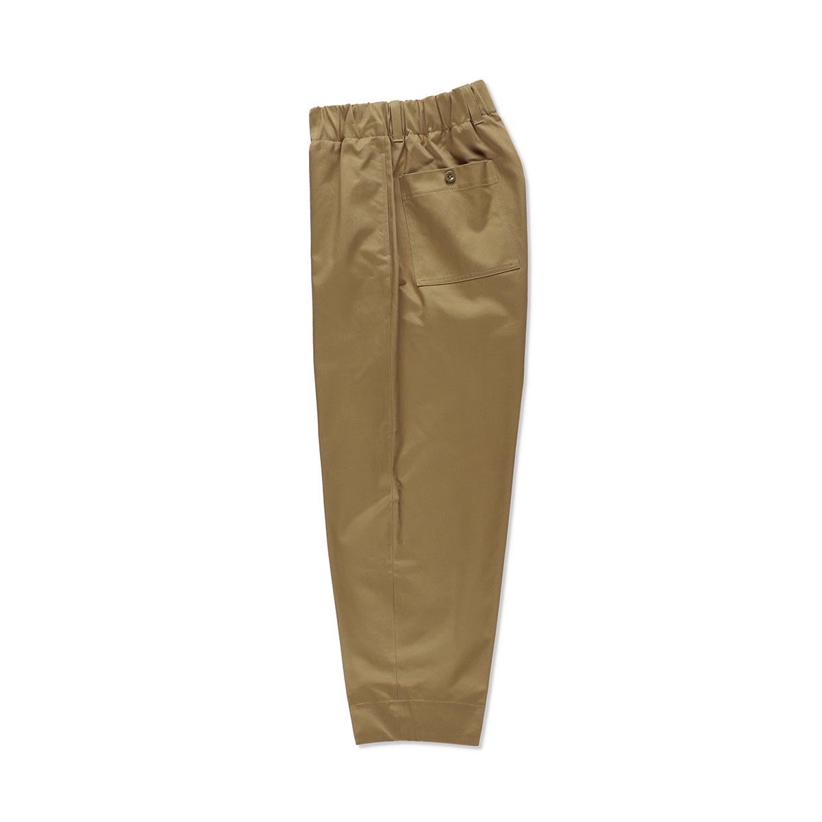 カジュアル素材ながらややドレス寄りに仕立てたトラウザーズです。 左右2 本のインタックによるゆとりある渡りから裾にかけて緩やかにテーパードしたセミワイドの シルエットが特徴です。