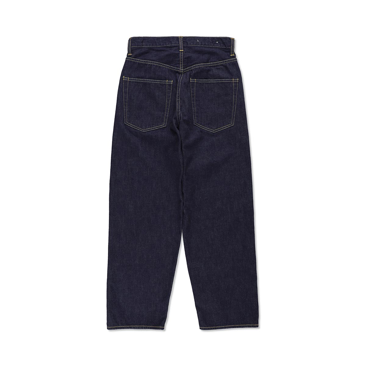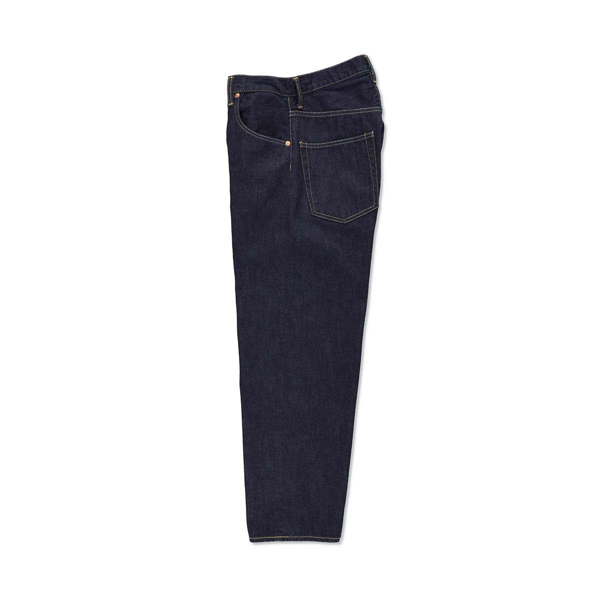 腰周りはややフィットさせ極太の渡りから裾にかけてほぼストレートのワイドシルエットのジーンズ。 経年変化による ヴィンテージ風の表情を求めて縫製仕様にもこだわっています。 番手や色の異なる 数種類の綿糸を使い分け、ミシンは現在では生産されていない米国製のユニオンスペシャルを使用して縫製しています。綿糸を使用することにより生地の縮みに合わせて糸も縮みセルビッヂデニム特有のよじれ、アタリが現れます。股上を深く設定しているため、好みに合わせて 穿きこみ位置を調整できるのも便利なポイントです。