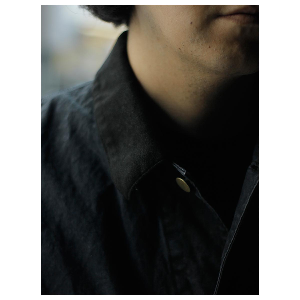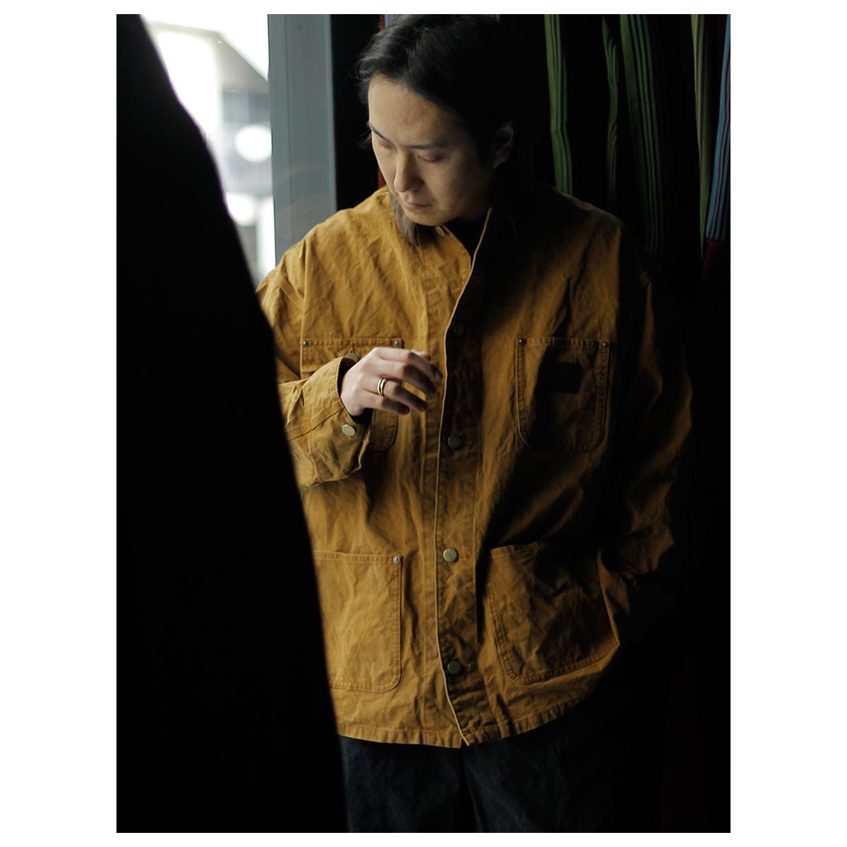 打ち込みのよいライトオンスのダック生地にパラフィン加工でコーティングした生地。さらにストーンバイオ加工などを施し、全体にムラ感とアタリを出しています。