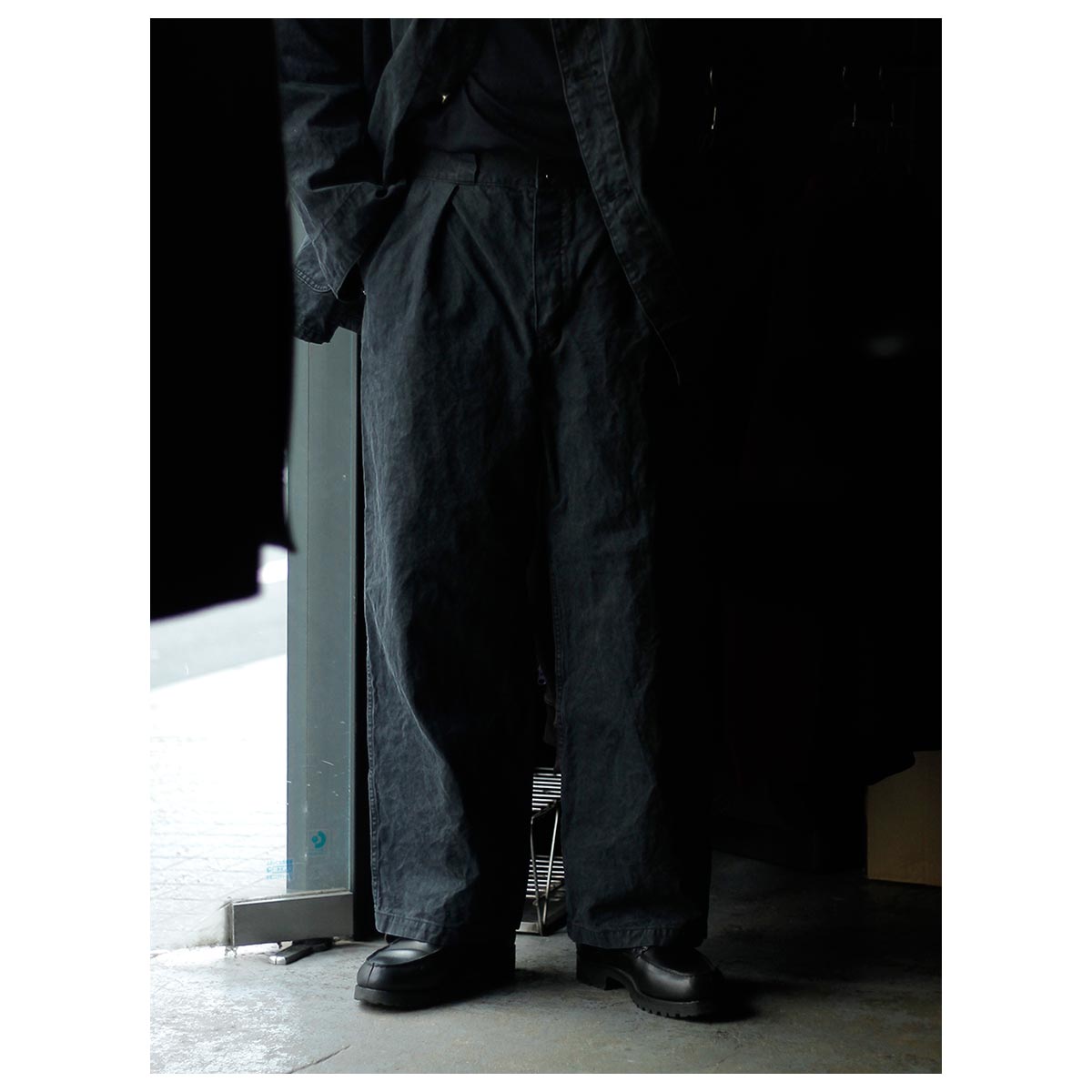 今季の始まりは2型。ワックスダック生地を用いた、チョアジャケットとワイドトラウザーです。