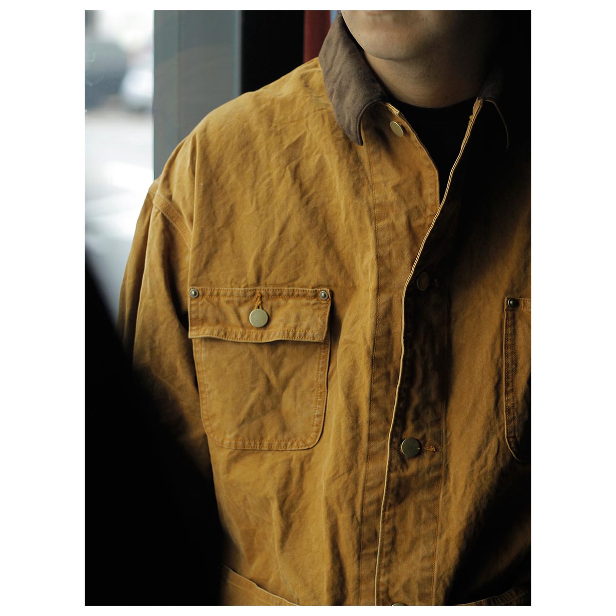 打ち込みのよいライトオンスのダック生地にパラフィン加工でコーティングし、さらにストーンバイオ加工などを施し、全体にムラ感とアタリを出しています。