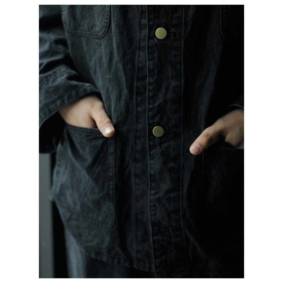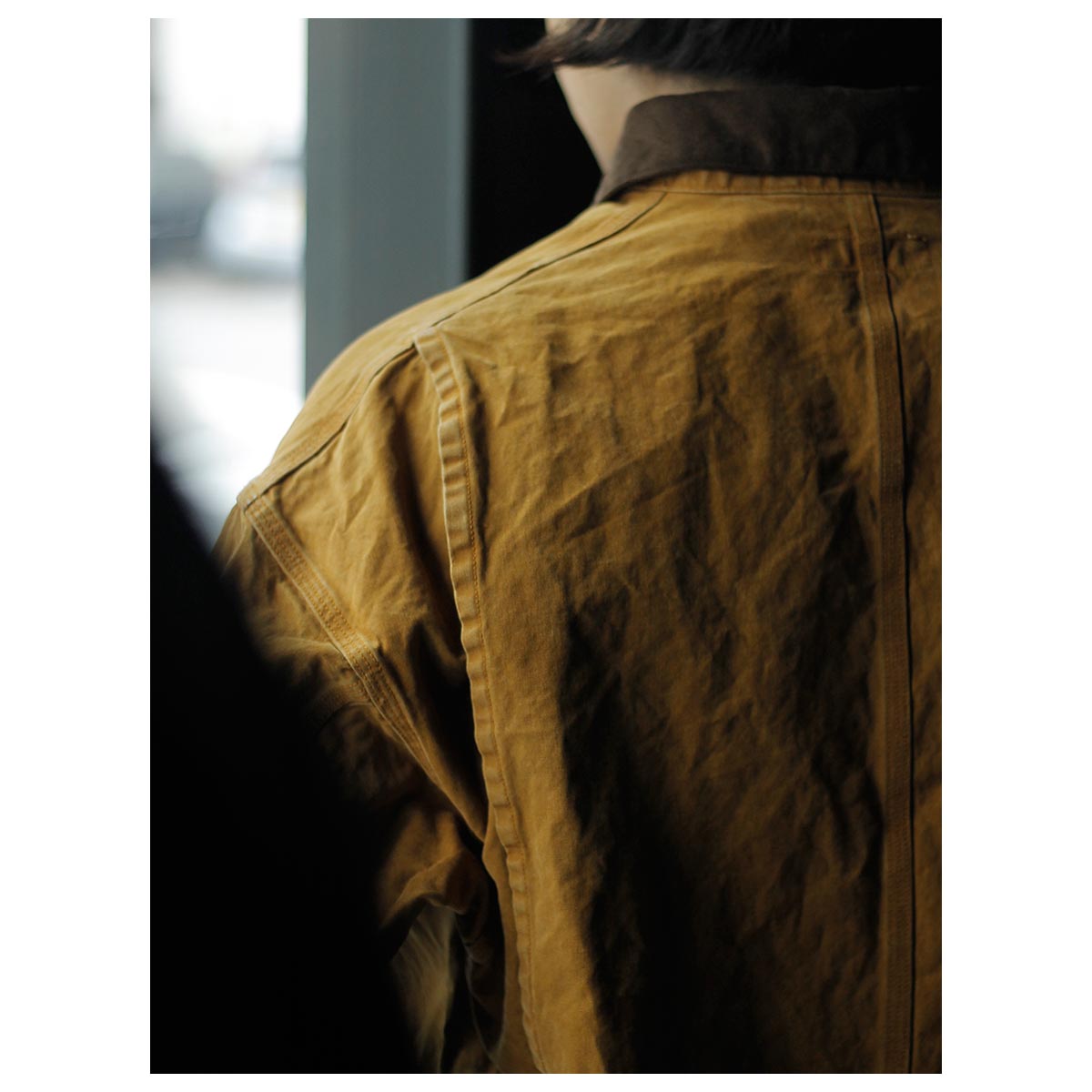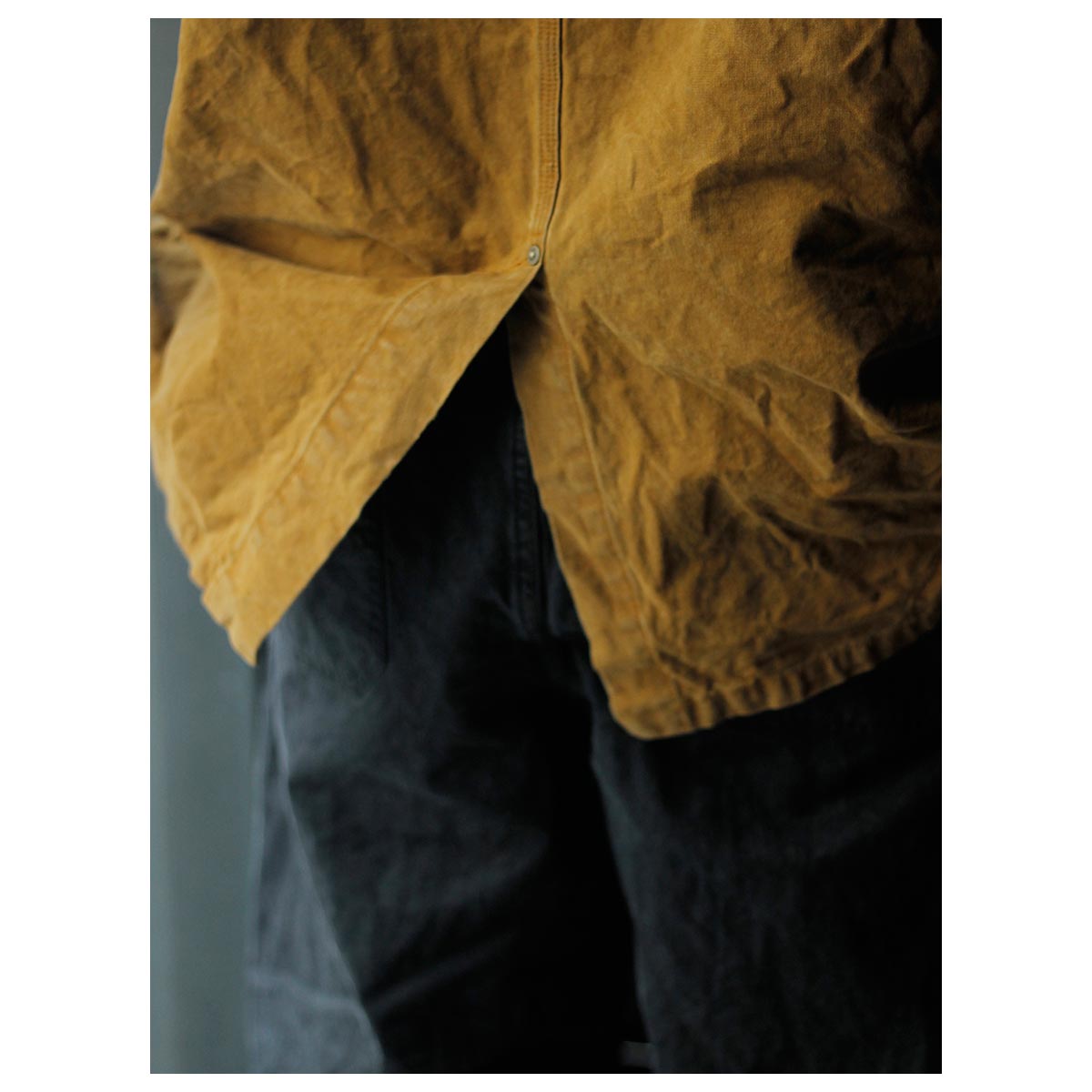 打ち込みのよいライトオンスのダック生地にパラフィン加工でコーティングした生地。さらにストーンバイオ加工などを施し、全体にムラ感とアタリを出しています。