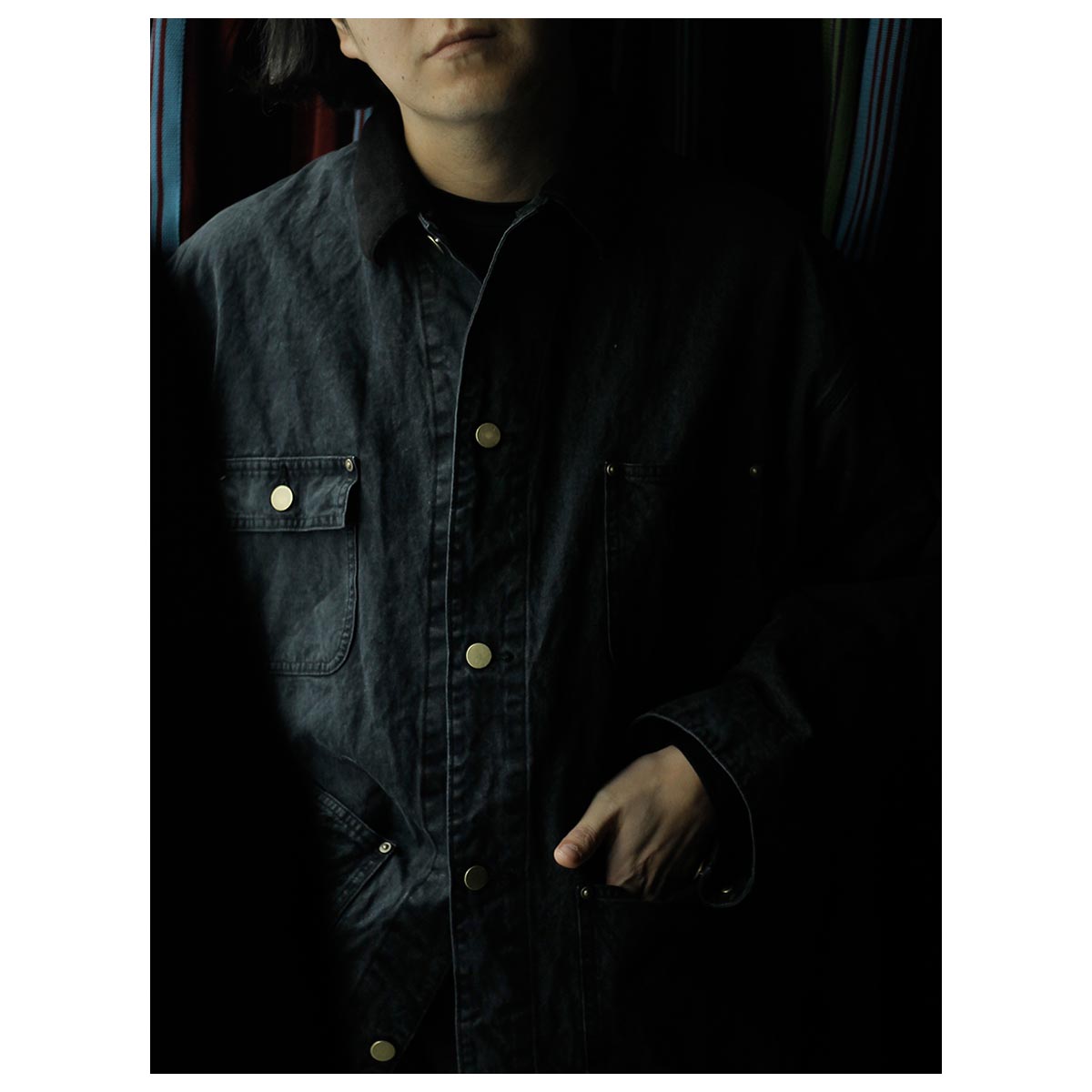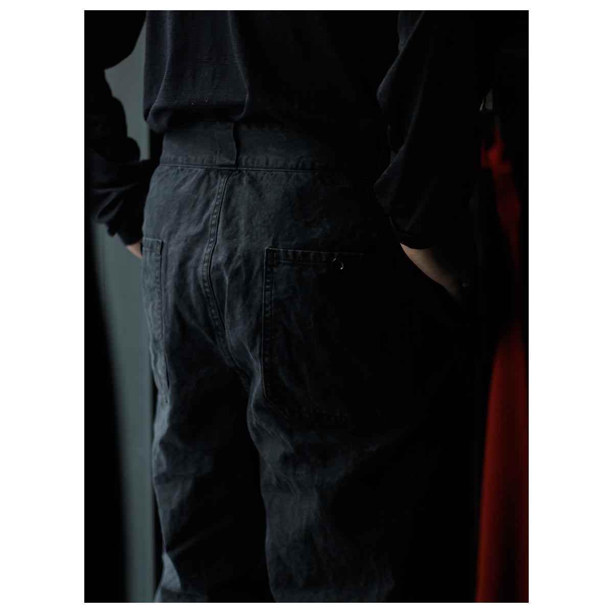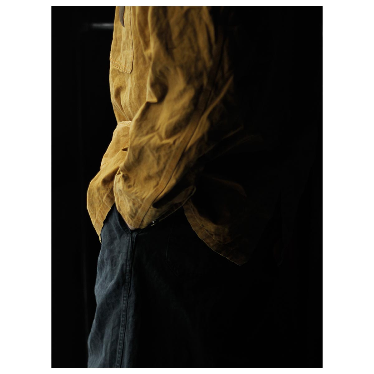 打ち込みのよいライトオンスのダック生地にパラフィン加工でコーティングした生地。さらにストーンバイオ加工などを施し、全体にムラ感とアタリを出しています。