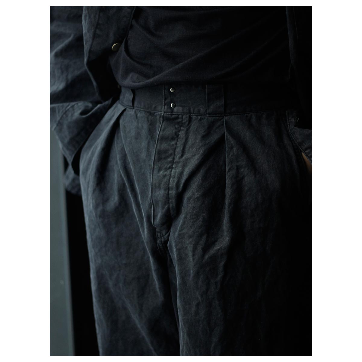 今季の始まりは2型。ワックスダック生地を用いた、チョアジャケットとワイドトラウザーです。