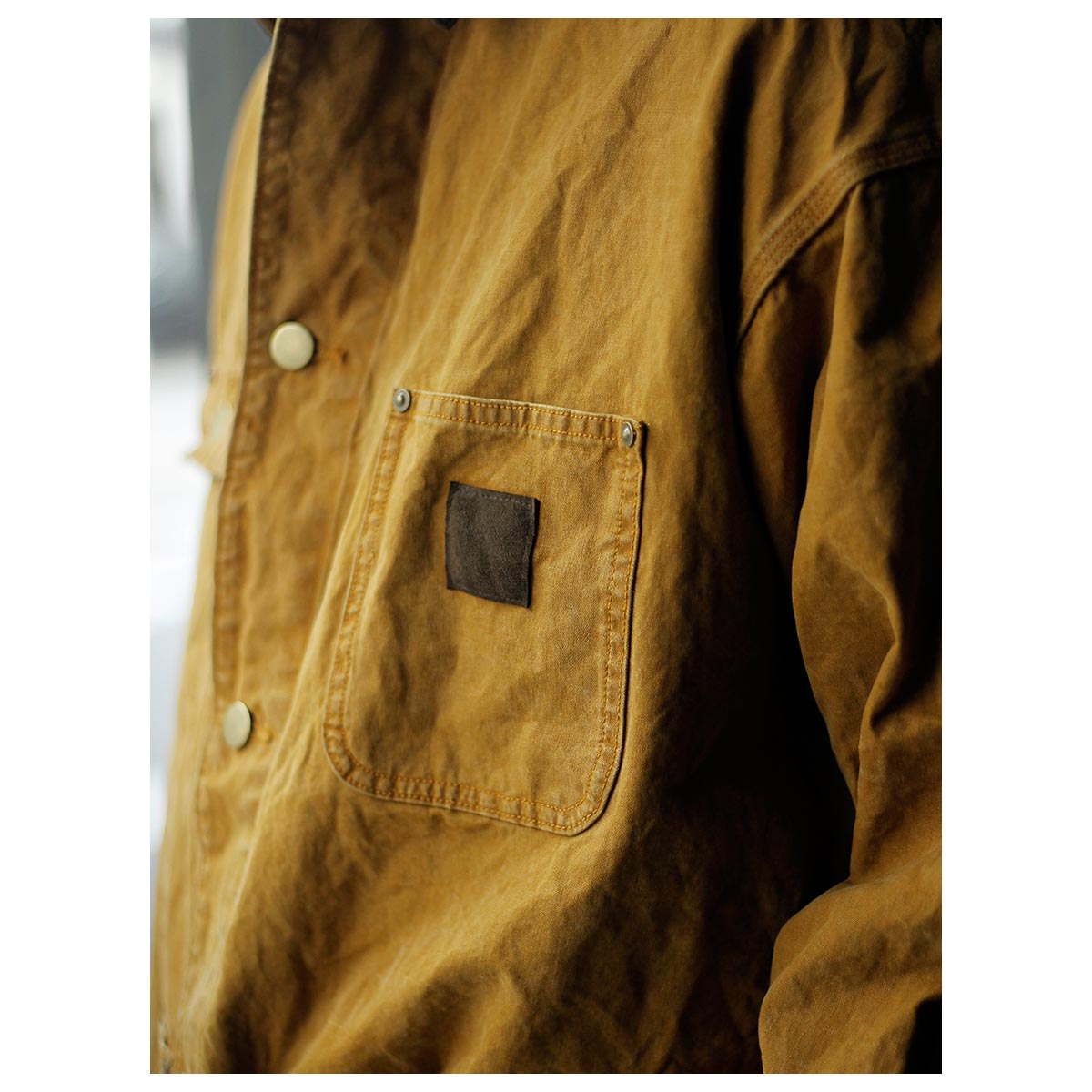 打ち込みのよいライトオンスのダック生地にパラフィン加工でコーティングし、さらにストーンバイオ加工などを施し、全体にムラ感とアタリを出しています。