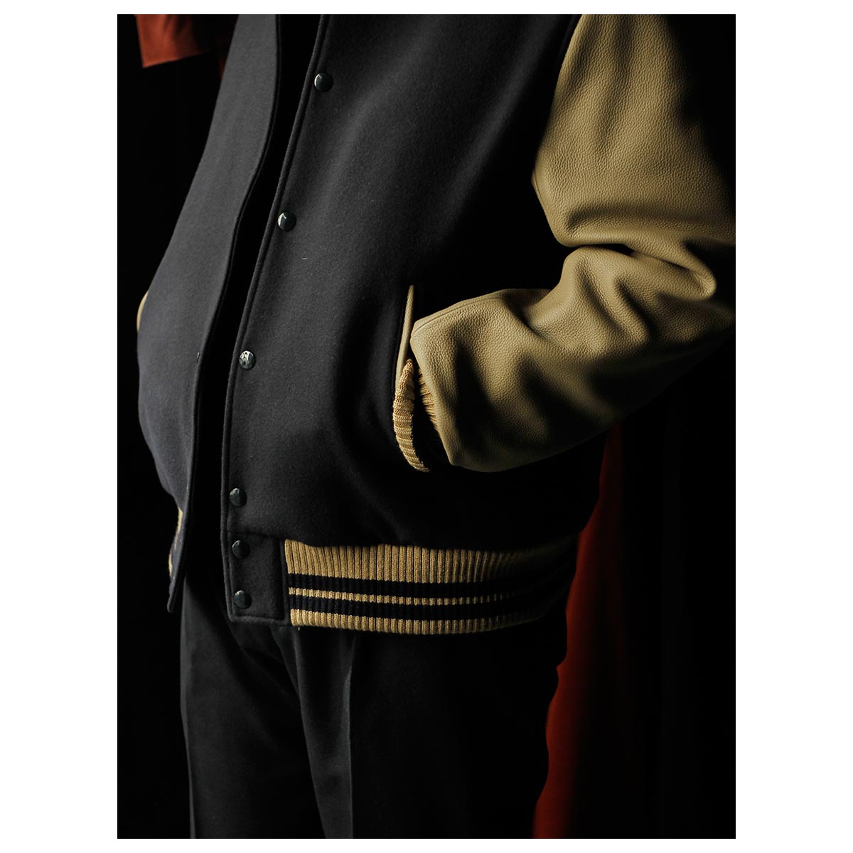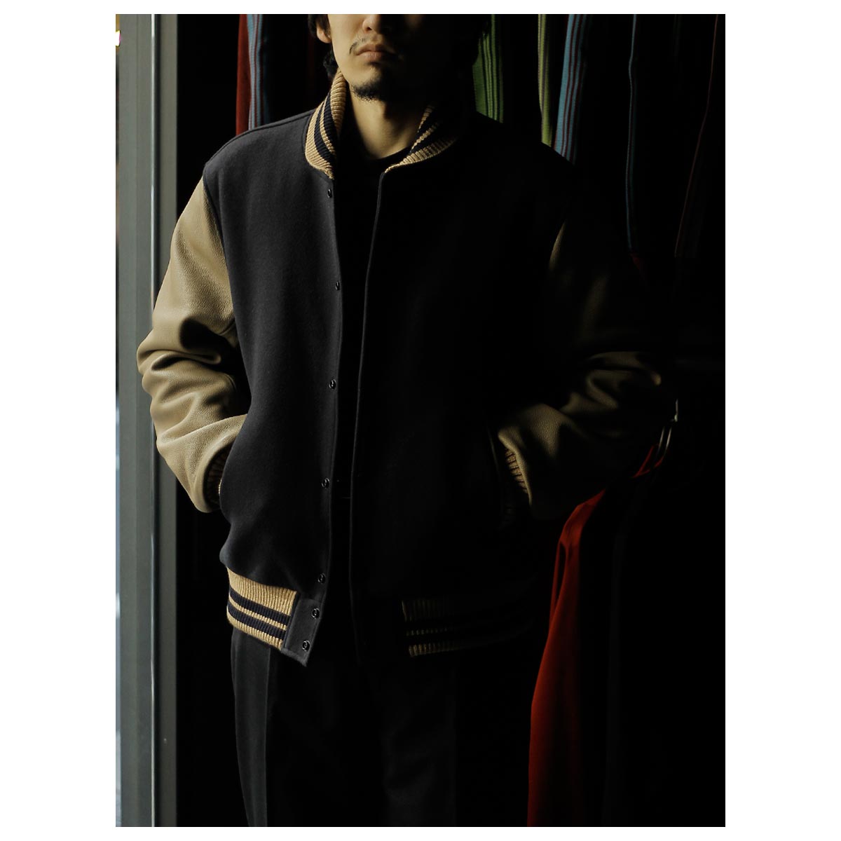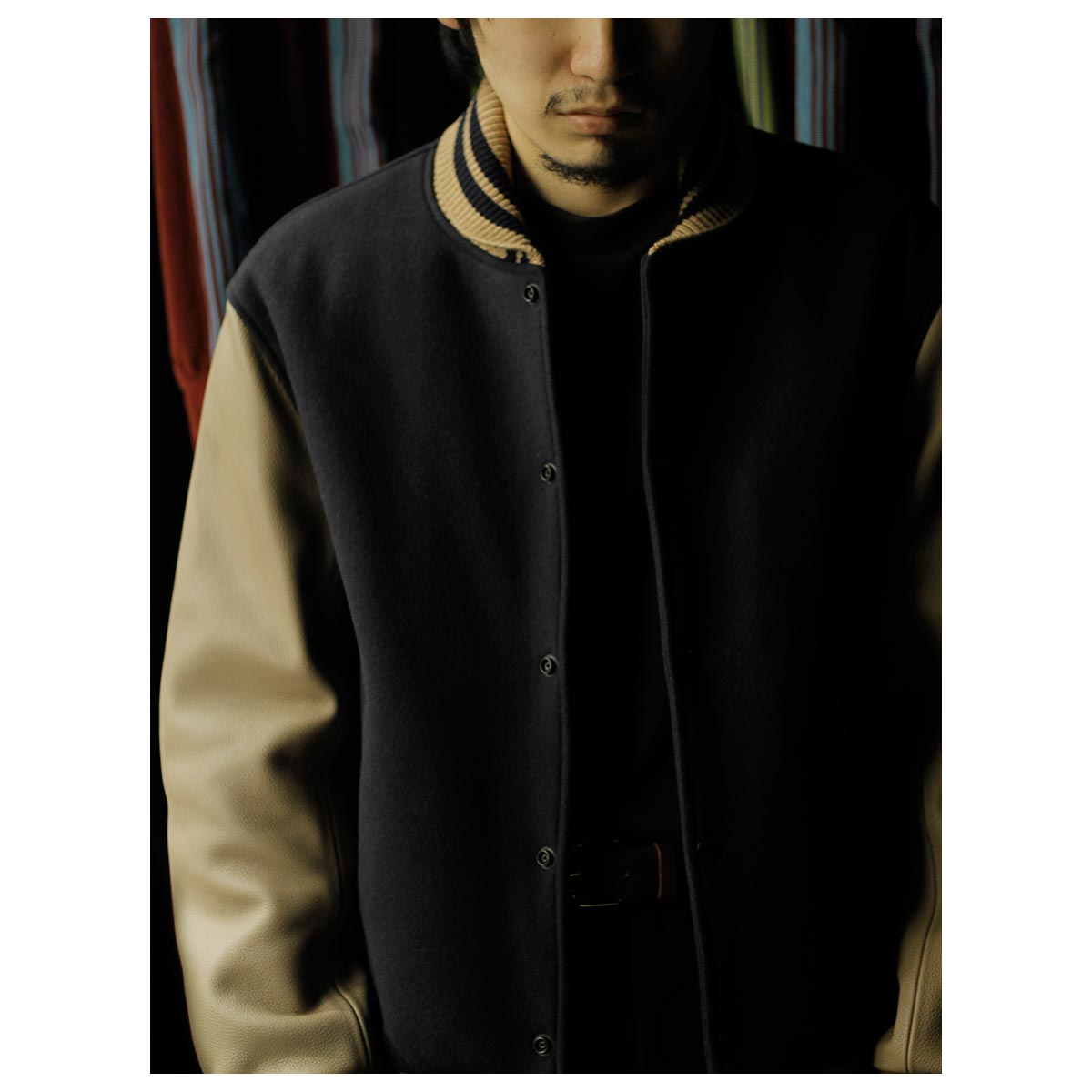適度なハリとコシがありつつソフトでしなやかな風合いと時間の経過にも色褪せしづらいレザーです。落ち着いた配色のライン入りリブが特徴のVARSITY JACKET。