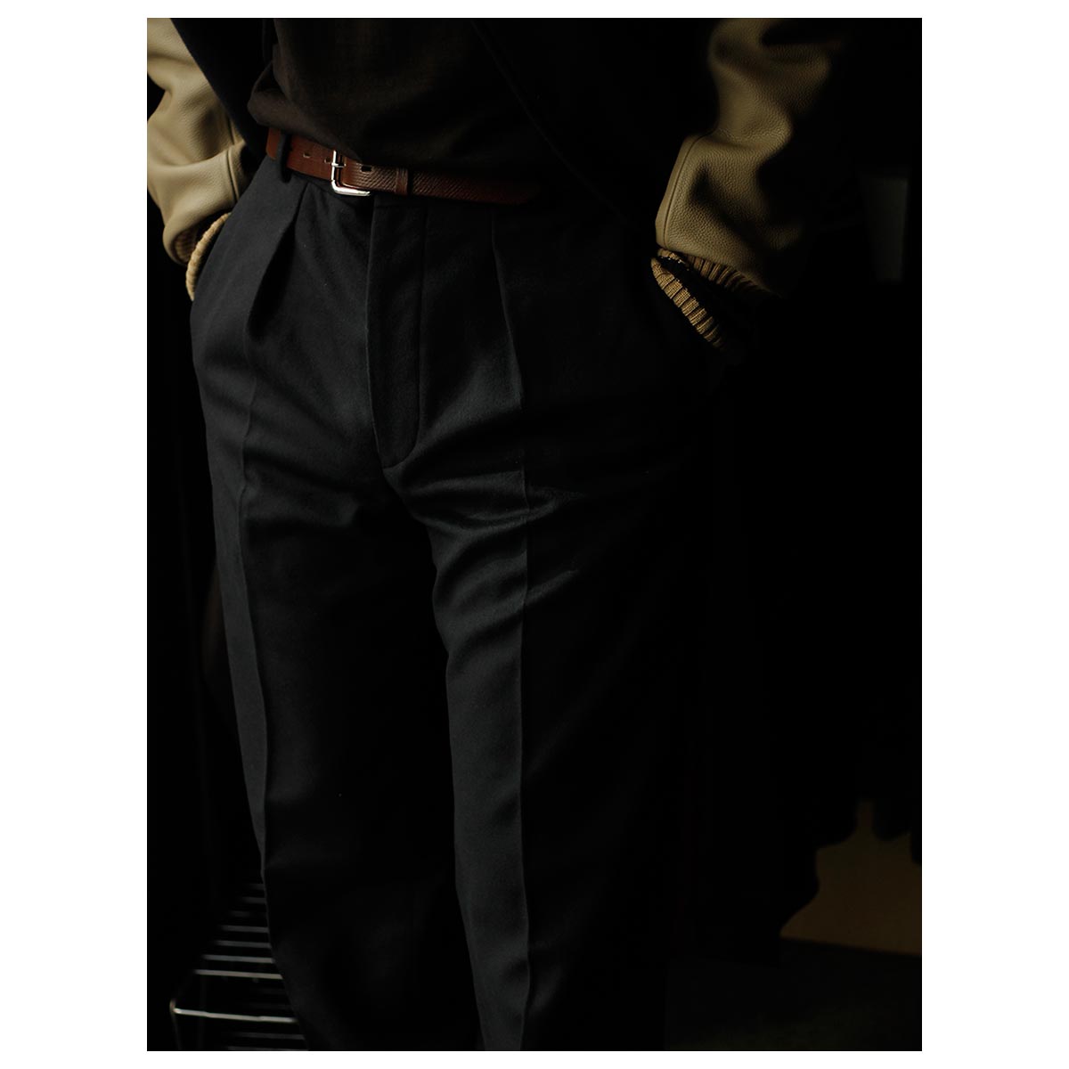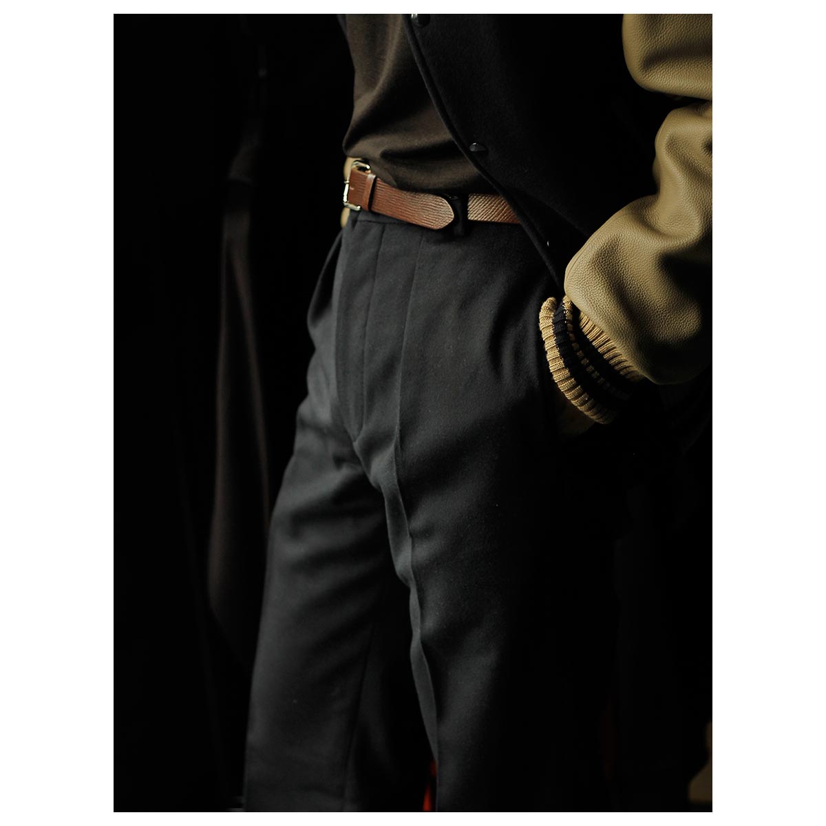 ボディの素材はタテ、ヨコ、共に上質なスーパー140’原料の1/16紡毛糸を使用し、従来のメルトンよりも長時間縮絨されてハードプレスで仕上げたメルトン。上質原料由来の控えめな光沢感と滑らかなタッチ、加工による独特なハリ感が特徴です。