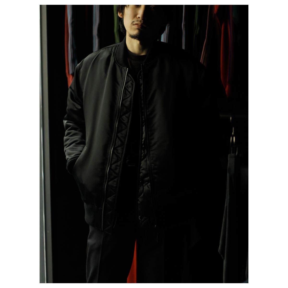 A面はナイロンツイルを使用したオーバーサイズのMA-1タイプのボマージャケット、B面はキルティング加工を施したポリエステルタフタのライナージャケットといった具合にタイプの異なるデザインを一体化させたフェイクレイヤードのジャケットです。特注したダブルスタッドのドットボタンによる開閉でA面B面それぞれ2ウェイの着方が可能な仕様となっています。