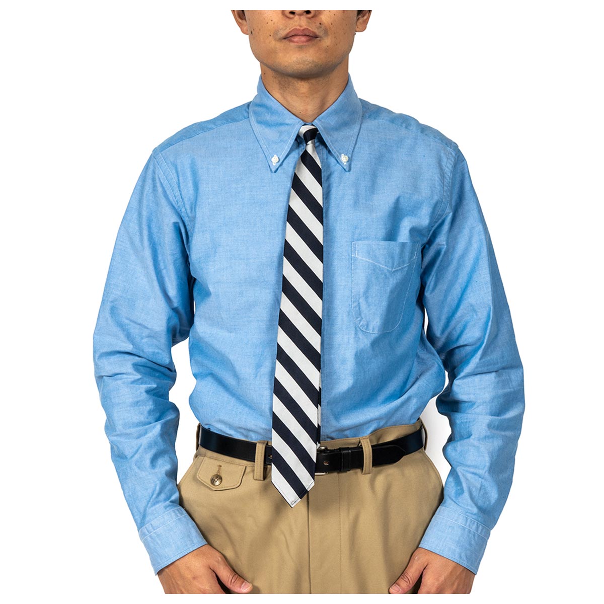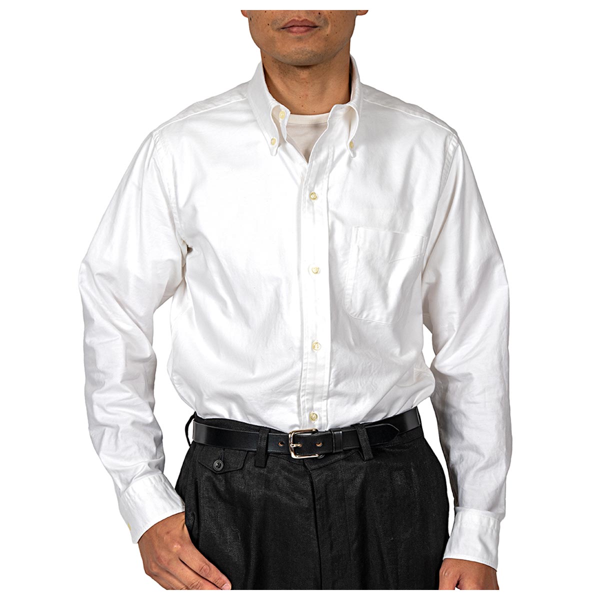この「本当はあまり見えないほうが良いT シャツが見えちゃう」が、なんともラフで良いのです。本来、ボタンダウンはアメリカントラッド。アメリカのオフィスや学校で着られたボタンダウンシャツが、古着で日本に着てカジュアルに転用され ていった。ボタンダウンシャツはカジュアルと、ドレスの合間の特殊な存在であることがわかります。