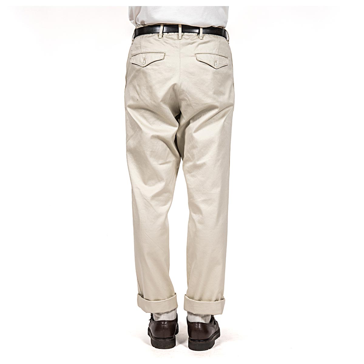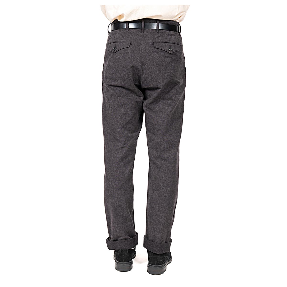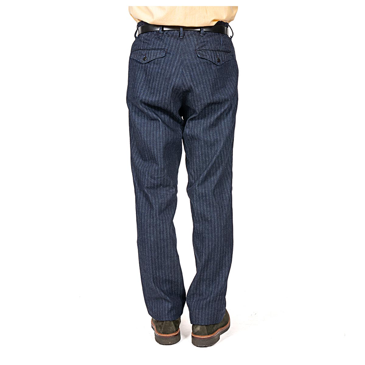 いわゆる「チノパン型」。 Regular/ 裾幅20 センチを、今までSlimで作ってきた仕様、後ろフラップポケット/ 後ろ中心割り縫いにを作ってみました。 後ろポケットが細玉や片玉だといかにも「チノパン」。軍チノに近い雰囲気。それに対し、後ろがフラップポケットになるだけで、ぐっと「トラウザーズ感」が増します。
