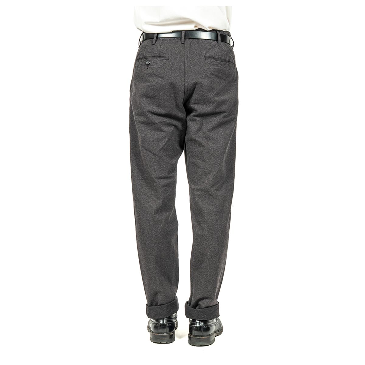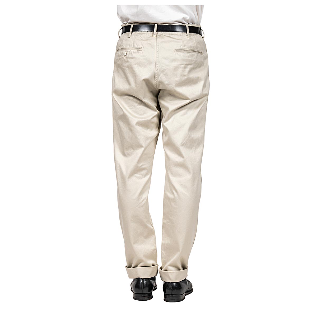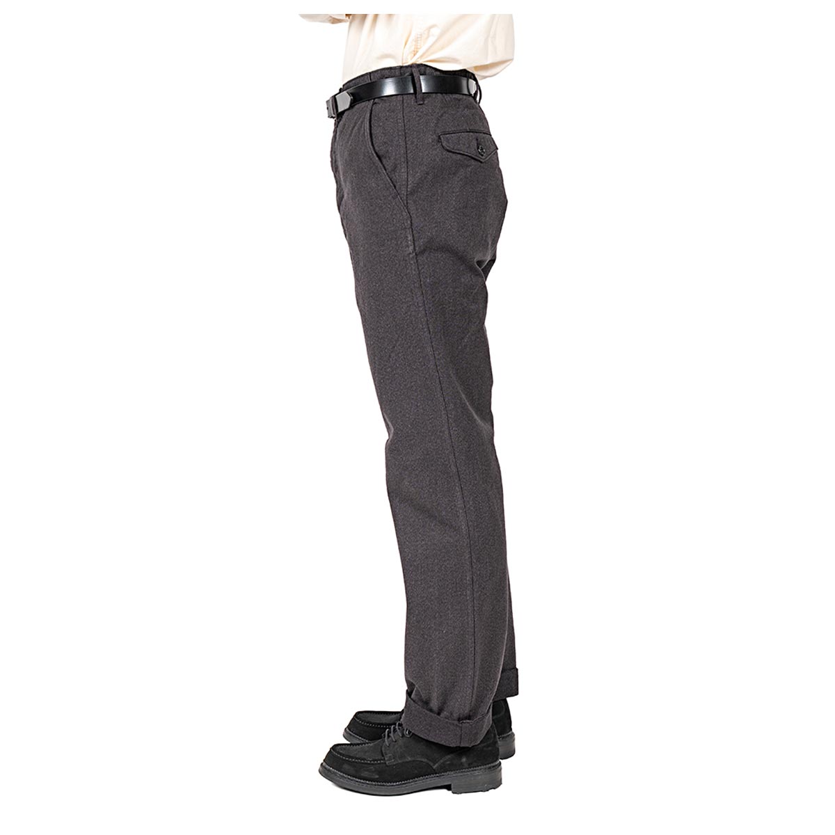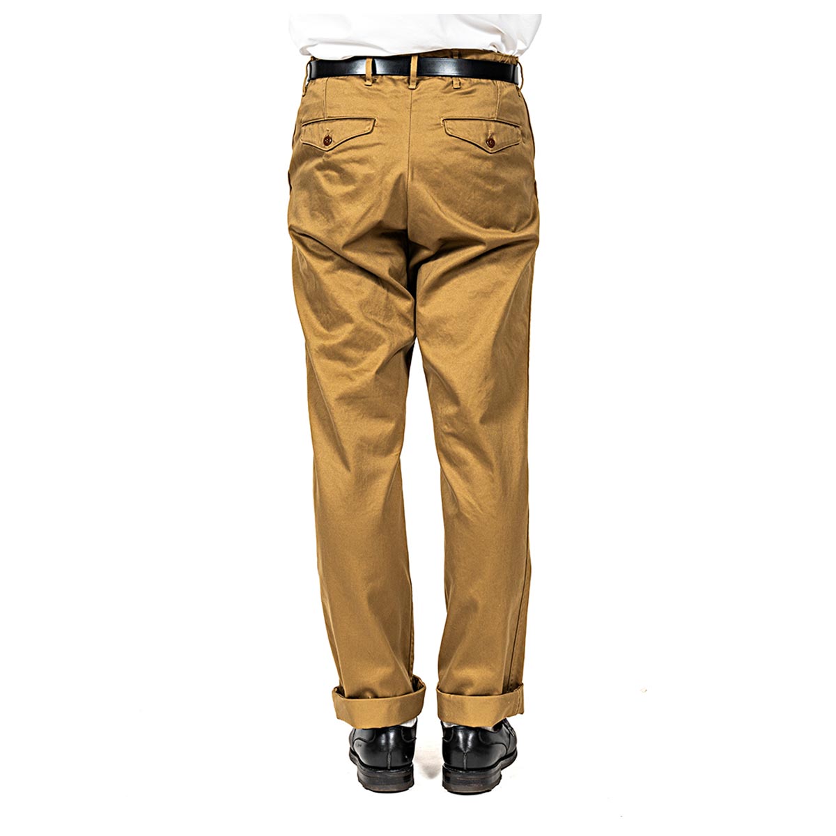 いわゆる「チノパン型」。 Regular/ 裾幅20 センチを、今までSlimで作ってきた仕様、後ろフラップポケット/ 後ろ中心割り縫いにを作ってみました。 後ろポケットが細玉や片玉だといかにも「チノパン」。軍チノに近い雰囲気。それに対し、後ろがフラップポケットになるだけで、ぐっと「トラウザーズ感」が増します。
