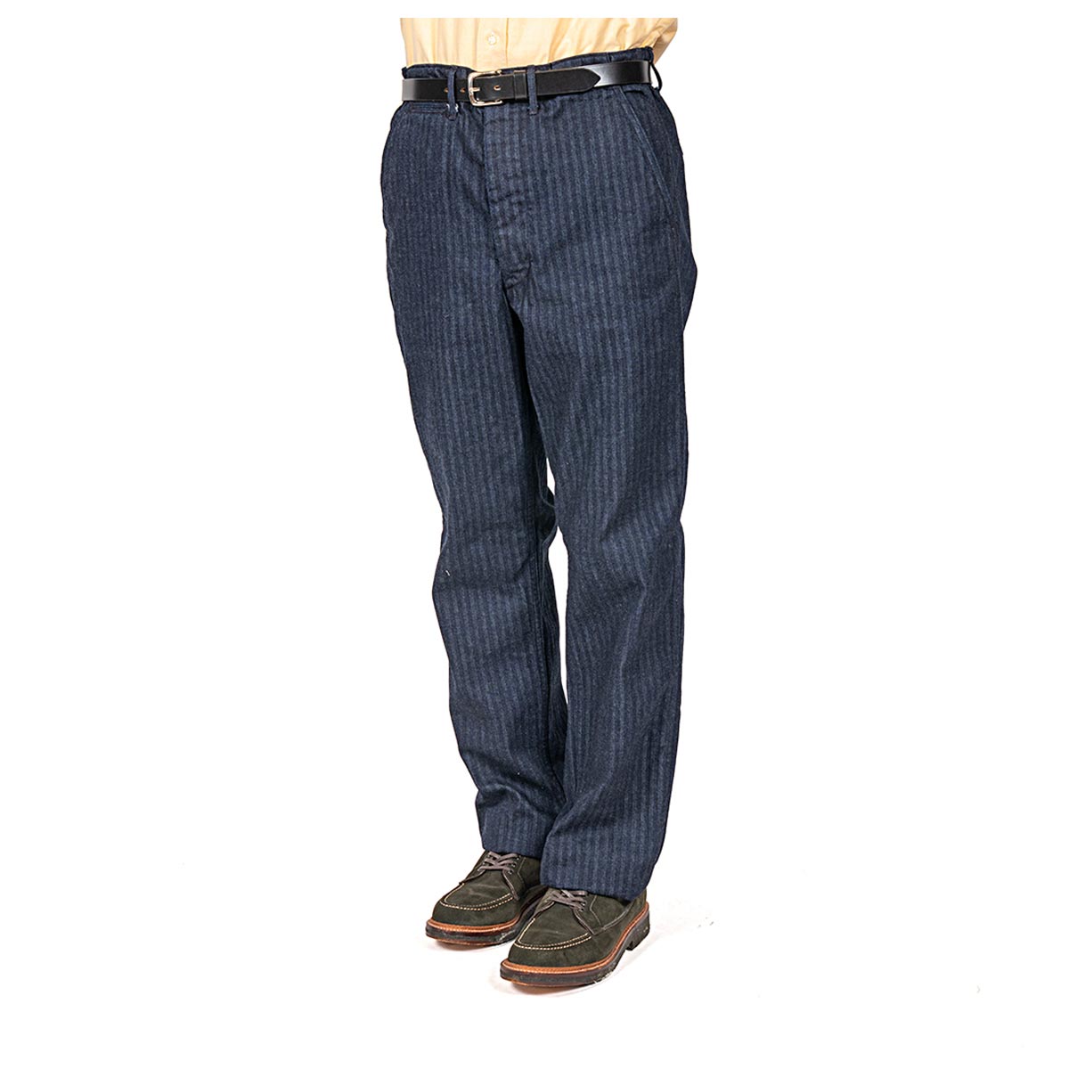 インディゴヘリンボン、タテが7 番のインディゴ染。ヨコが20 番の生成り。 タテの色糸が太くはっきり見えるので、「インディゴヘリンボン」にしては、柄がはっきり見えない。 着こんで洗いこむと、徐々に柄がわかってくる、「育つヘリンボン」。10 オンスほどですが、チノよりしなやか。 ※インディゴなので色移りはします。白物のシャツと合わせるのはご注意ください。