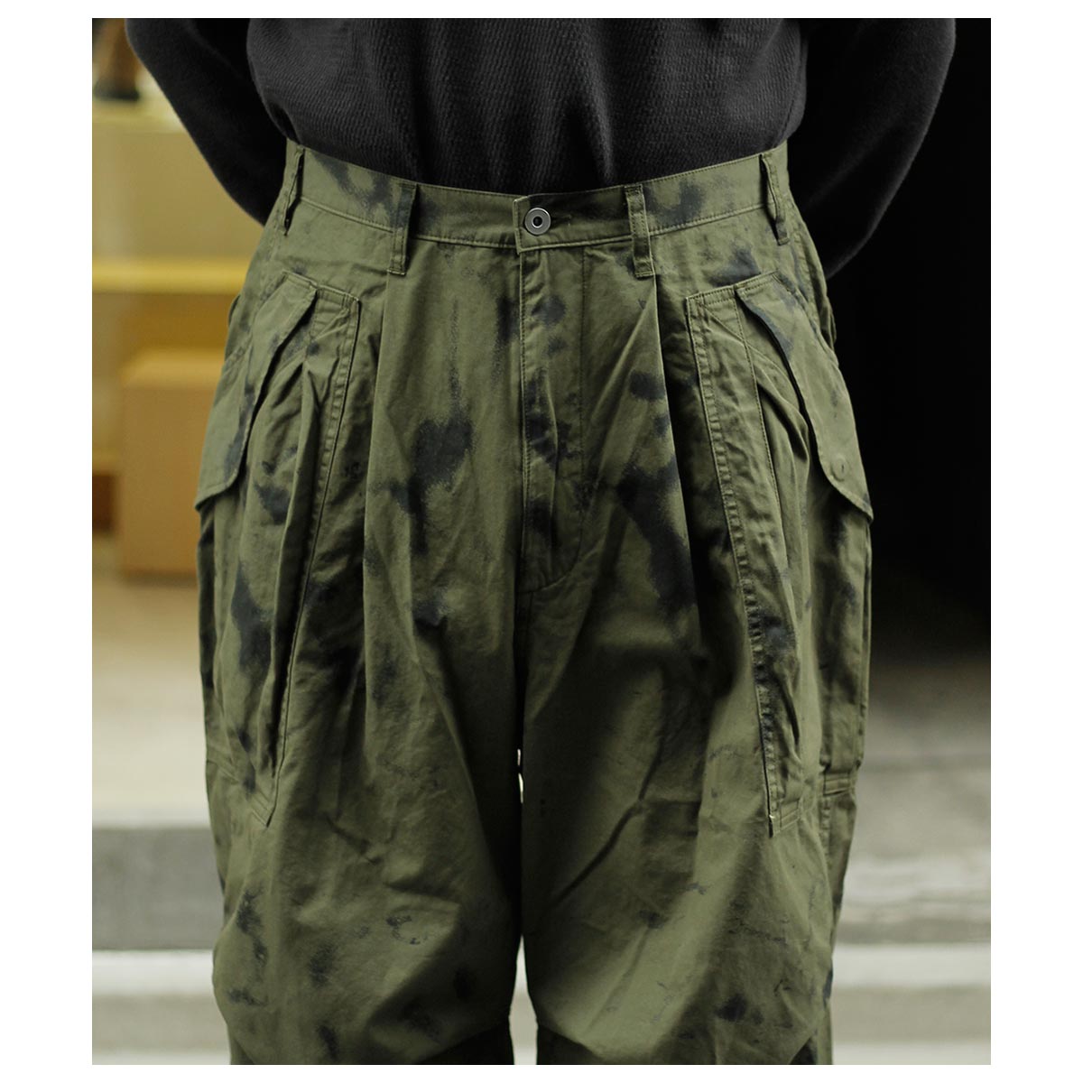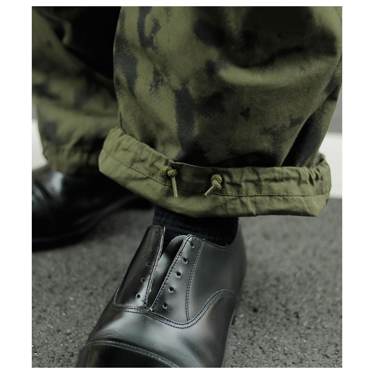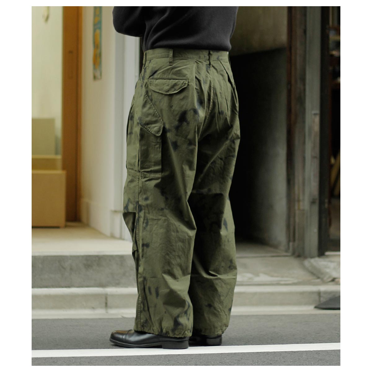 グランクからカーゴパンツ。 新定番となるグランクらしさ溢れる1本。米軍のM51を彷彿とさせる極太のシルエットに、スナップボタンのフラップのついた大振りのサイドポケットが特徴です。また裾にはドローコードがついており、シルエットに変化を付ける事が可能。 生地は60年代前半のジャングルファティーグの生地をリプロしたオリジナルポプリン。捺染の技法を活かし作られており、一点一点異なる表情をみせる特殊なカモ柄です。どちらのカラーも同色をブラッシュしたような柄になっています。