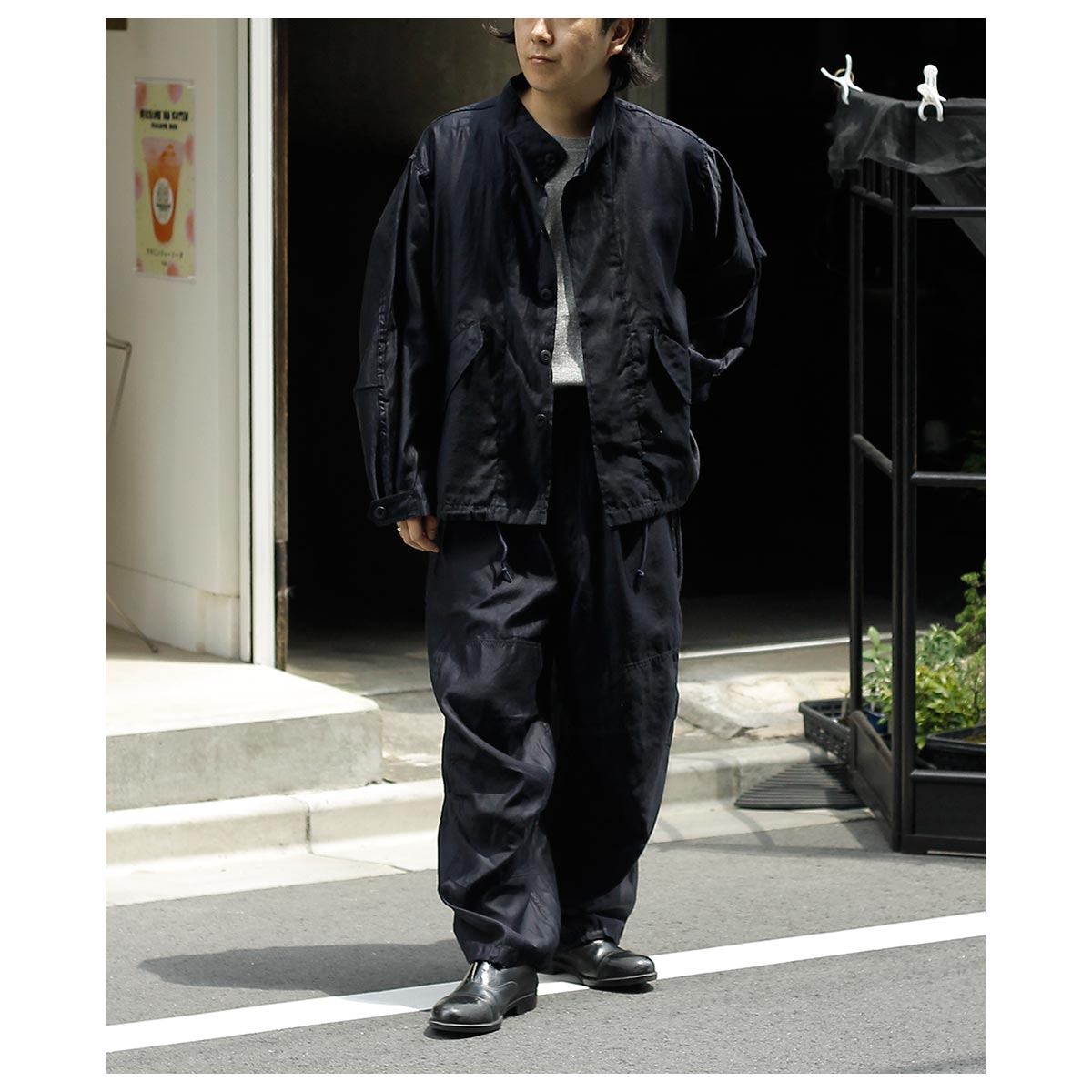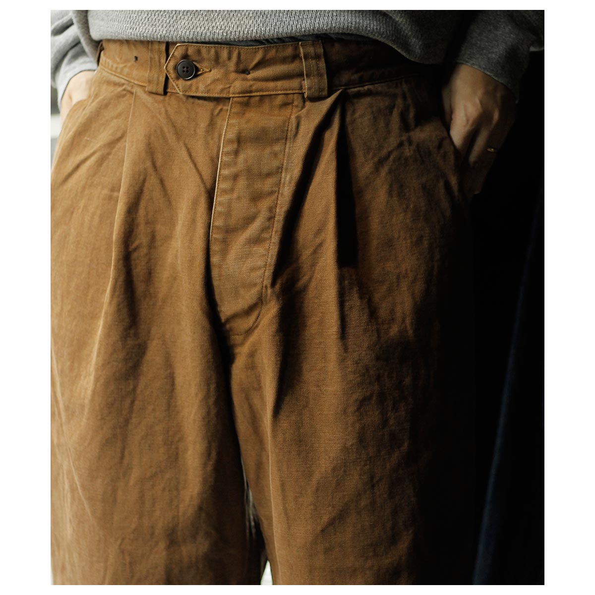 グランク、25AWの新型Railway pants。 50年代のフランスのレイルロードパンツをグランクらしくモディファイドしています。 ディテールはそのままに、ワイドテーパードの穿きやすいシルエット。 アウトなワンタックで、バックシルエットはシンチバックが付いたデザインに。 内側にはサスペンダーボタンやループを装備しています。 60年代ワークウェアの生地をリプロダクトした12オンスのオリジナルオックスフォード生地を採用しています。生地にフシが入りやすいようにヘンプにロウを染み込ませて織っています。 硫化染めした後にバイオウォッシュを施し、奥行きのある表情になっています。 今季のグランクの大本命の1本。 『名作』になりそうです。