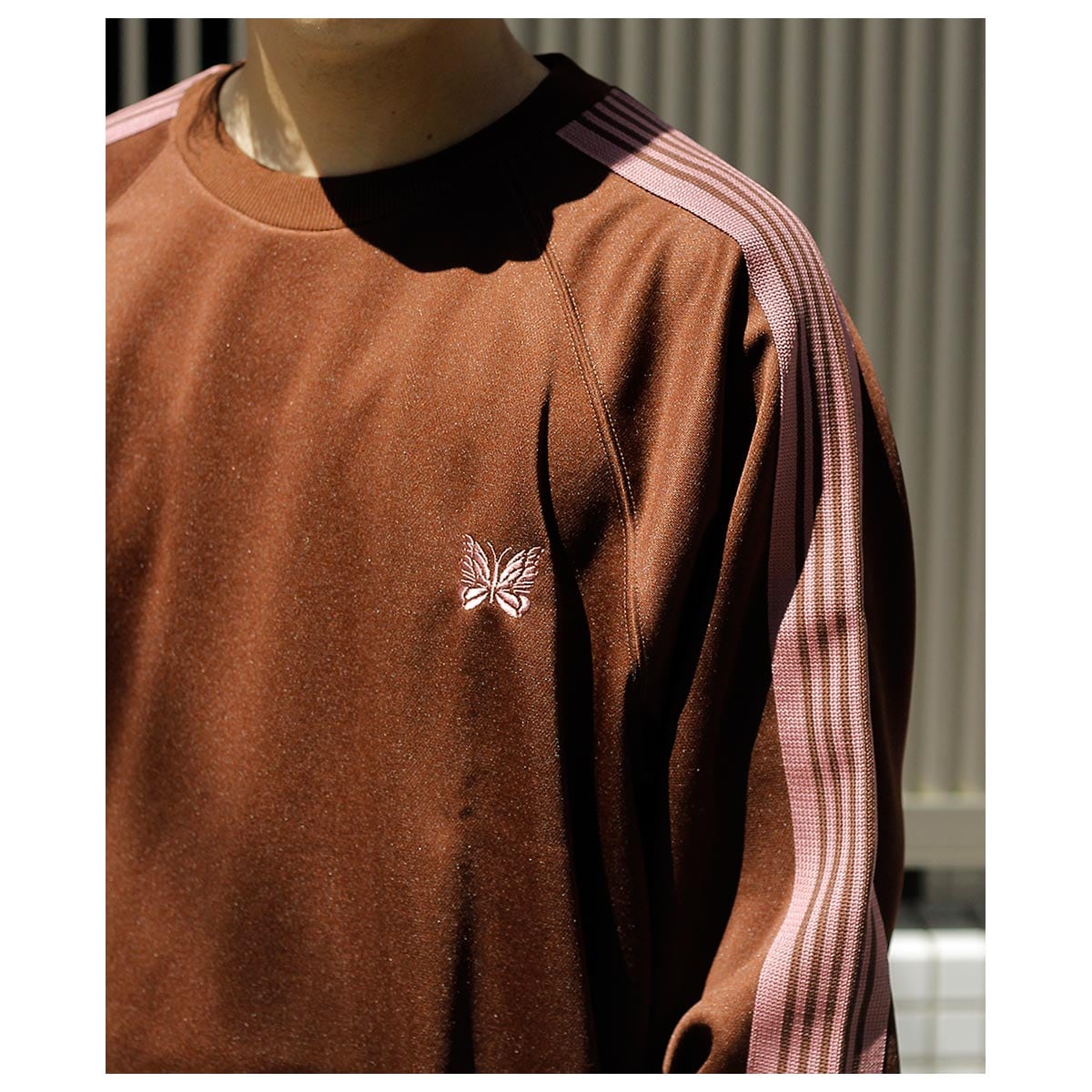 〈NEEDLES〉定番のトラッククルーネックシャツ。今シーズンはブラウン、グリーン、レッドの全3色です。伸縮性や通気性に富んだポリエステルジャージー素材を使用した快適性に優れた一着は、独特の配色や刺繍デザインなど、一般的なスポーツウェアとは一線を画した華やかなファッション性が魅力となっています。