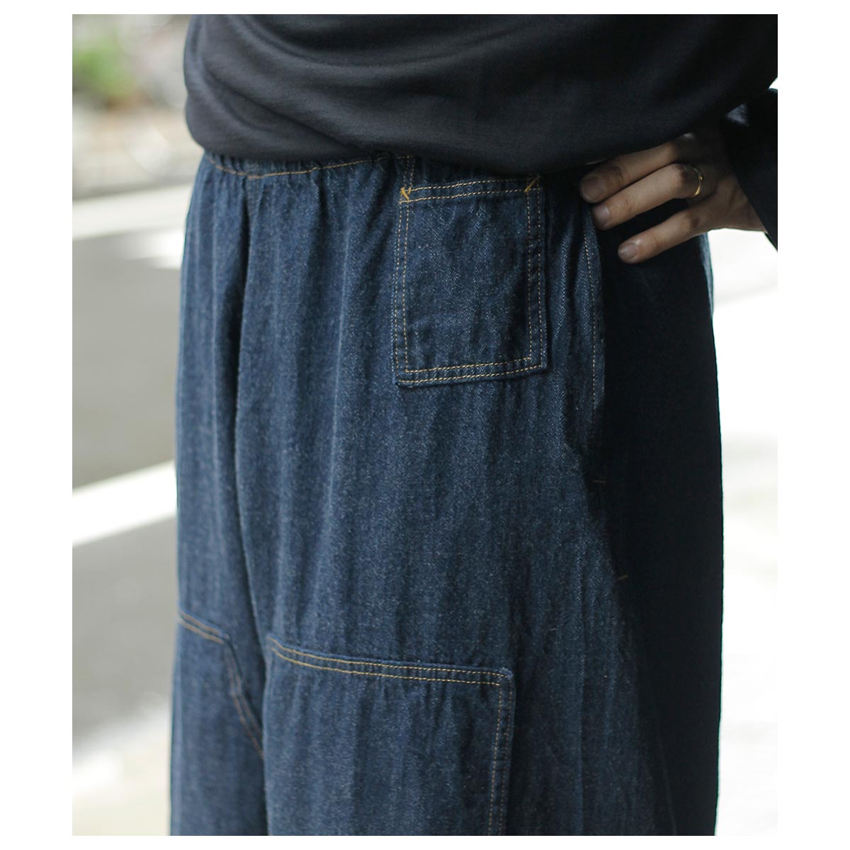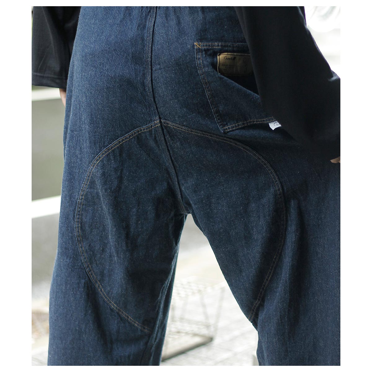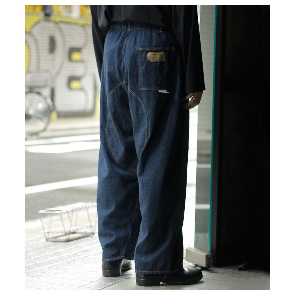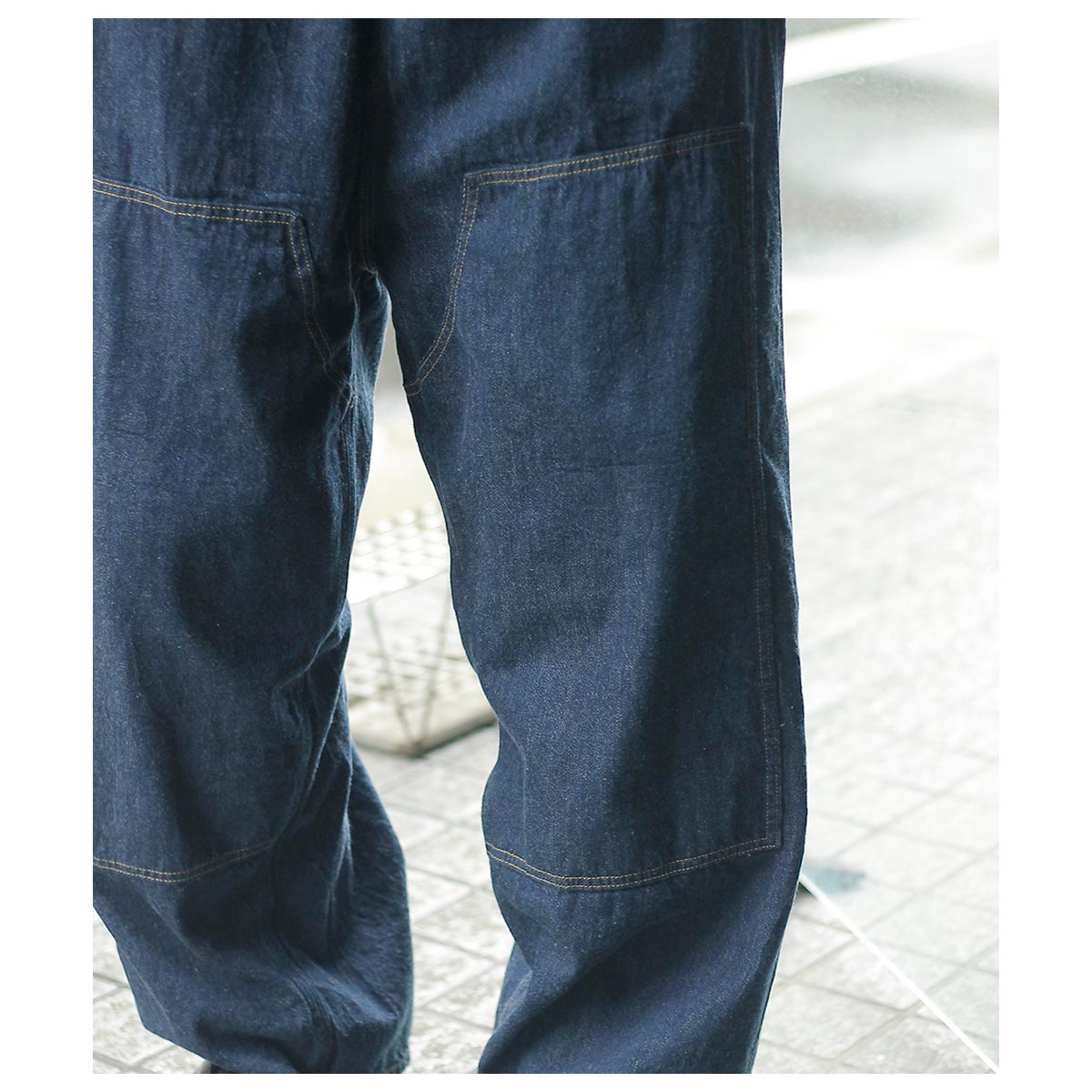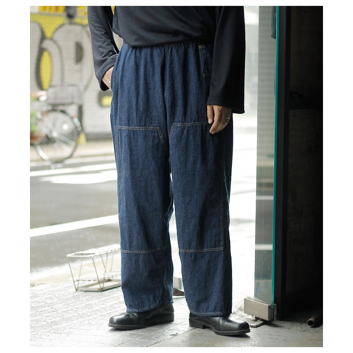 ウエストはゴムウエストとなっておりドローストリングの仕様に。膝にはもう一枚デニム配してダブルニーの仕様となり、ヒップ部分にもデニムを配して、クラシカルなワーク感をプラス。