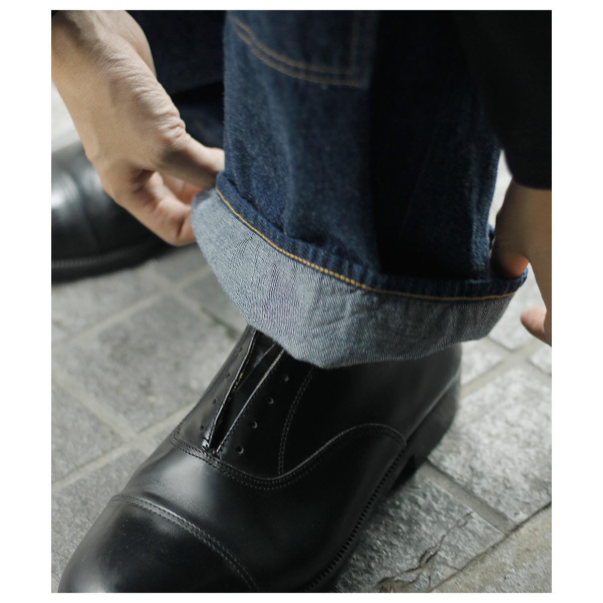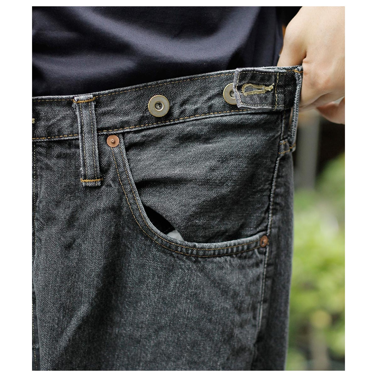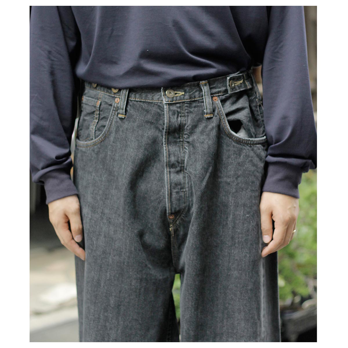 EDWIN「505」シリーズで使用のブラックデニムを採用。 ハリのある生地とブラックデニムらしい始まりの光沢感があり、インディゴとは違った締まりがあります。淡い色落ちが期待できます。