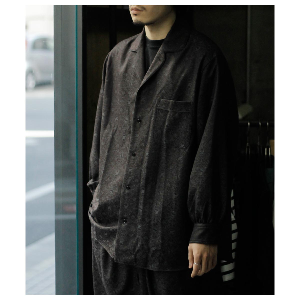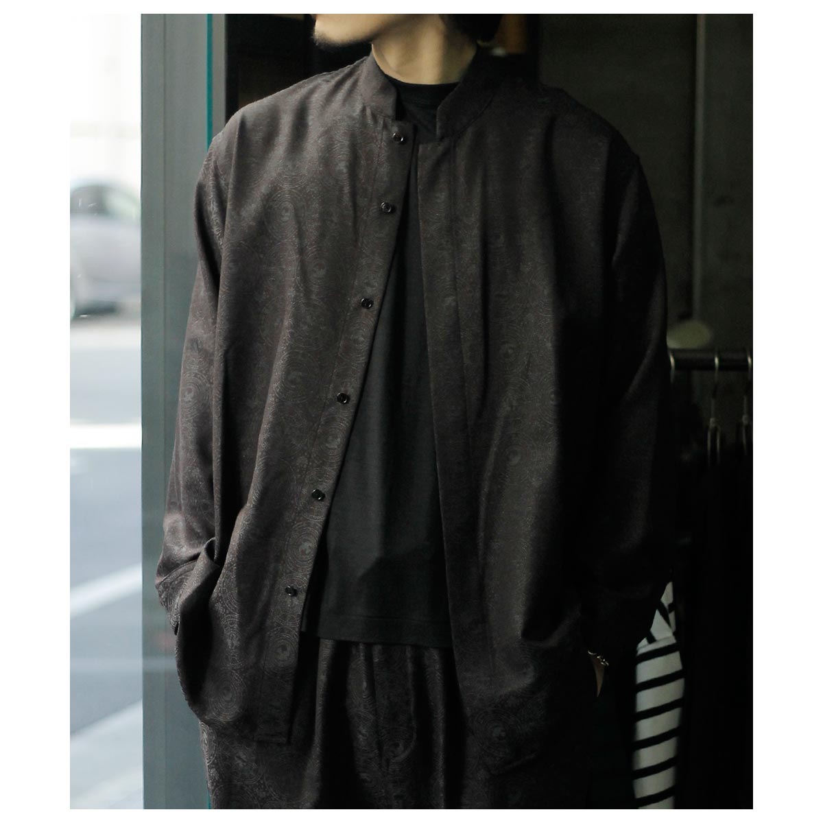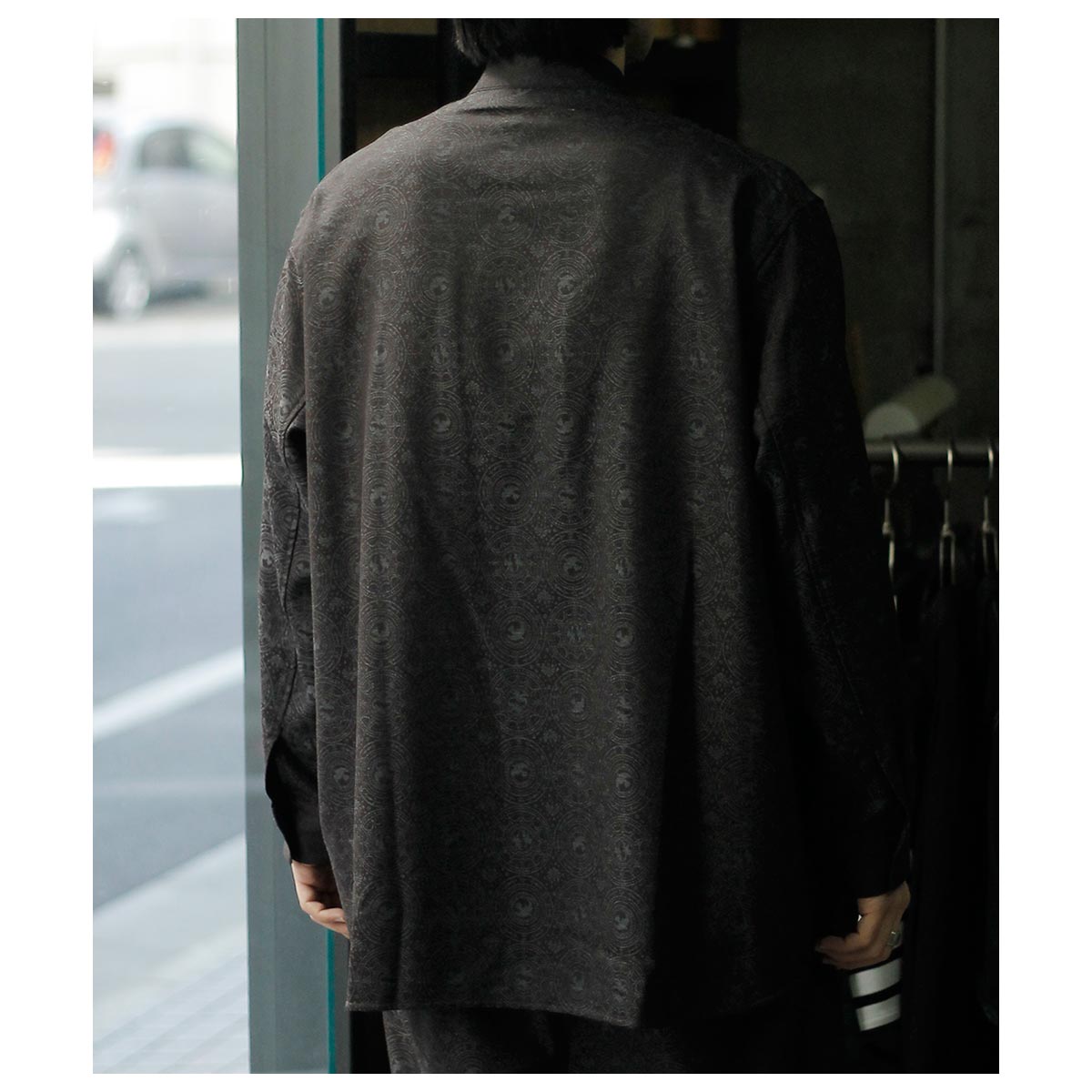肩から裾まで緩やかなラウンドを描くカッティングは、動いた時に美しいドレープを生み出し、シャドージャガードの陰影をより深く見せてくれます。 オーバーサイズながら、身頃の分量やカーブのバランスを細かく調整し、だらしなくならず、テーラードジャケットのように凛とした佇まいを感じさせる仕上がりです。 生地の陰影とフォルムが響き合い、光の中で静かに華やぐ。 そんな、シャツでありながらテーラリングの思想を宿したnonnotteらしい一枚です。