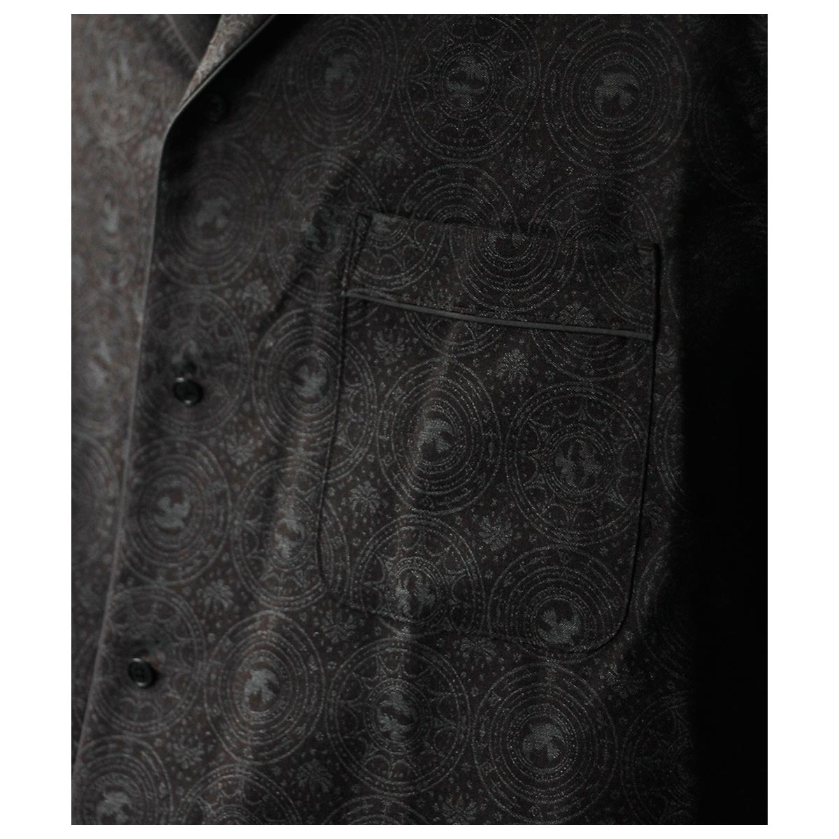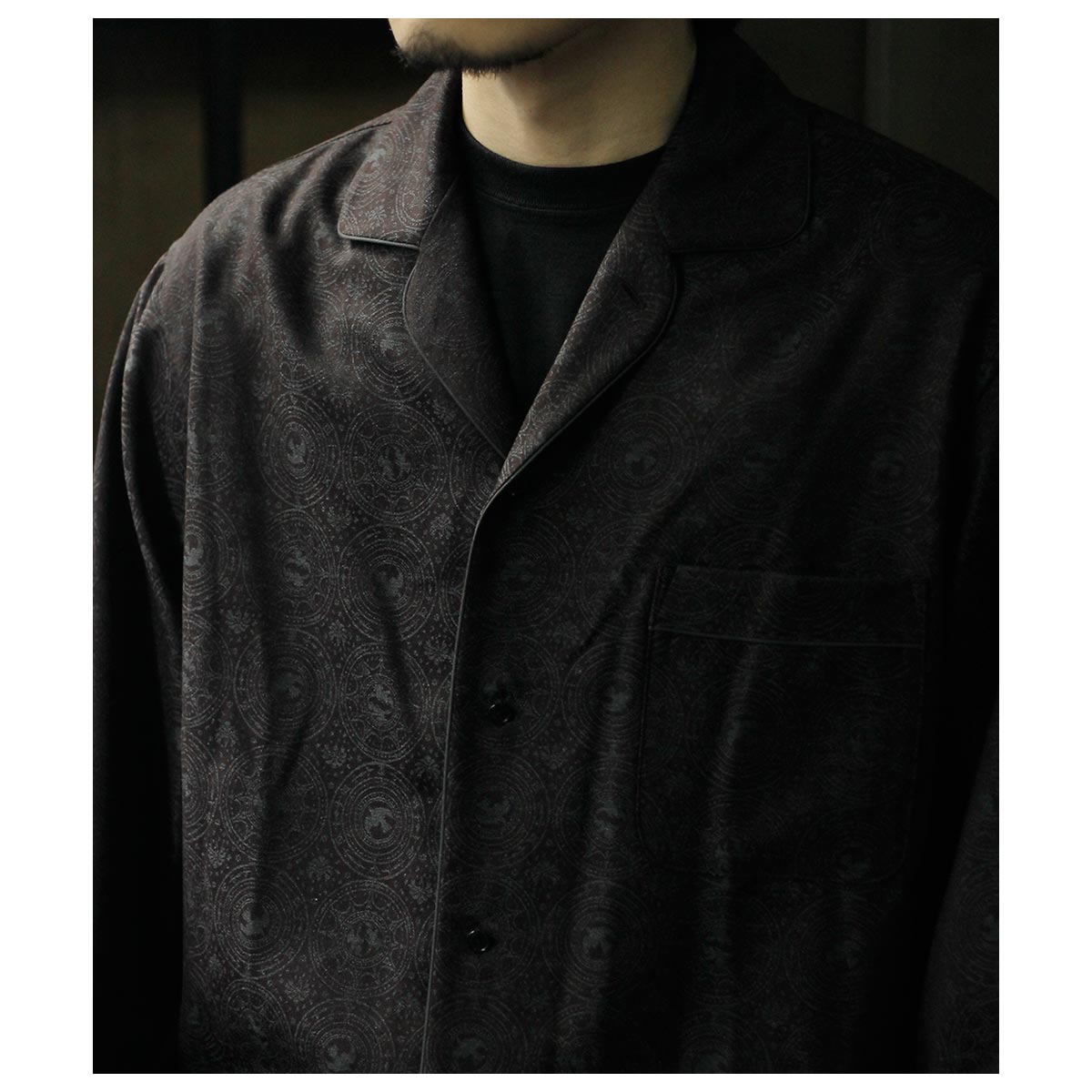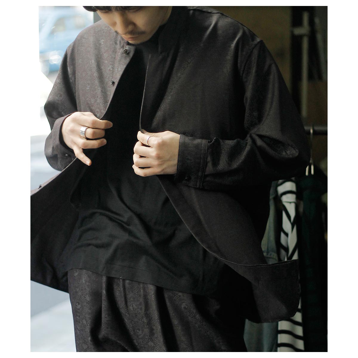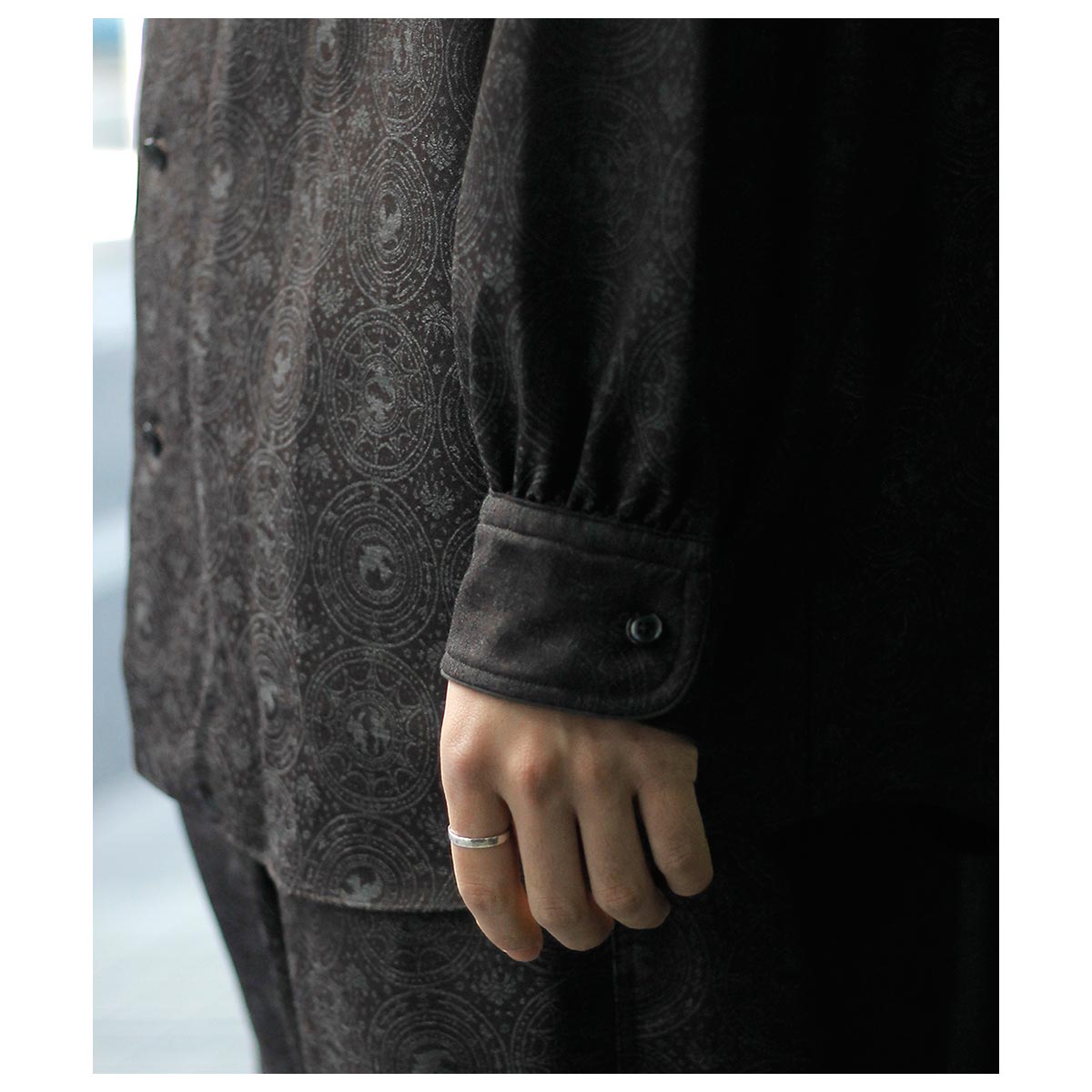肩から裾まで緩やかなラウンドを描くカッティングは、動いた時に美しいドレープを生み出し、シャドージャガードの陰影をより深く見せてくれます。 オーバーサイズながら、身頃の分量やカーブのバランスを細かく調整し、だらしなくならず、テーラードジャケットのように凛とした佇まいを感じさせる仕上がりです。 生地の陰影とフォルムが響き合い、光の中で静かに華やぐ。 そんな、シャツでありながらテーラリングの思想を宿したnonnotteらしい一枚です。