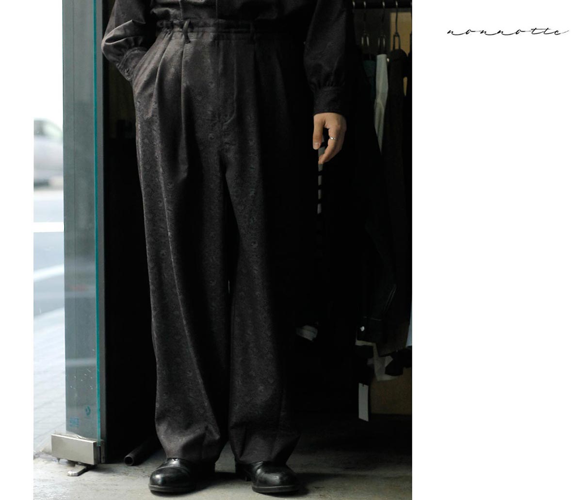 軽やかさを持ちながら、通年で着られる汎用性にあります。 Super140’ウールのしなやかな質感は、季節を問わず肌に心地よく馴染み、長いシーズンにわたって活躍します。 一枚でエレガントに、そして実用的に。 nonnotteが提案する、静かな華やぎを宿したジャガードウールです。