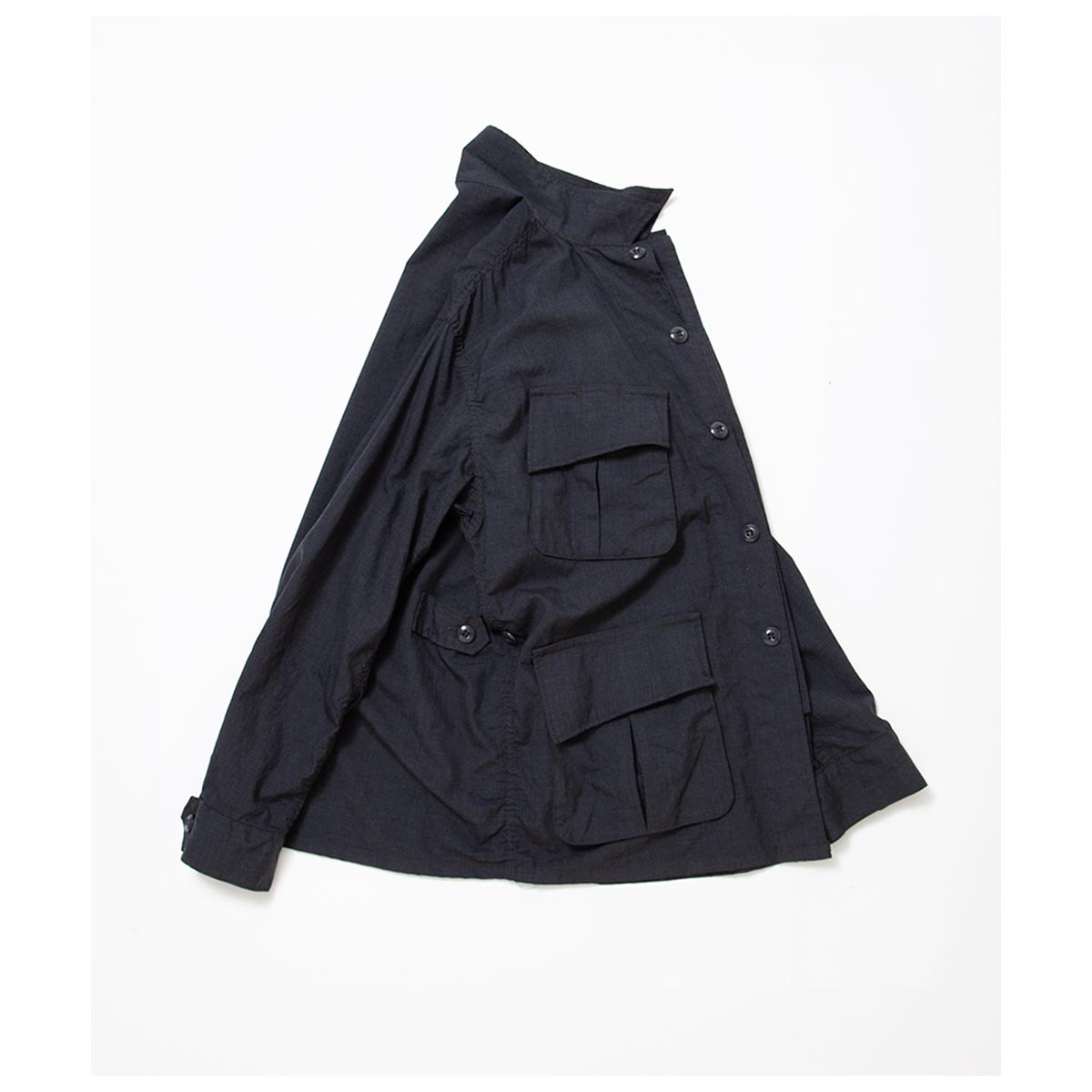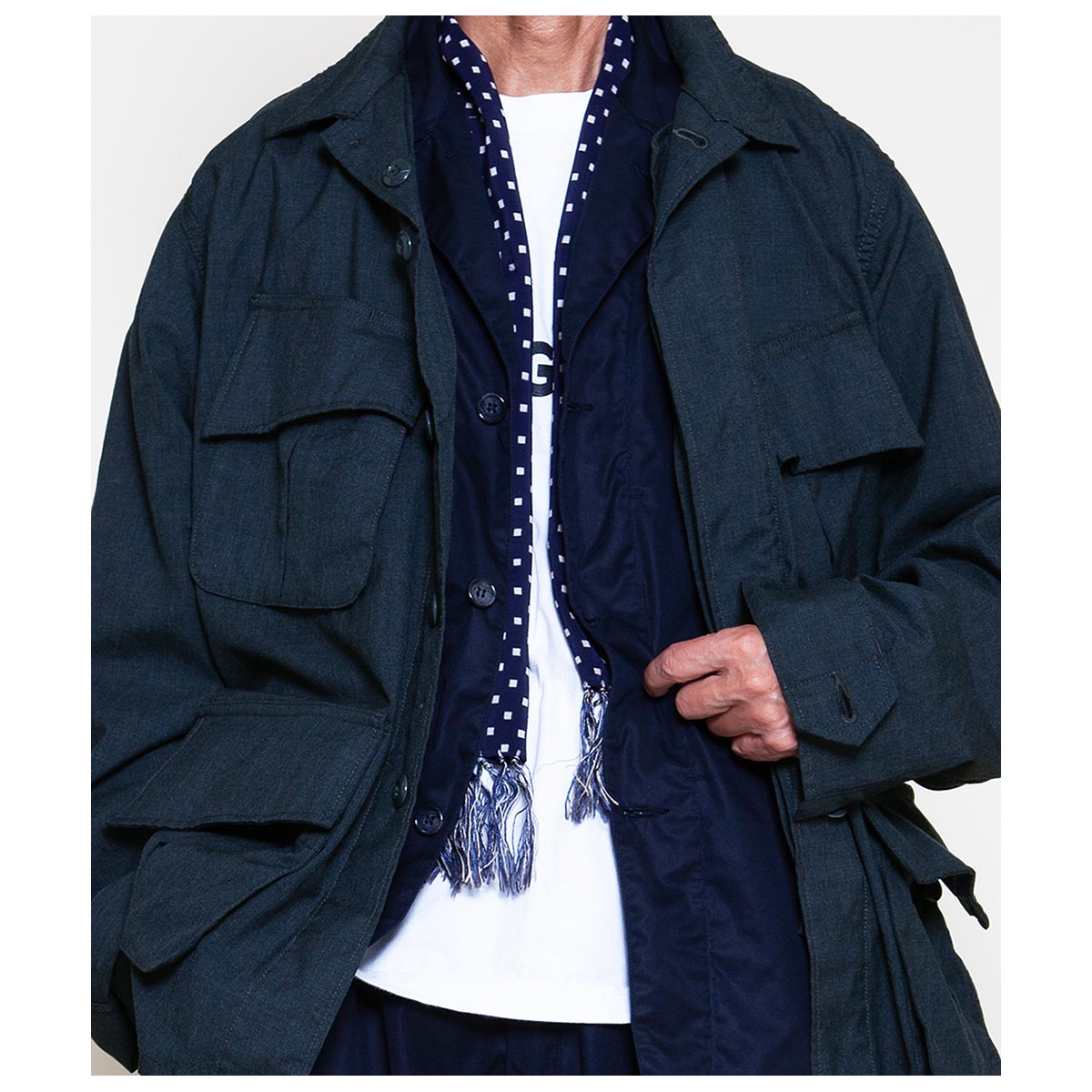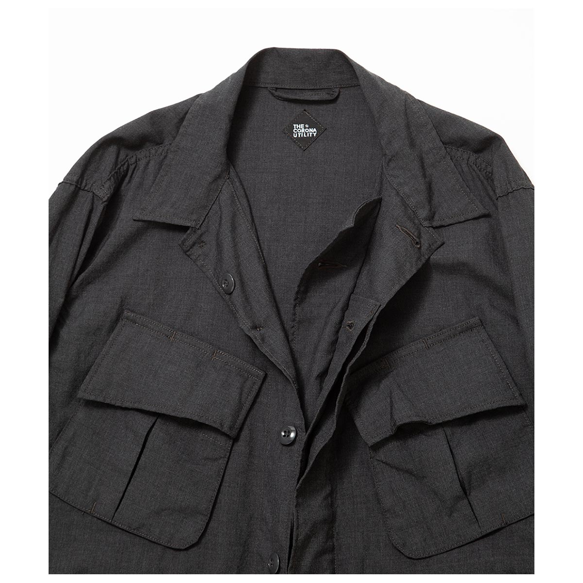 1960 年代のジャングルファティーグジャケットをオマージュしたCORONA ミリタリーコレクションのフラッグシップアイテムです。 ベトナム戦争で大量に投入されたB.D.U ジャケットを基にしており、斜めに角度のついた胸ポケットや独特のポケット形状が特徴です。 CORONA・JUNGLE JACKET は、60 年代のオリジナルの特徴を継承しつつも、衿など細かいパーツに変更を加え、ワークウエアのようなゆったりとしたサイズ感を取り入れ、現代のスタイルと機能性を融合させています。