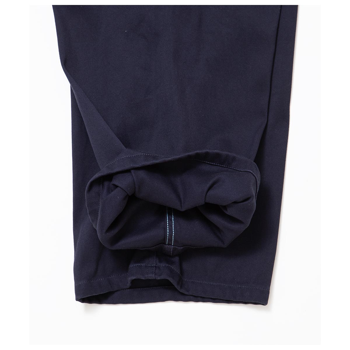 U.S. NAVYの甲板作業用ワークパンツにインスパイアされたアイテムです。 サイドシームのない太めのセーラーパンツシルエットが特徴。 テーパードを一切入れず、極太のバギーシルエットを採用。セーラーパンツ特有の裾広がりなフレアシルエットがとても新鮮です。 また、前後のパッチポケットは隙間なくぴったりと並び、低めの位置に配置されているため、手が入れやすい構造になっています。