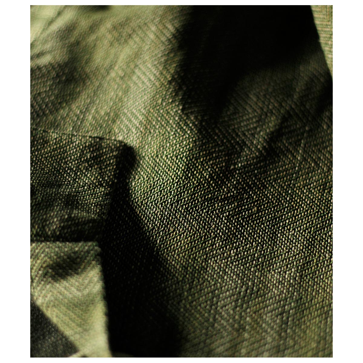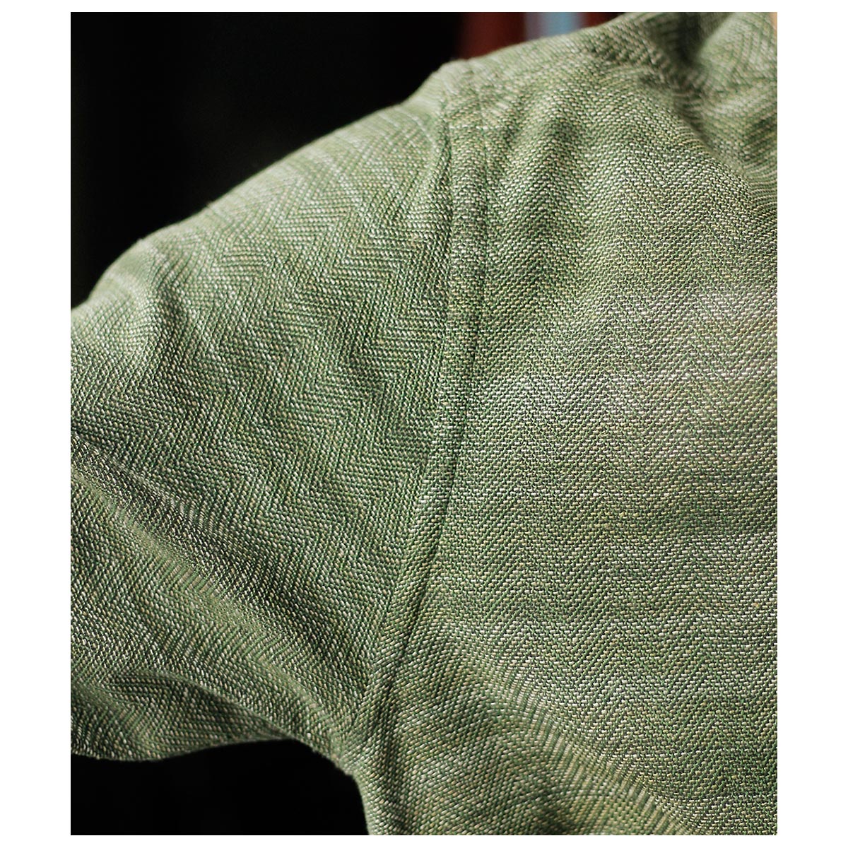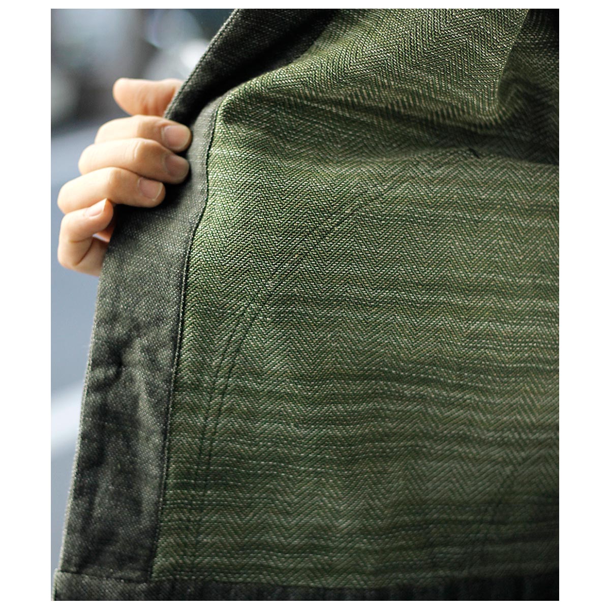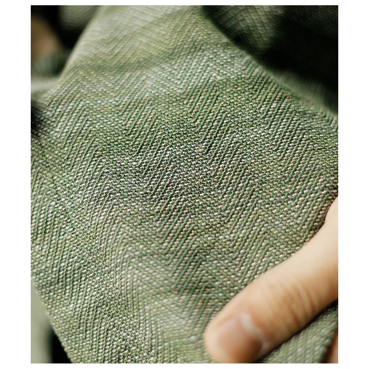 チャコールTOPのコットンと色鮮やかなグリーンのラミーTOPを経糸に配置し、生成り~カーキまで4階調くらいあるシルクの絣糸を緯糸に配置。大柄のヘリンボーンを3/1綾組織で森の隙間から見える光を表現しました。また絣の緯糸が多く見える裏面も色彩豊かで両面色を採用しました。