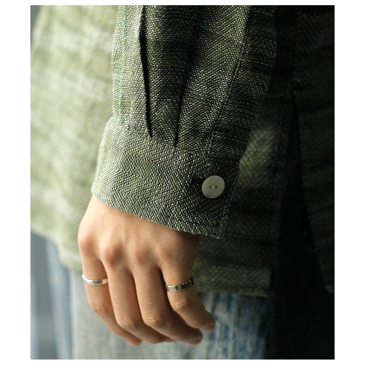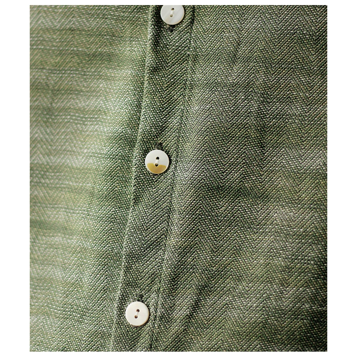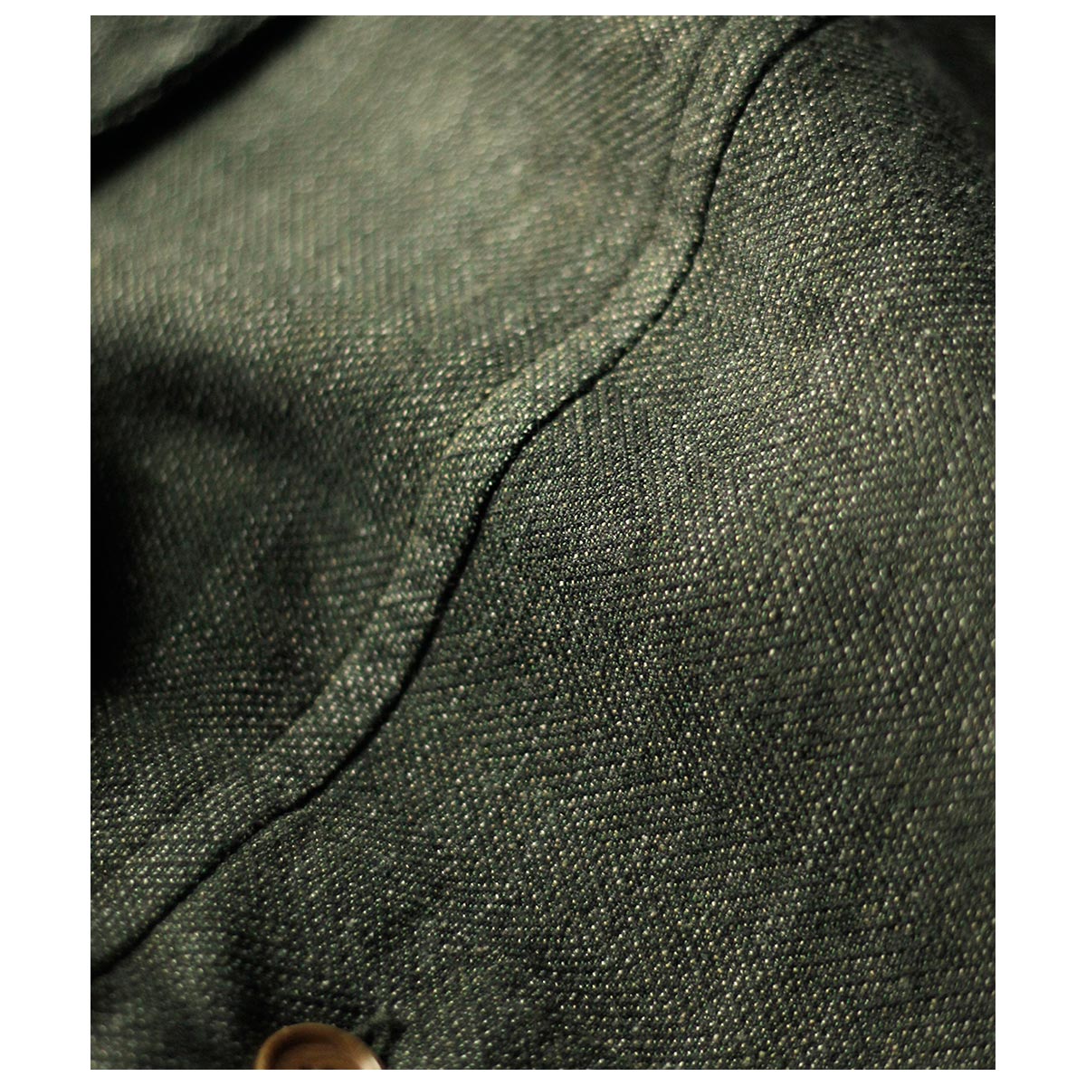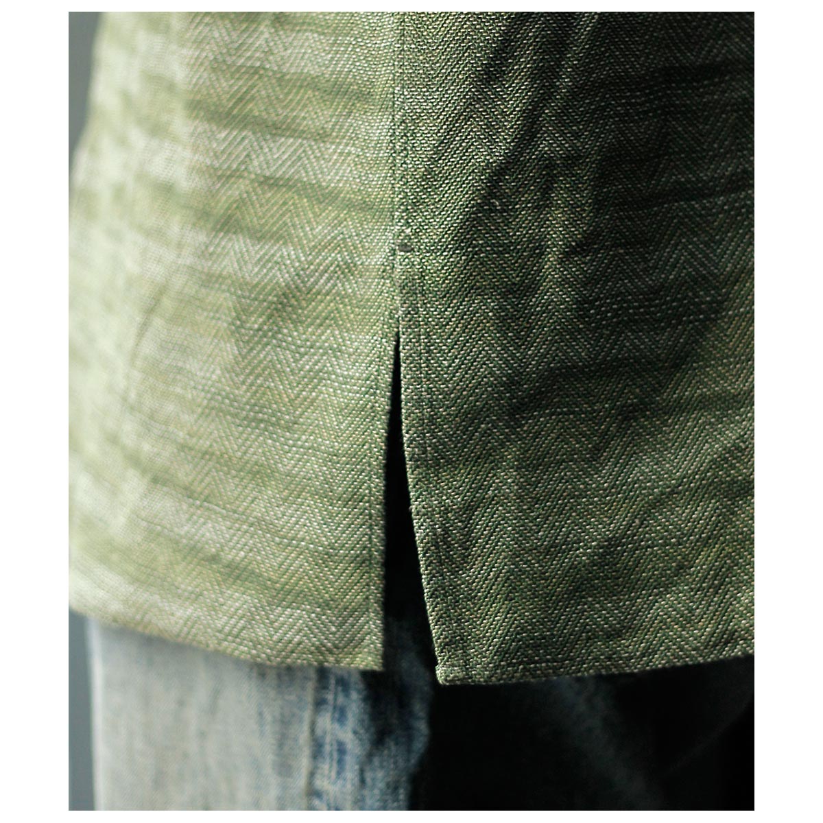 チャコールTOPのコットンと色鮮やかなグリーンのラミーTOPを経糸に配置し、生成り~カーキまで4階調くらいあるシルクの絣糸を緯糸に配置。大柄のヘリンボーンを3/1綾組織で森の隙間から見える光を表現しました。また絣の緯糸が多く見える裏面も色彩豊かで両面色を採用しました。