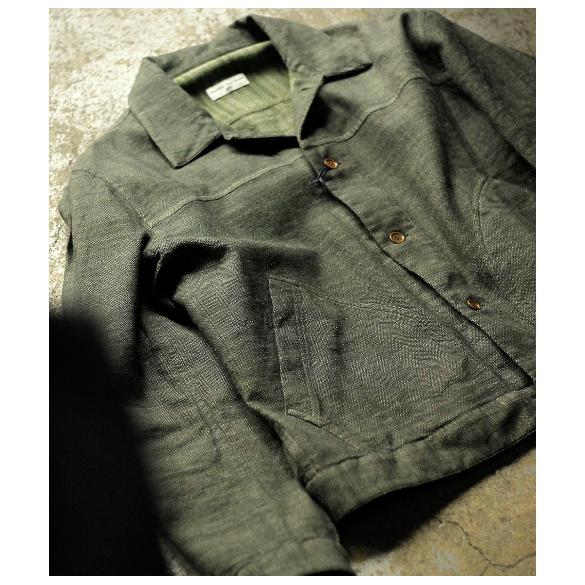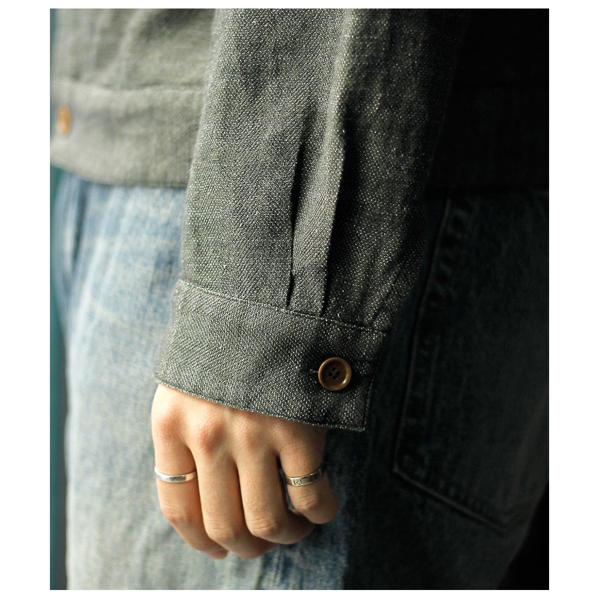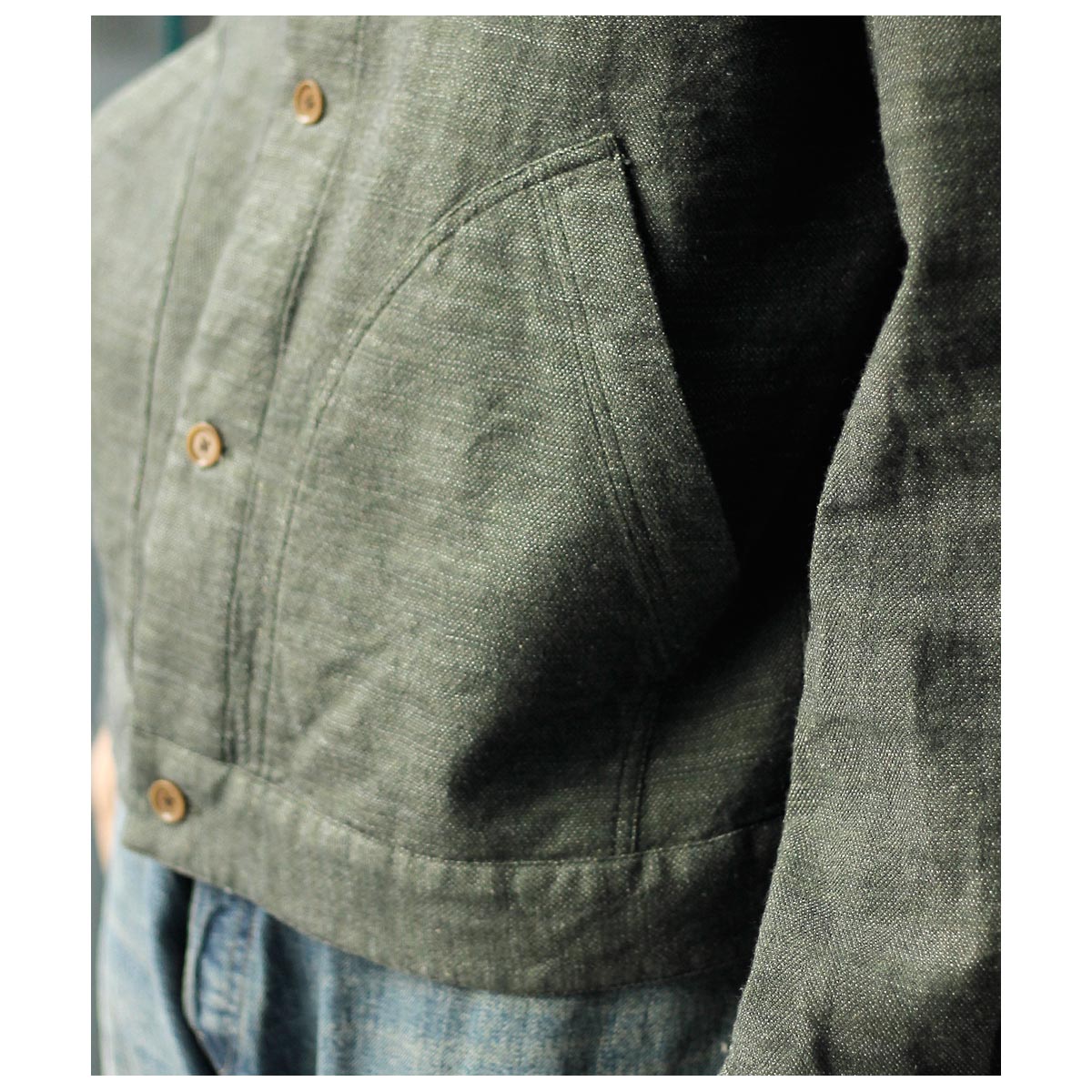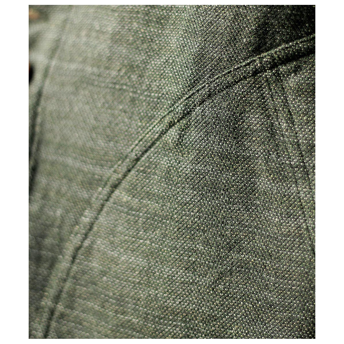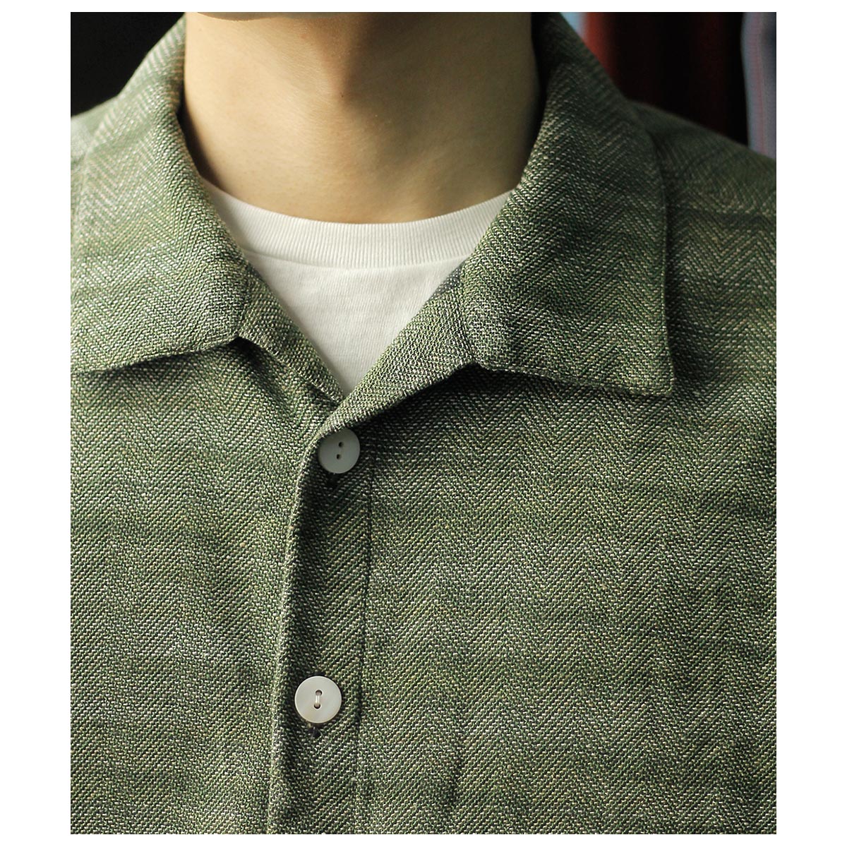 チャコールTOPのコットンと色鮮やかなグリーンのラミーTOPを経糸に配置し、生成り~カーキまで4階調くらいあるシルクの絣糸を緯糸に配置。大柄のヘリンボーンを3/1綾組織で森の隙間から見える光を表現しました。また絣の緯糸が多く見える裏面も色彩豊かで両面色を採用しました。