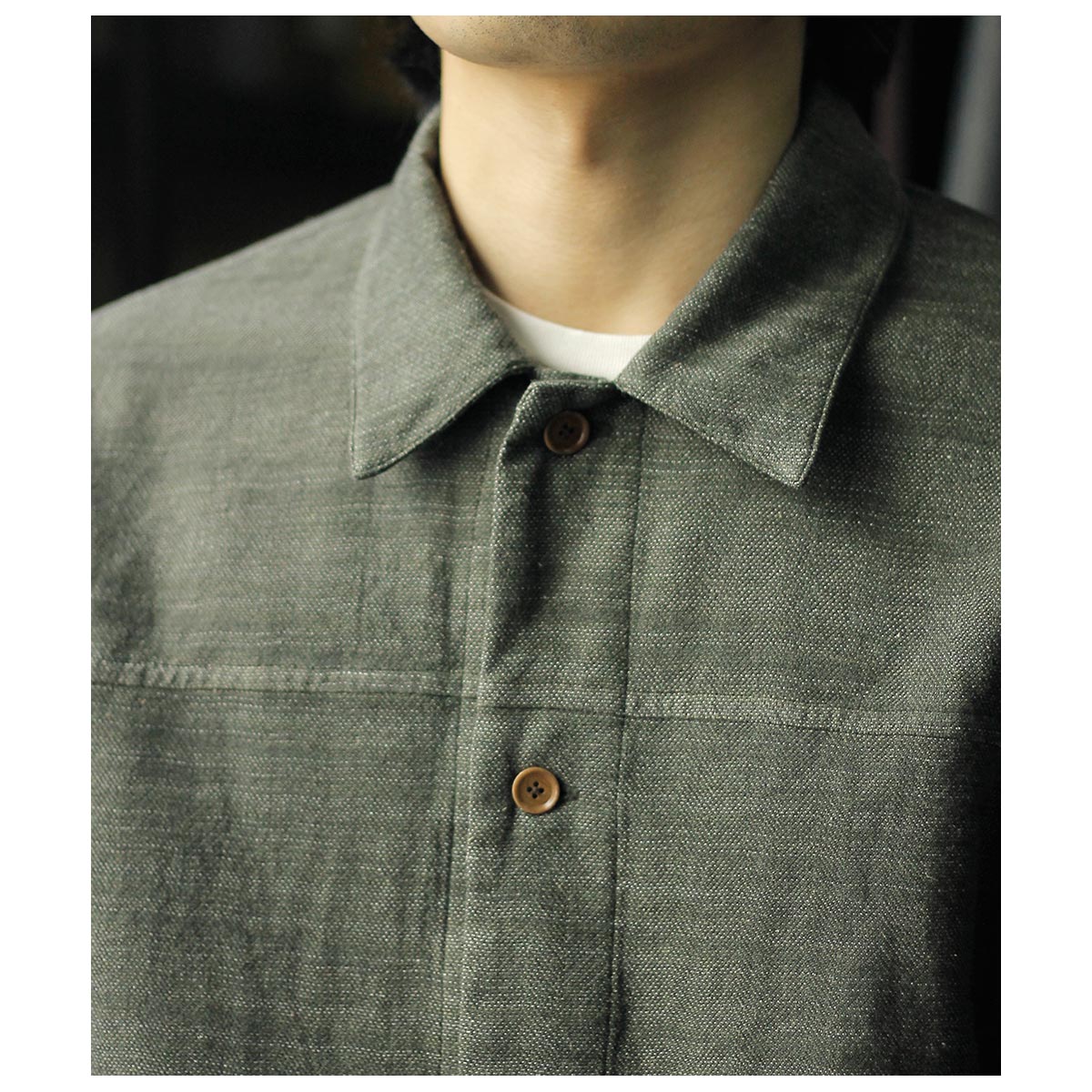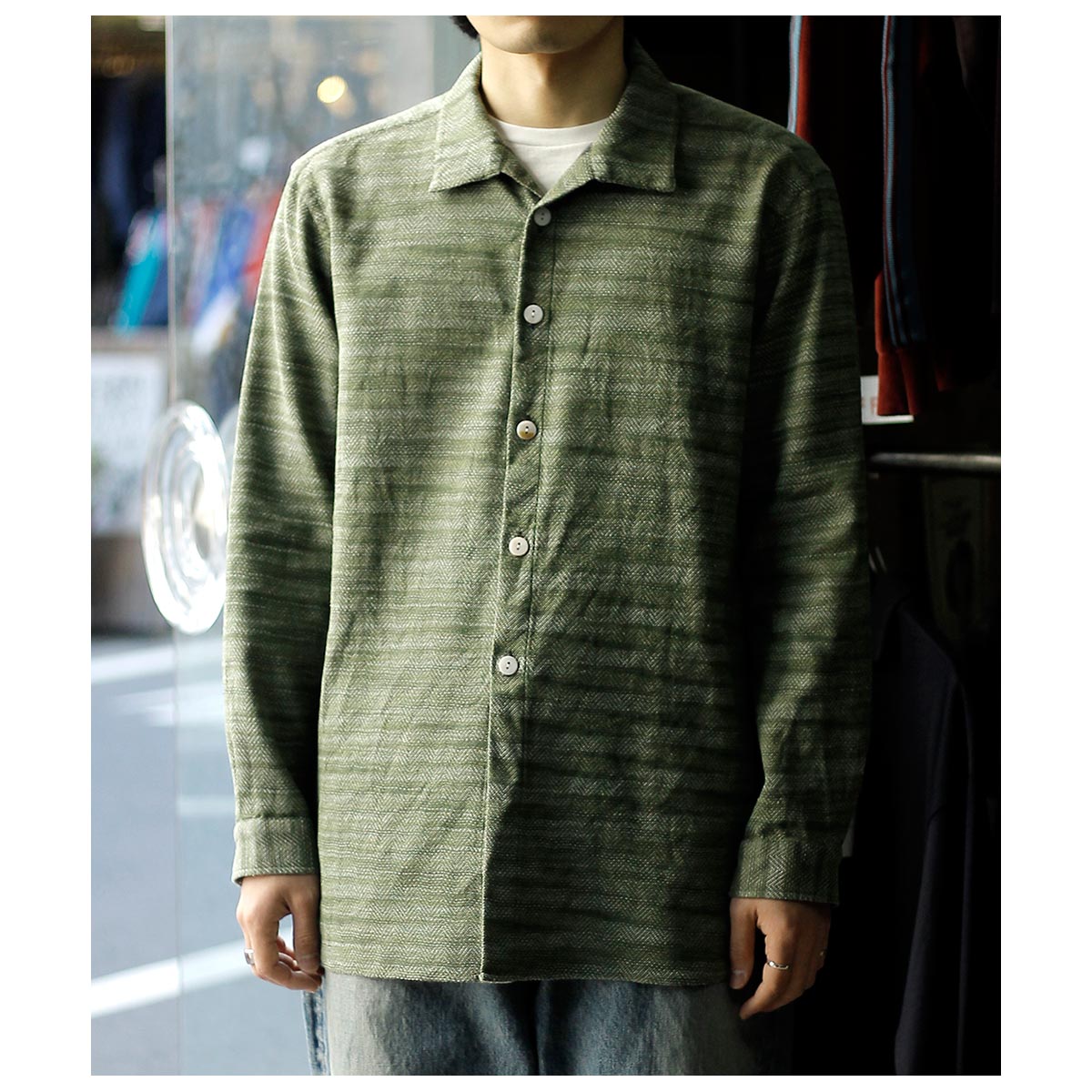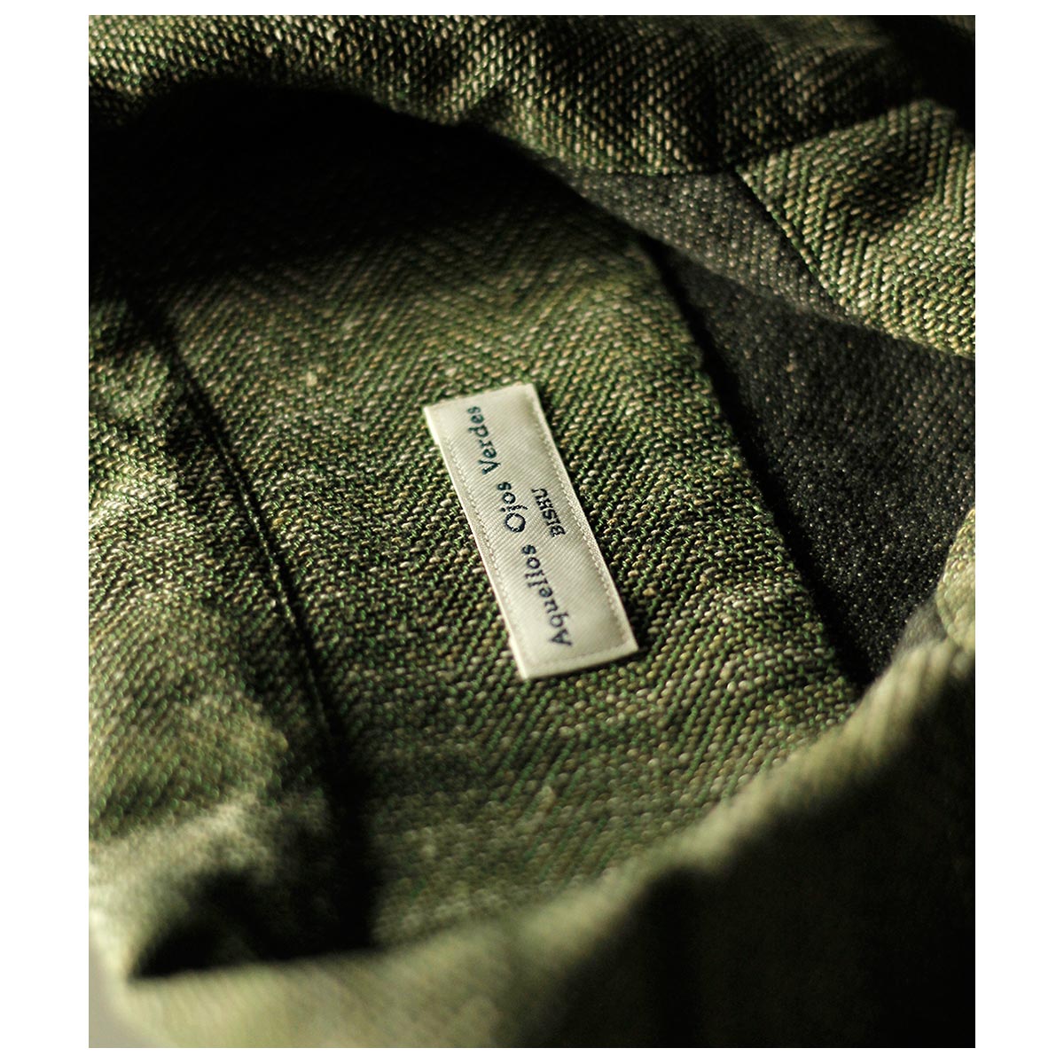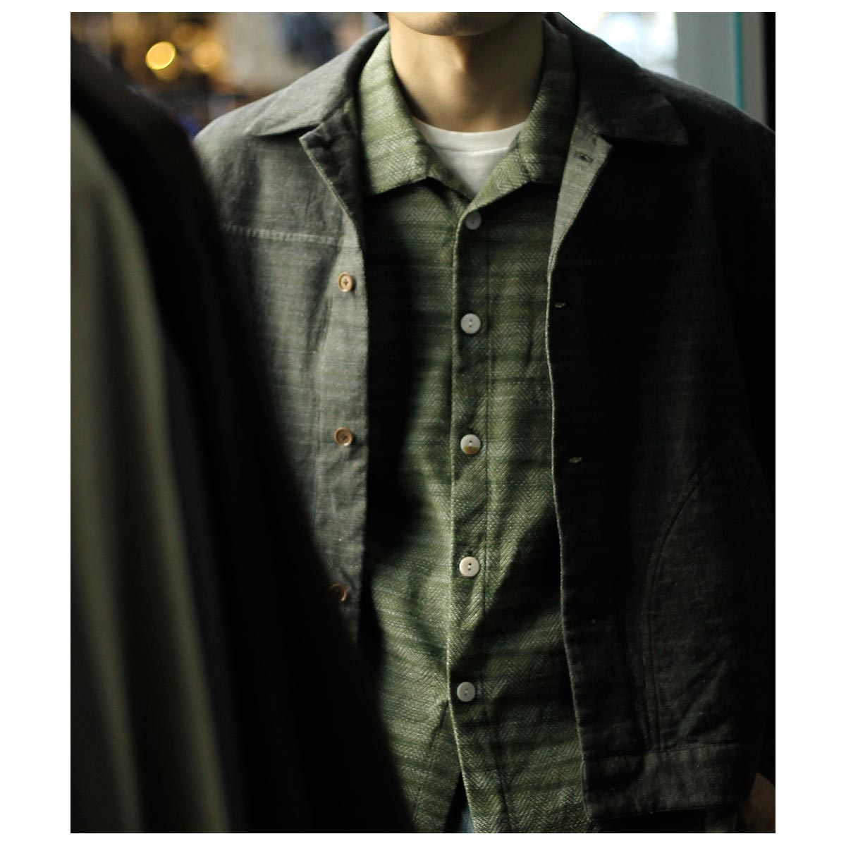 チャコールTOPのコットンと色鮮やかなグリーンのラミーTOPを経糸に配置し、生成り~カーキまで4階調くらいあるシルクの絣糸を緯糸に配置。大柄のヘリンボーンを3/1綾組織で森の隙間から見える光を表現しました。また絣の緯糸が多く見える裏面も色彩豊かで両面色を採用しました。