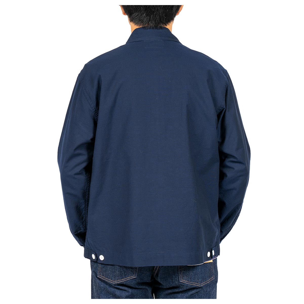 WORKERSで採用した素材は、約5オンスのオックスフォード。無地はダークネイビーをラインナップに加えました。この形状にはサックスブルーやホワイトよりも、落ち着いた色味が適していると判断しています。