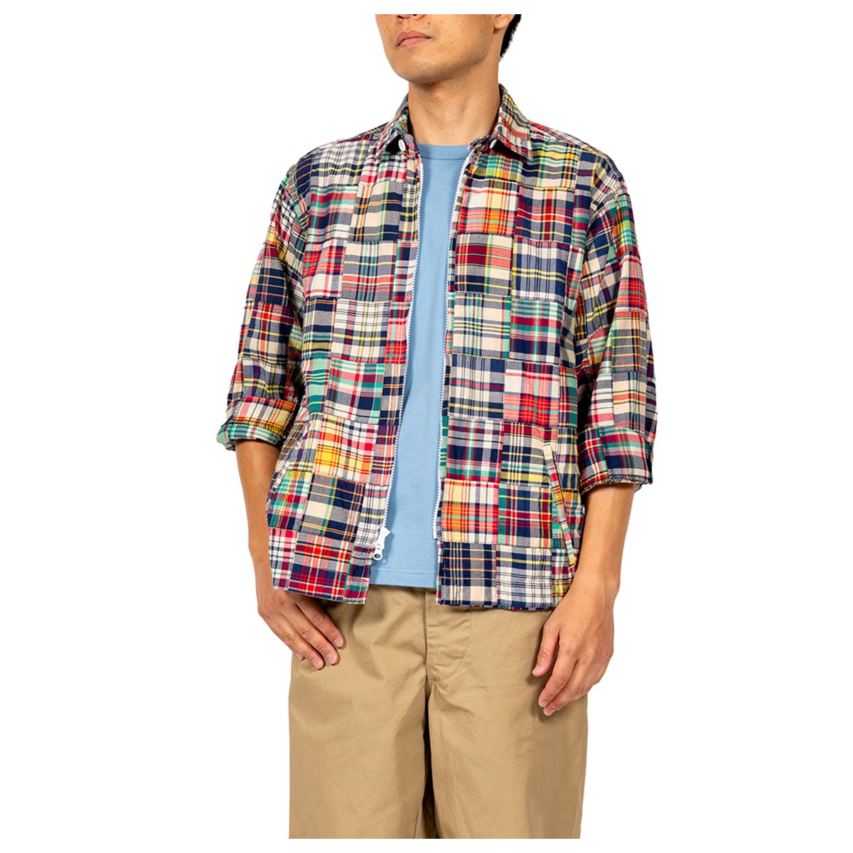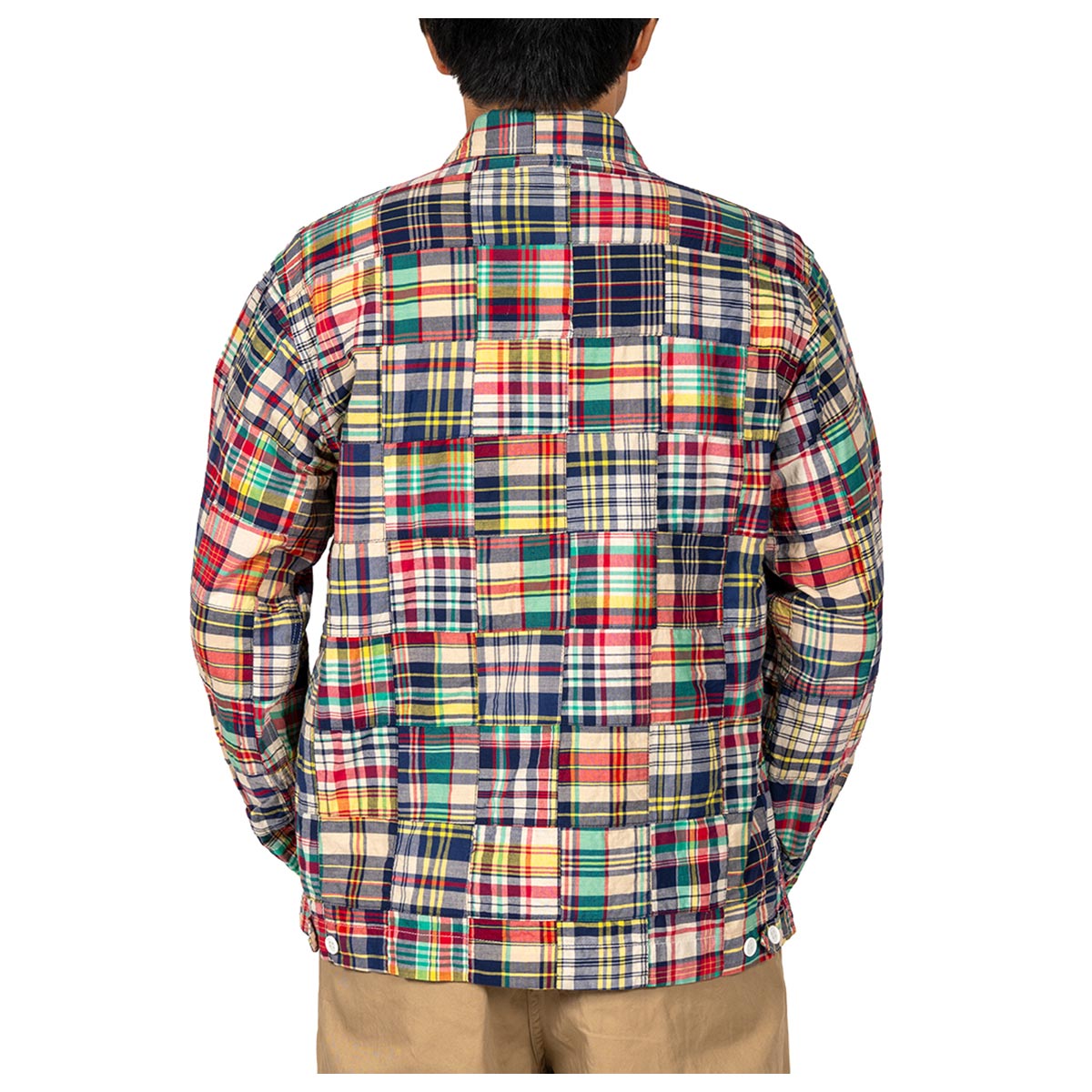 本モデルでは、パッチワークマドラスも展開しています。スイングトップの文脈に見られる仕様の一つとして、約3オンスのインド製マドラスパッチワーク生地を採用。軽量で通気性があり、夏季の着用を想定した素材です。