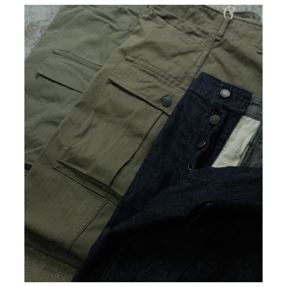 約9.2~9.5オンスで、洗いをかけると若干詰まり約10オンスほどになります。一見似ていますが、糸の太さが微妙に異なります。ODはヘリンボーン柄がやや沈んで見え、Khaki(ややブラウンがかった色味)はストライプ柄が比較的はっきりと現れます。