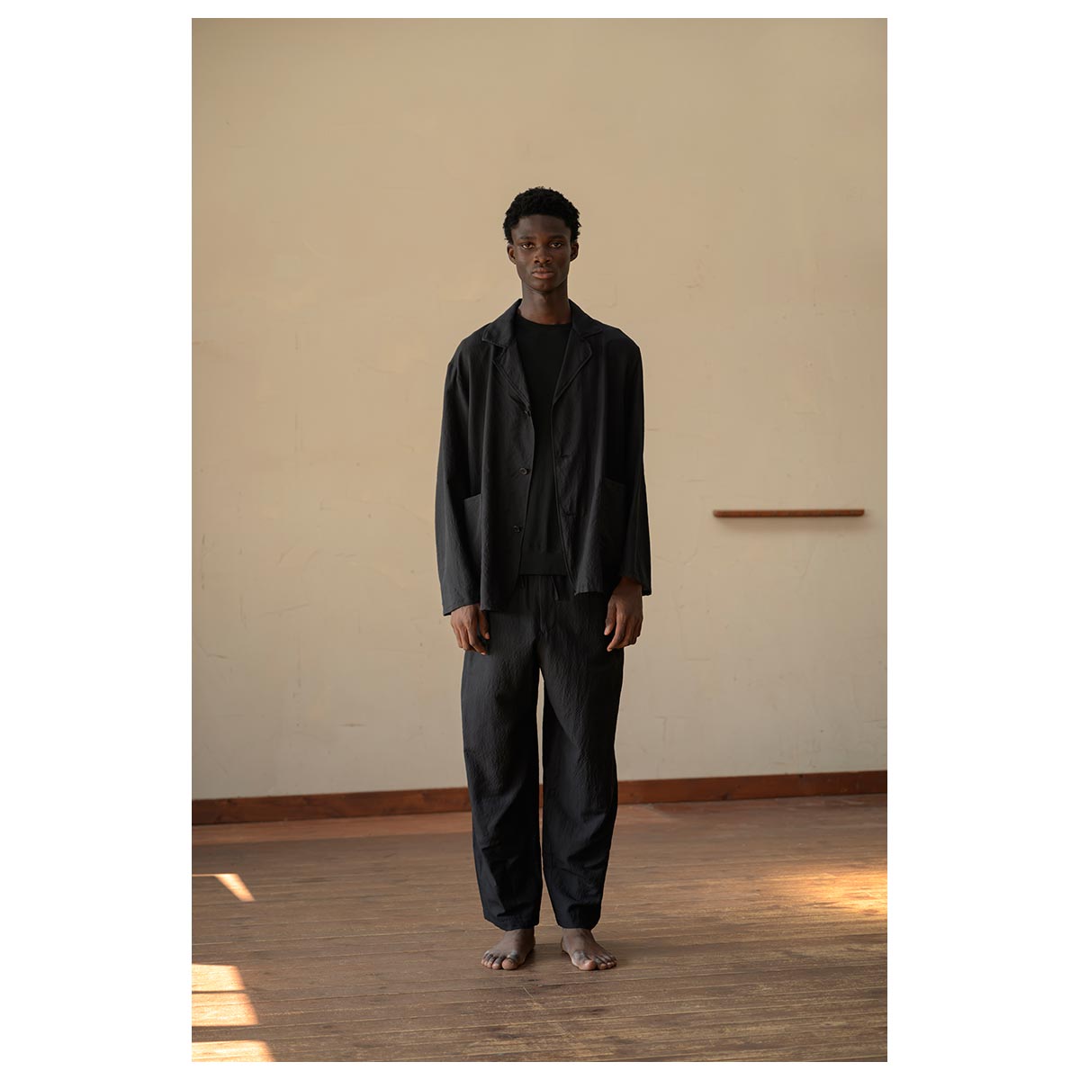 ⽇本各地の機屋の協⼒のもと独⾃の素材開発を⾏いブランドの⽬指す奥⾏きのある世界観をテキスタイルで表現。デザインは様々な国、年代のワークウェアやミリタリーウェアを着想源に、各アイテムの本質的な⽤の美を探求しデザイナーの美意識のもと現代的なアレンジを加えている。