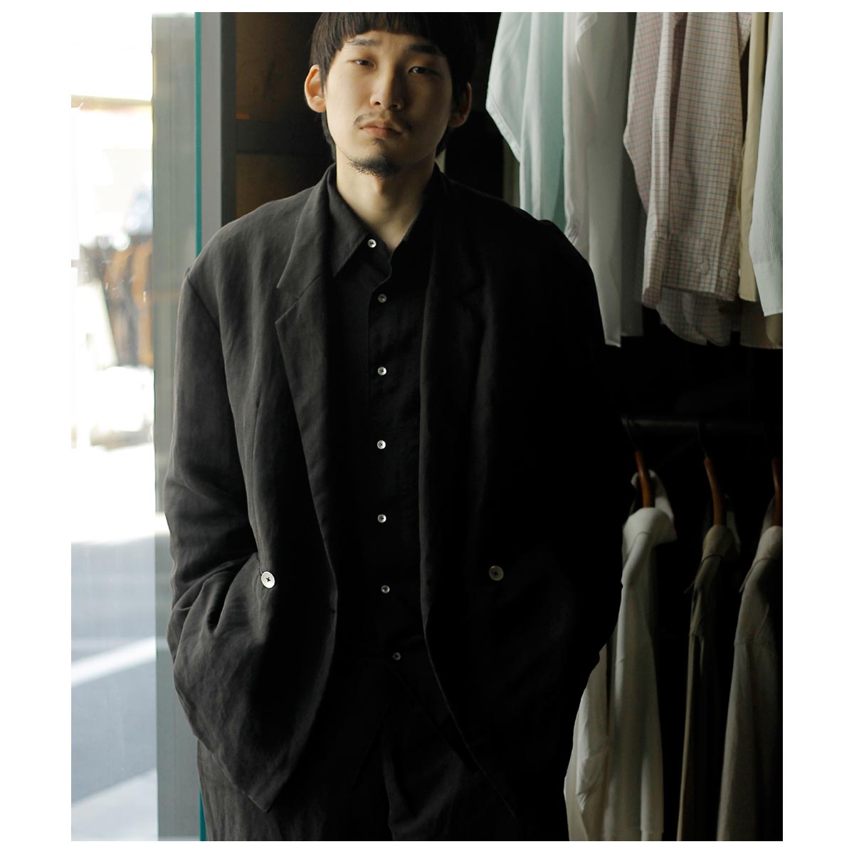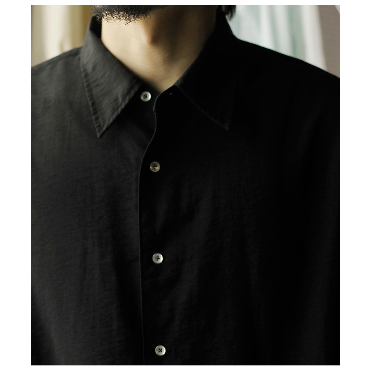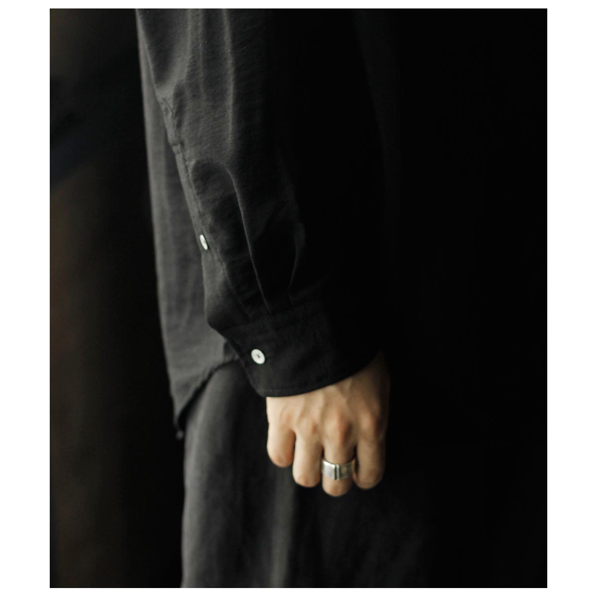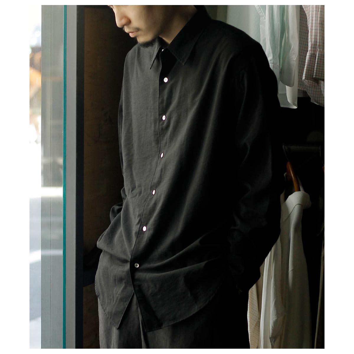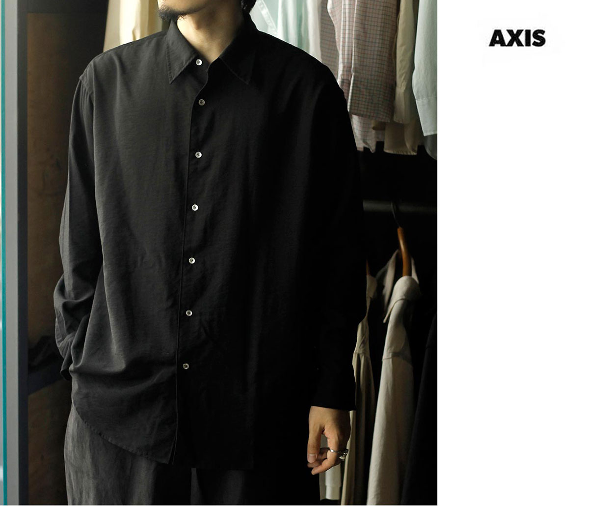 アームホールや身幅にゆとりを持たせたサイズシルエットでありながら、わずかにカフス幅を絞り、スッキリとした印象に仕上げたAXISの定番のレギュラーカラーシャツ。今季は柔らかい手触りのシルク混紡素材を使用し、メタルボタンを合わせています。