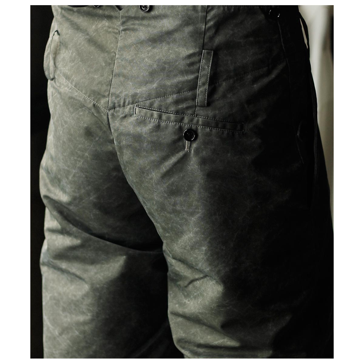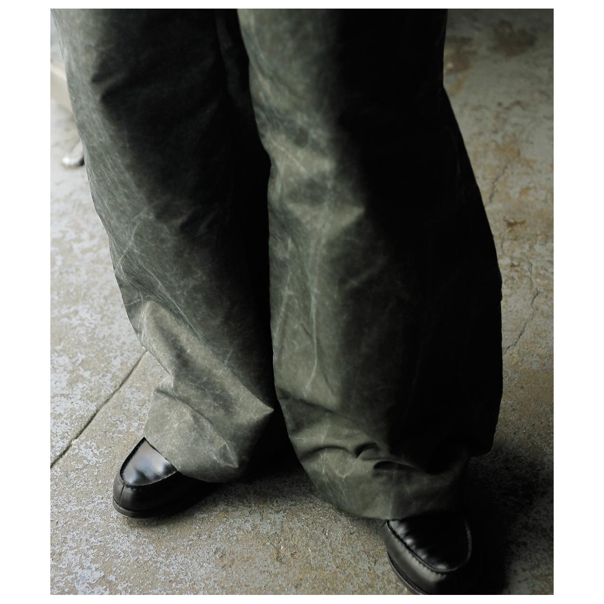 パターンの立体感によってコーディネートを存分に楽しめるシルエットの、AXISの定番ワイドパンツです。ナイロン生地の片面に顔料コーティングを施した後、原反ワッシャーを行った、エイジングした様なヴィンテージ感のある雰囲気が特徴の生地を使用しています。加工の特性上発生する雫状の色ムラ、色の濃淡により特徴的な表面感を持ち合わせた仕上がりになっています。