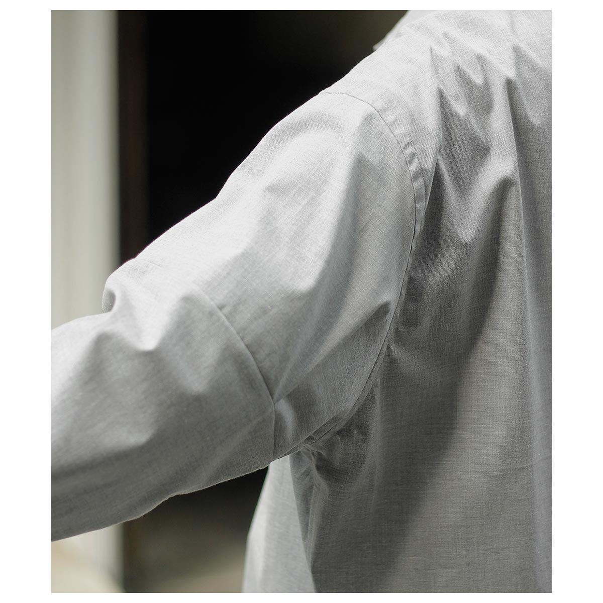 グレーは細番手で高密度に織られたブロード生地。糸の打ち込みが幕、ドライで固い質感から着用していただけます。グレーとホワイトの異なる糸を使いメランジェのような表情が都会的な雰囲気を漂わせています。