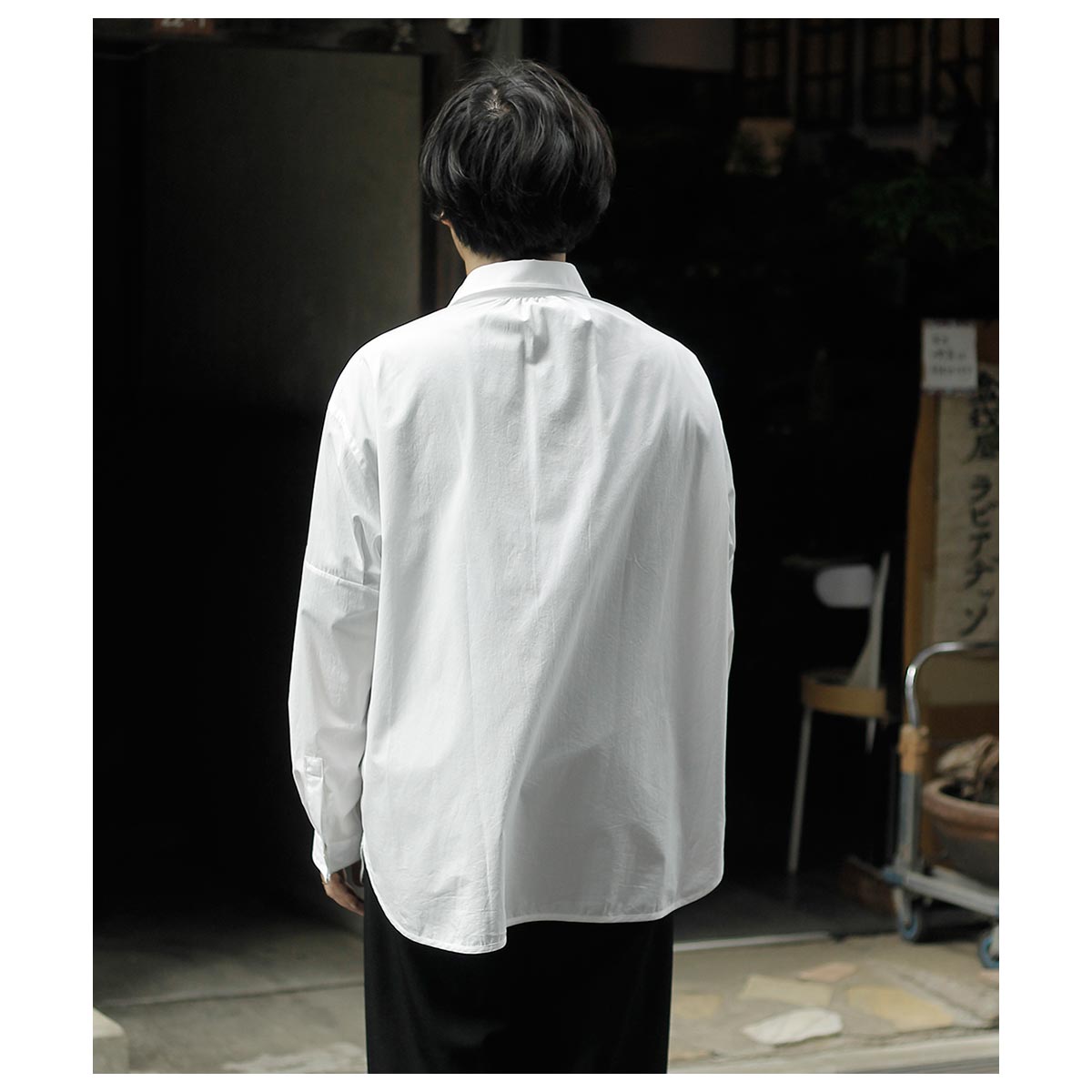 フランスのシャツ工場で見た54サイズビッグサイズのドレスシャツを基にギャザーやタック、パイピングのディテールを組み合わせて、ブランド独自のシルエットを表現したタックカラーシャツです。ドレスシャツの細かい運針やダブルカフスのディテールが特徴です。