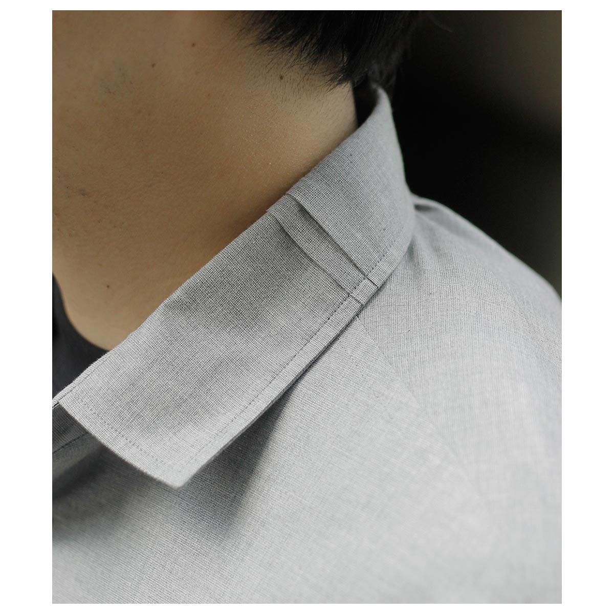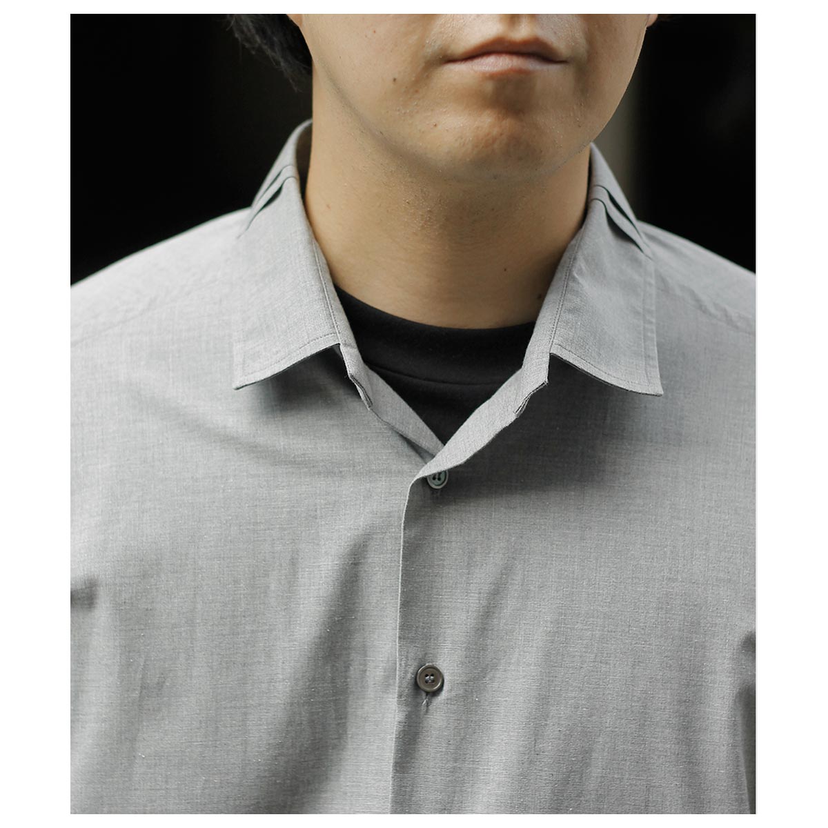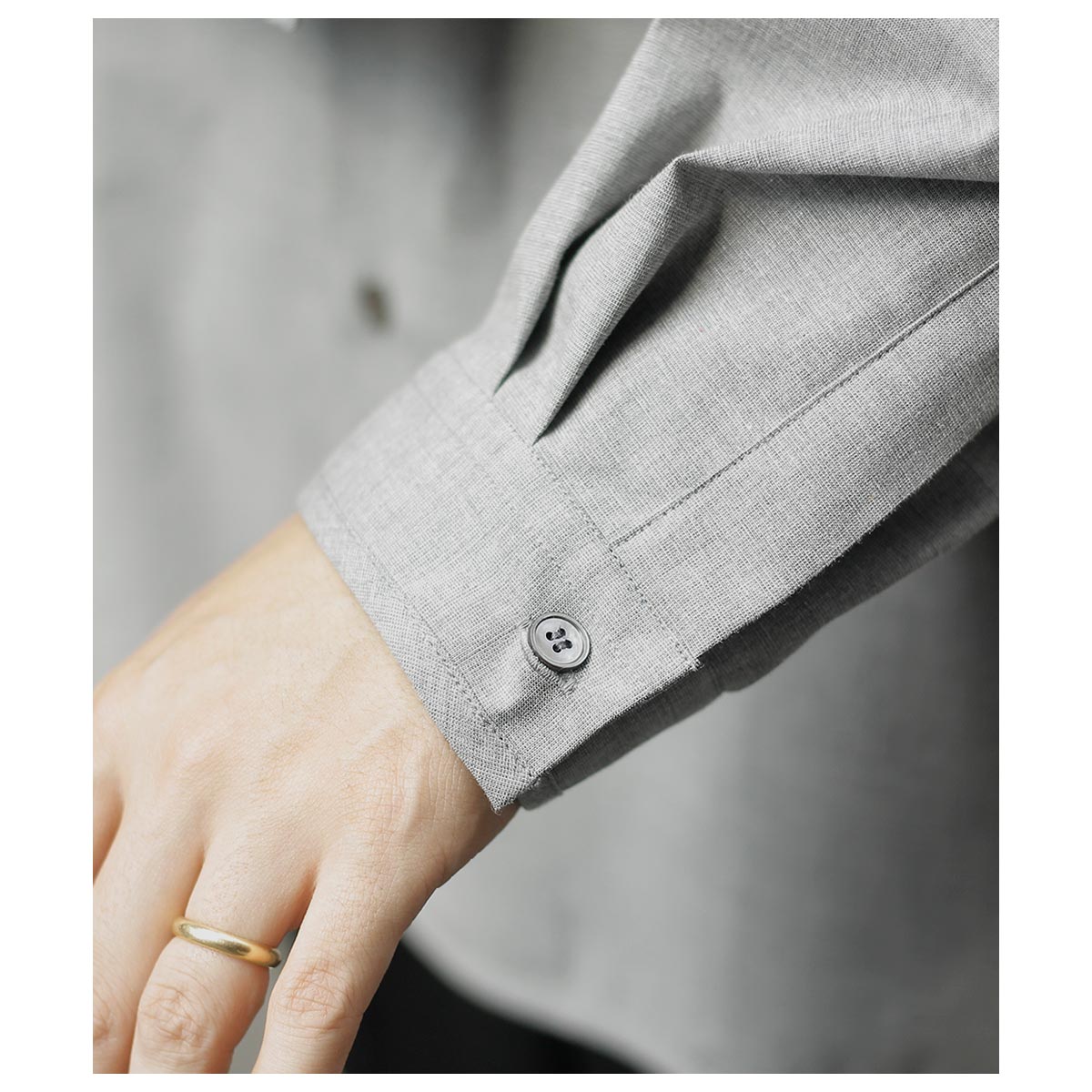 グレーは細番手で高密度に織られたブロード生地。糸の打ち込みが幕、ドライで固い質感から着用していただけます。グレーとホワイトの異なる糸を使いメランジェのような表情が都会的な雰囲気を漂わせています。