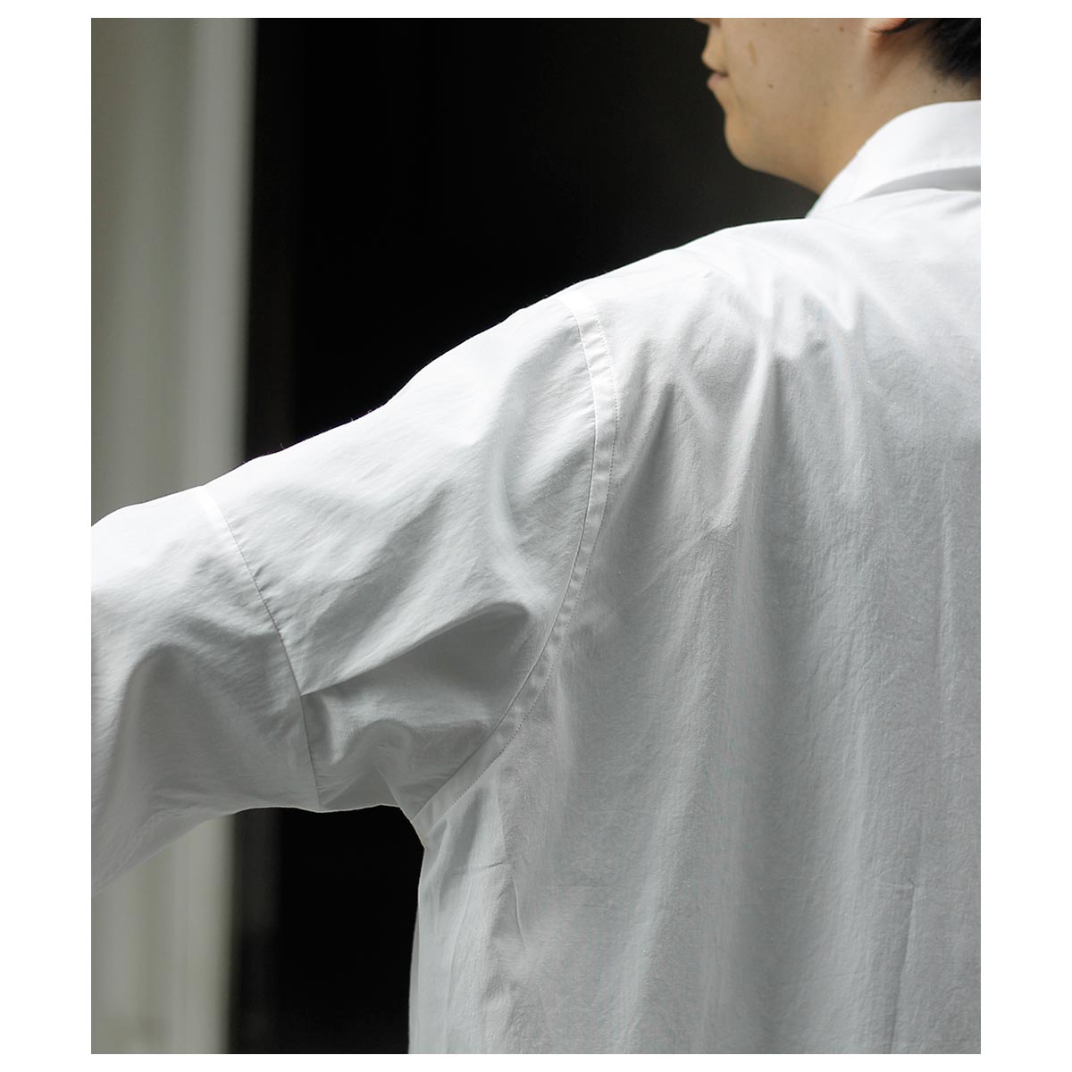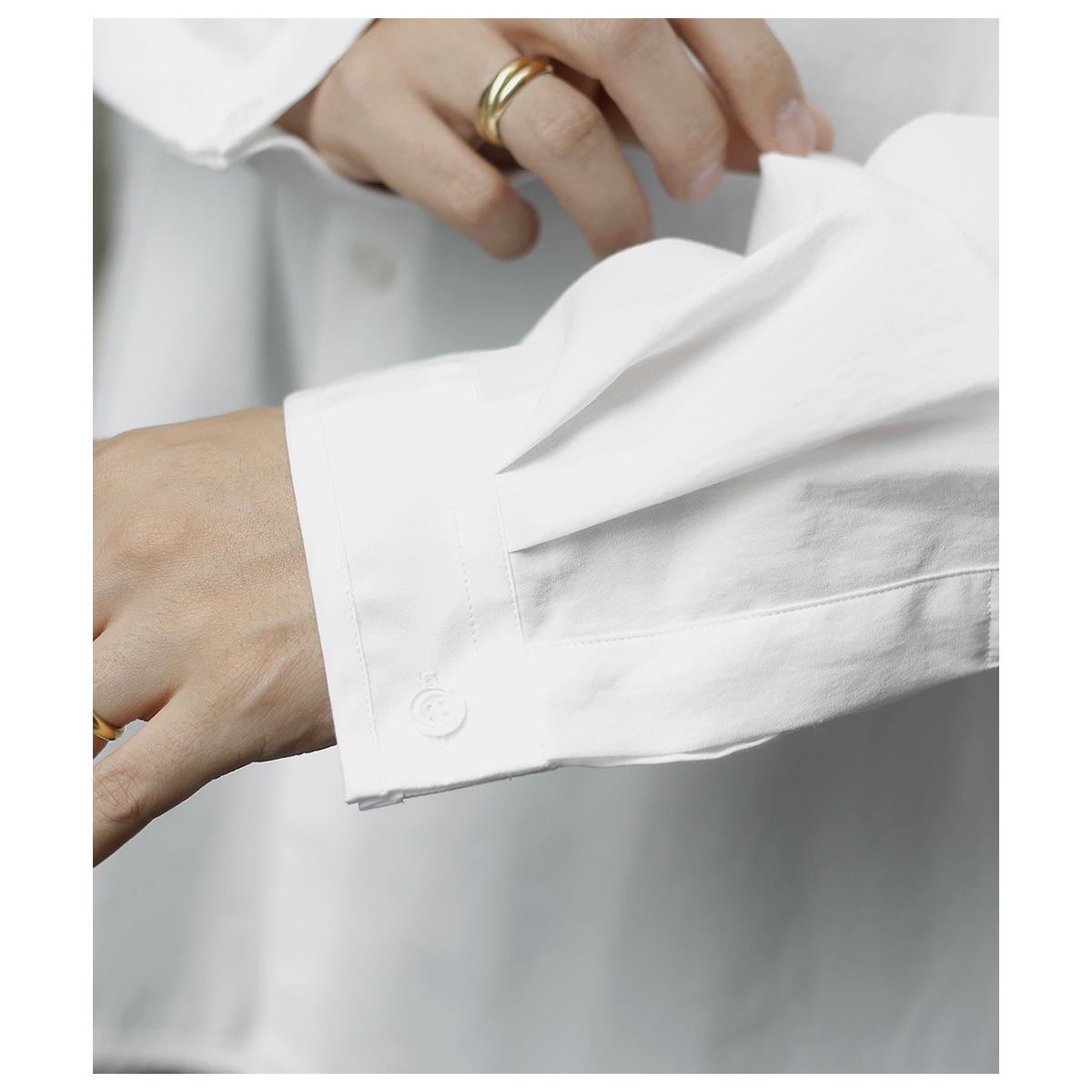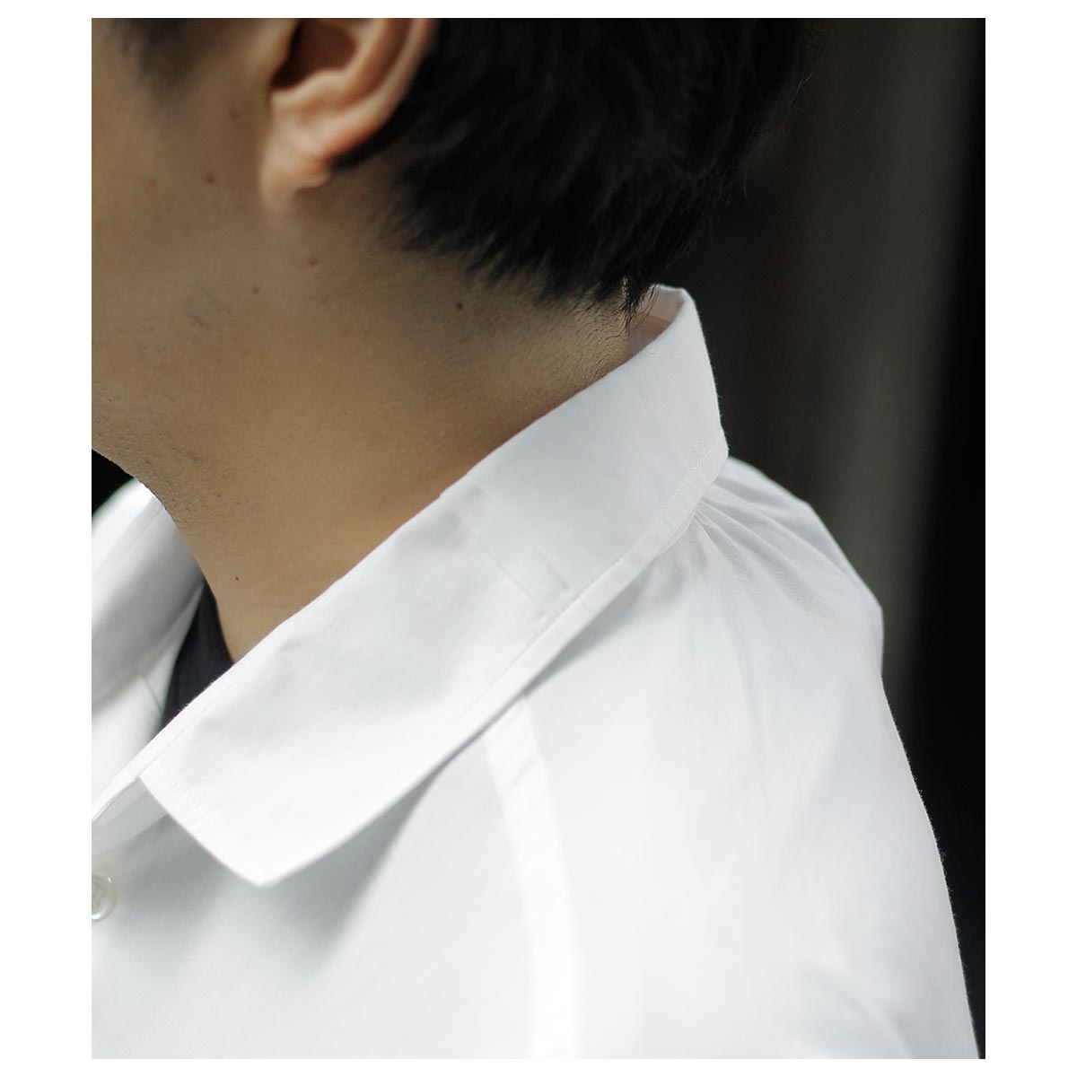 フランスのシャツ工場で見た54サイズビッグサイズのドレスシャツを基にギャザーやタック、パイピングのディテールを組み合わせて、ブランド独自のシルエットを表現したタックカラーシャツです。ドレスシャツの細かい運針やダブルカフスのディテールが特徴です。