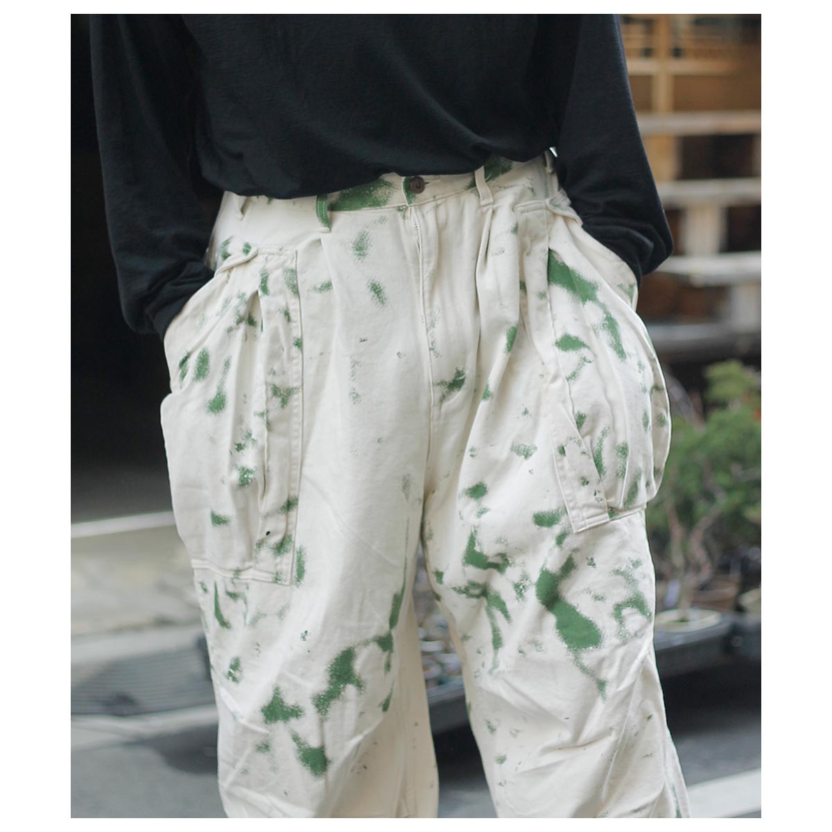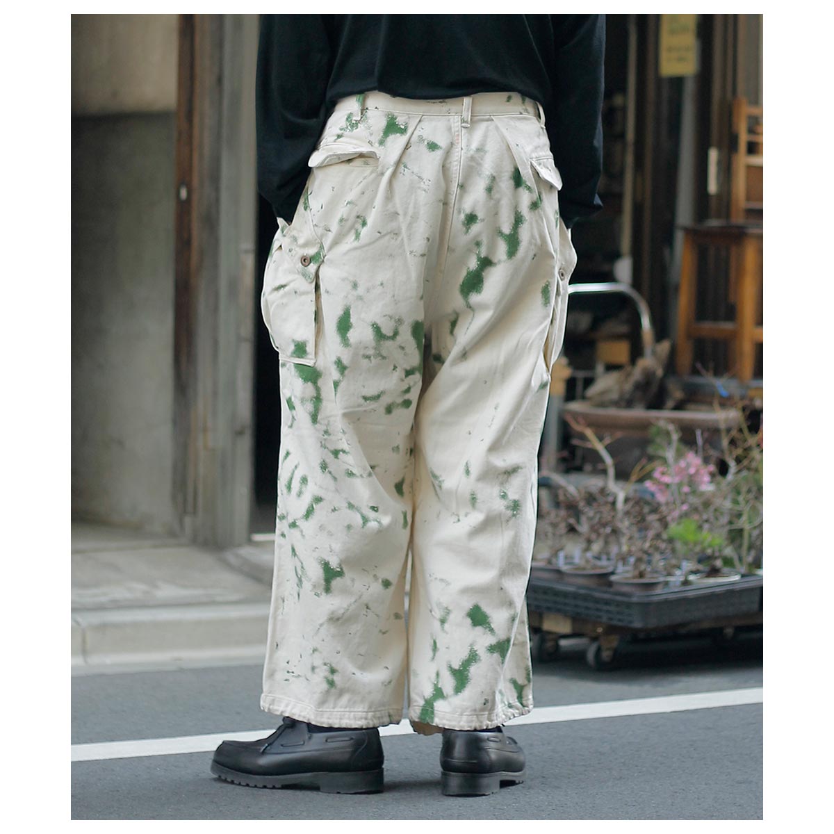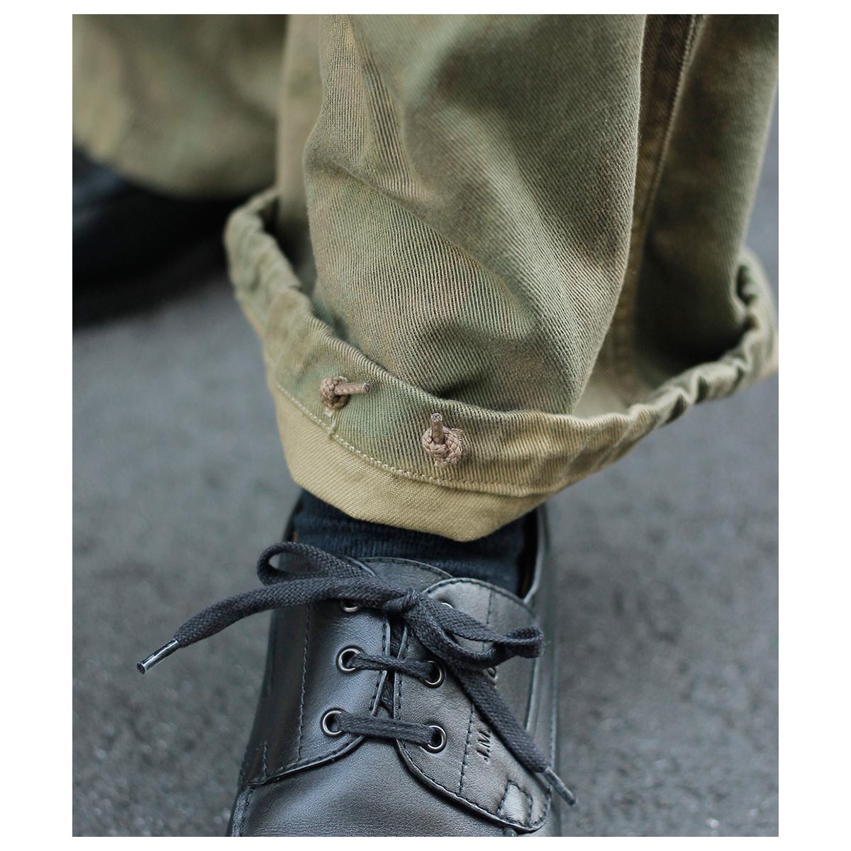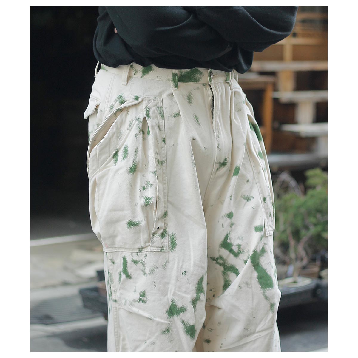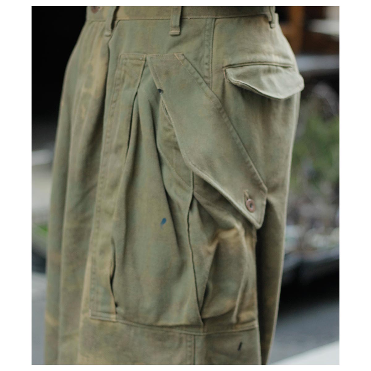 グランクからカーゴパンツ。 定番となるグランクらしさ溢れる1本。米軍のM51を彷彿とさせる極太のシルエットに、スナップボタンのフラップのついた大振りのサイドポケットが特徴です。また裾にはドローコードがついており、シルエットに変化を付ける事が可能。