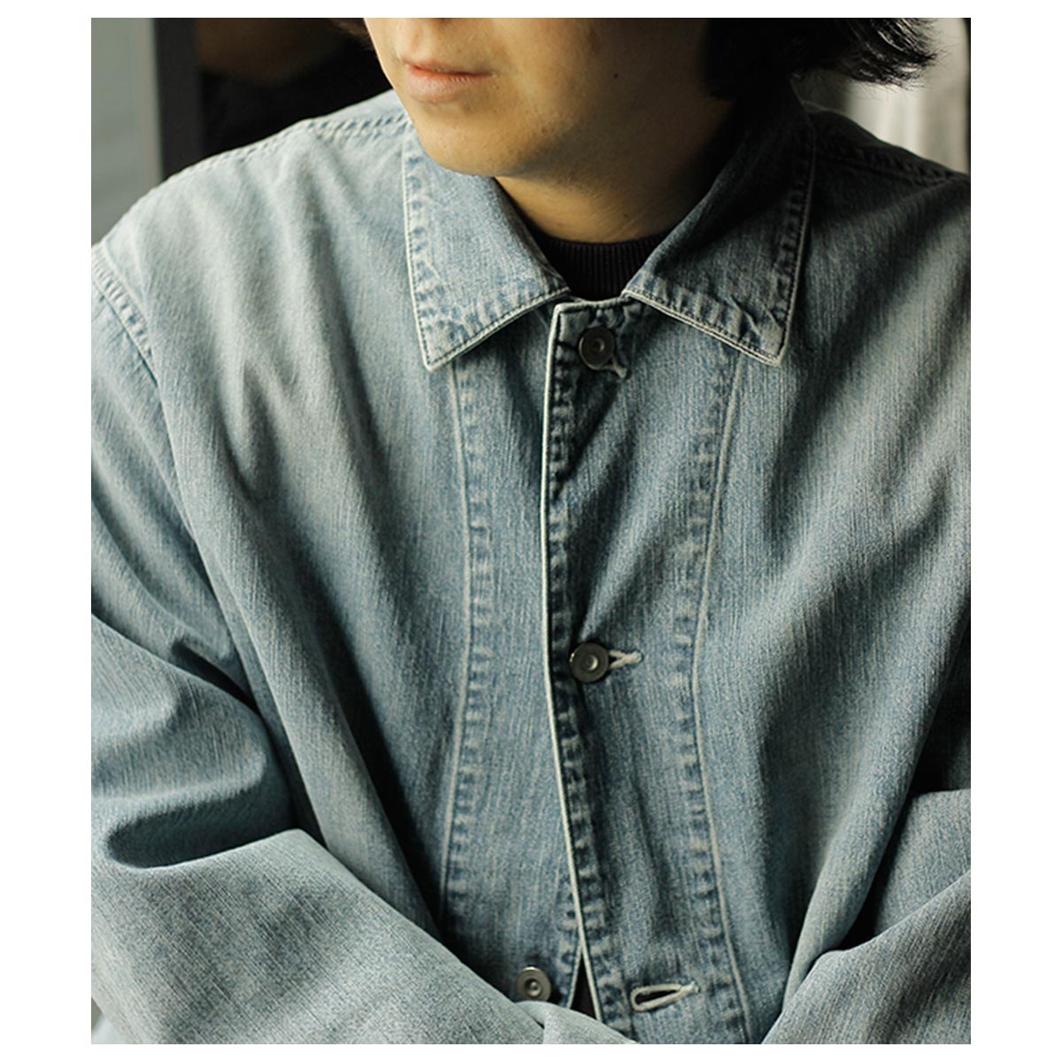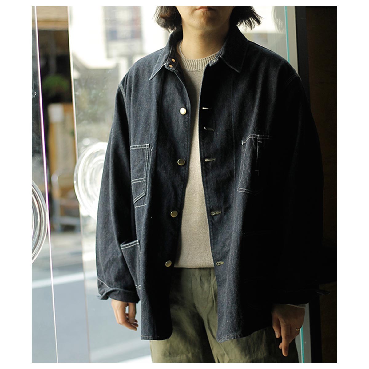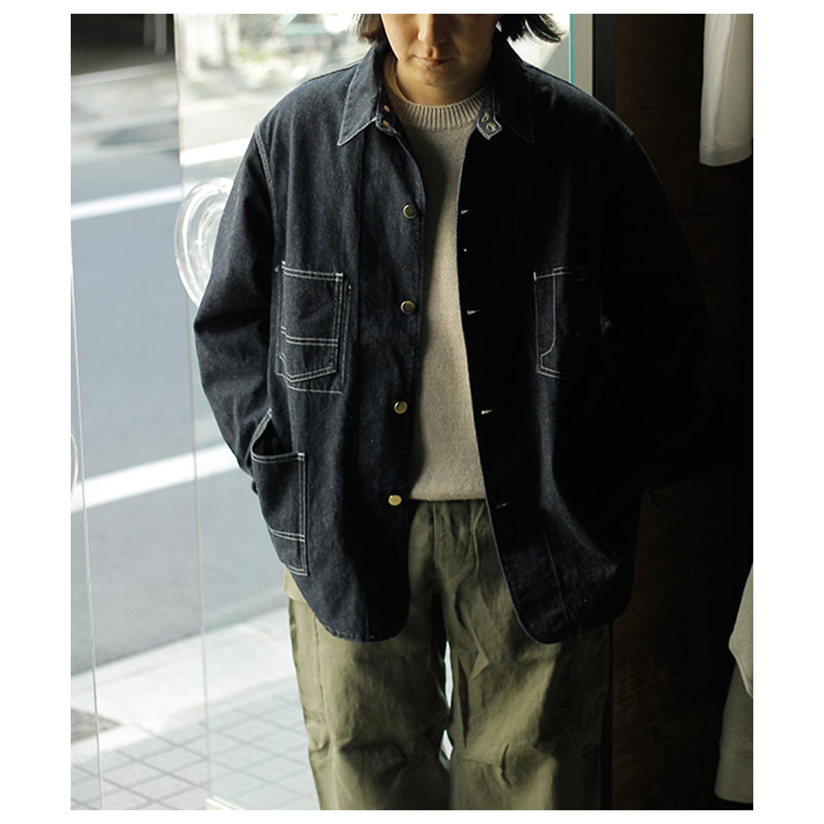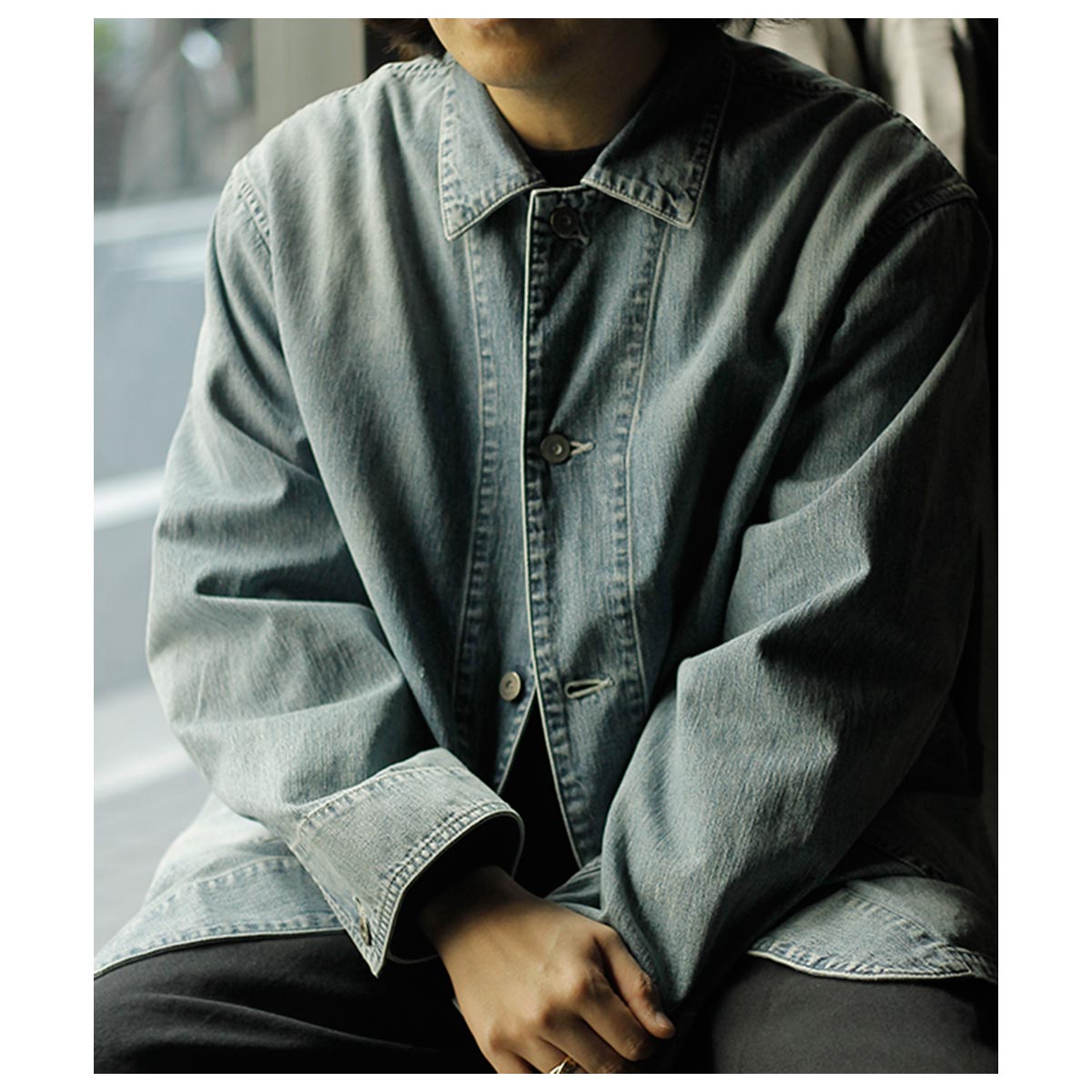 大戦期のカバーオールをベースに気負わず羽織れるパターンワークで仕上げたカバー オール。所謂ビンテージの色落ちとはまた違ったムードを目指し、手作業と洗い加工を いくつも組み合わながら、奥行きのあるフェードや色彩の濃淡を細かく調整して仕上げています。今季はさらに全体の色落ちを強くし、アタリ感やフェード感を強く反映させてアップデートしています。