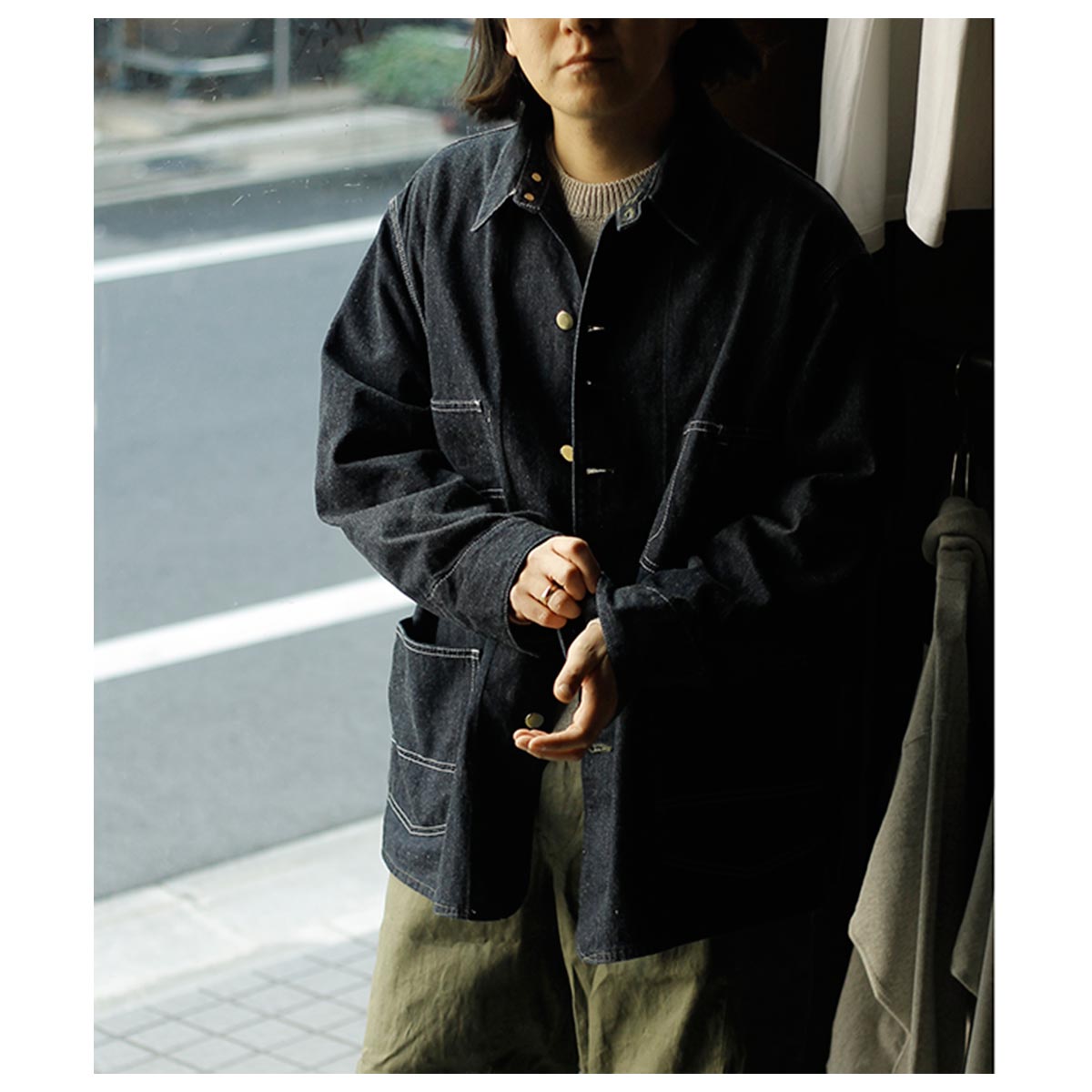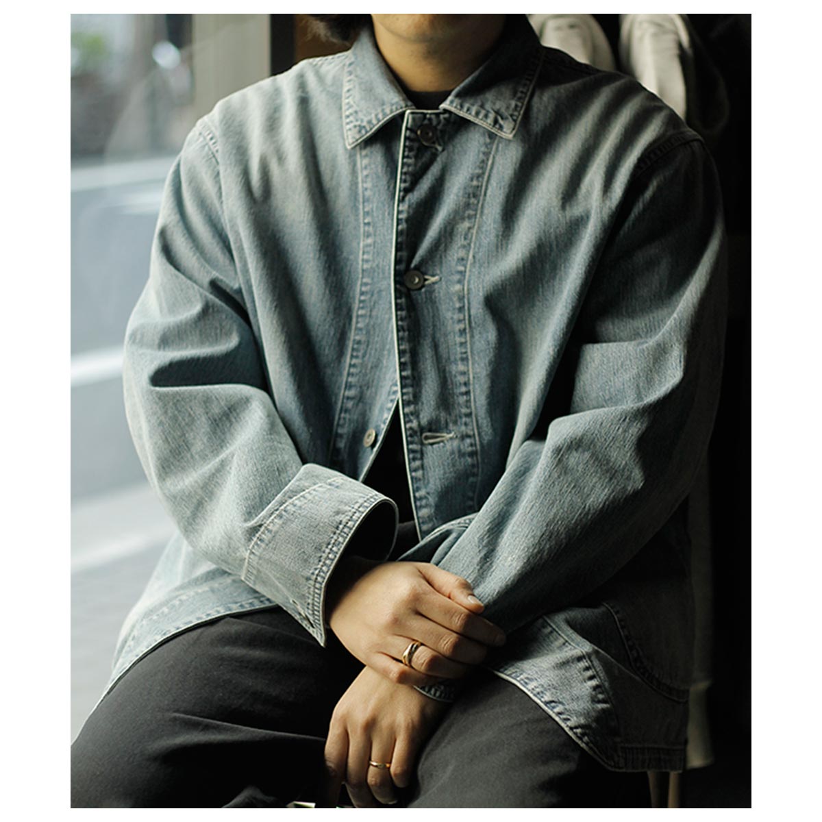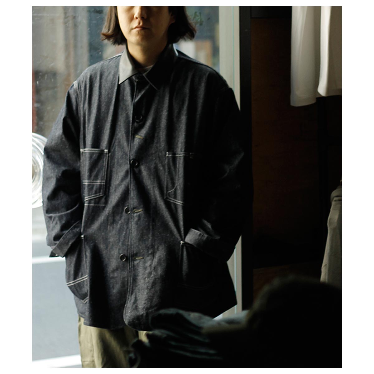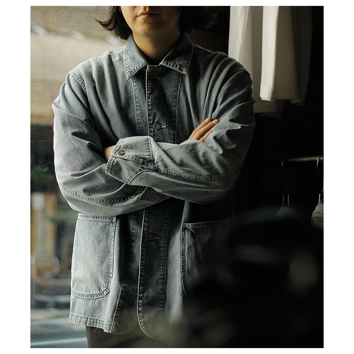 大戦期のカバーオールをベースに気負わず羽織れるパターンワークで仕上げたカバー オール。所謂ビンテージの色落ちとはまた違ったムードを目指し、手作業と洗い加工を いくつも組み合わながら、奥行きのあるフェードや色彩の濃淡を細かく調整して仕上げています。今季はさらに全体の色落ちを強くし、アタリ感やフェード感を強く反映させてアップデートしています。