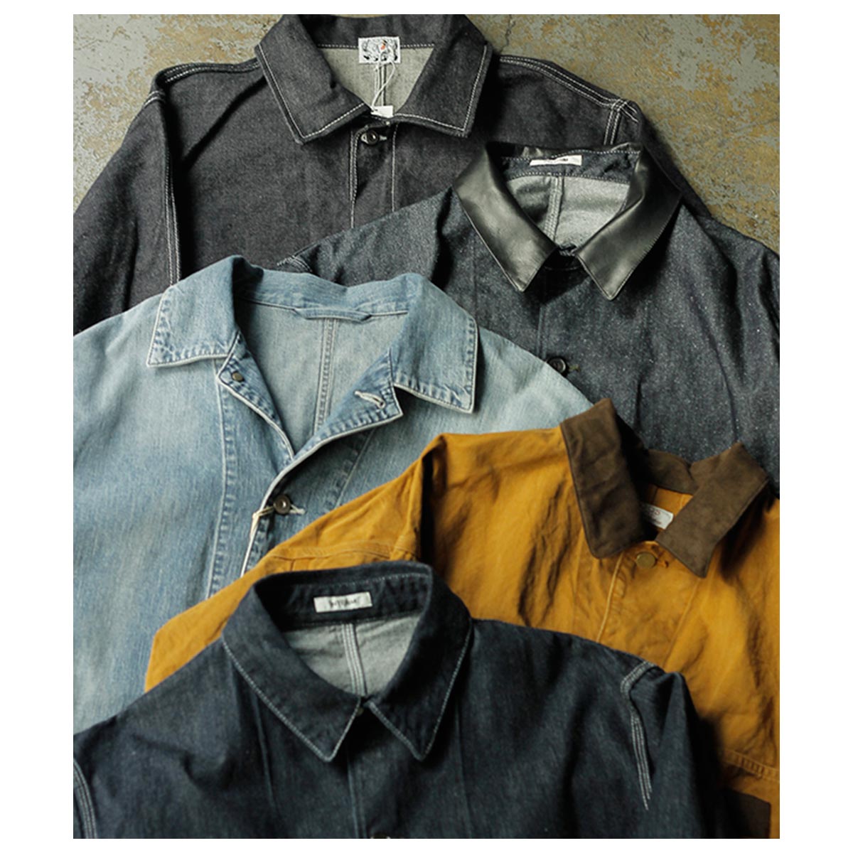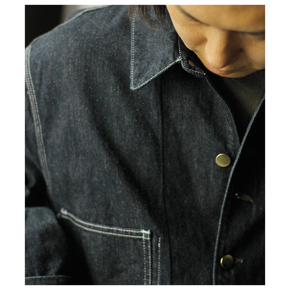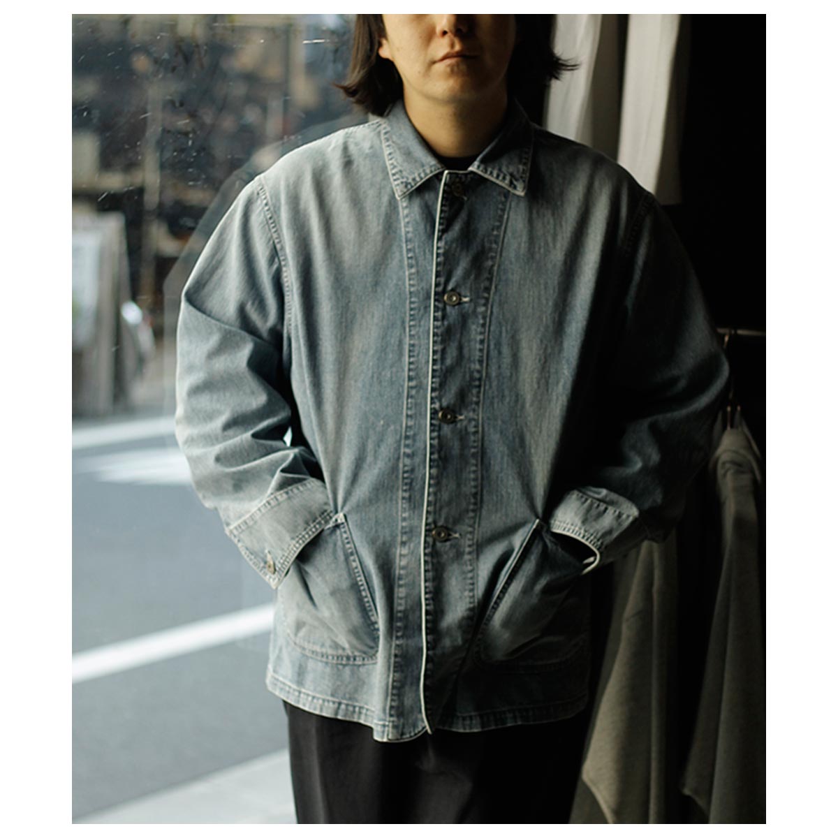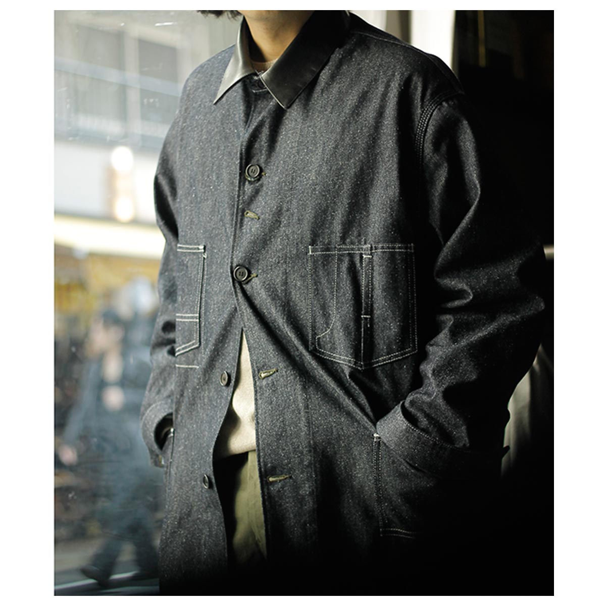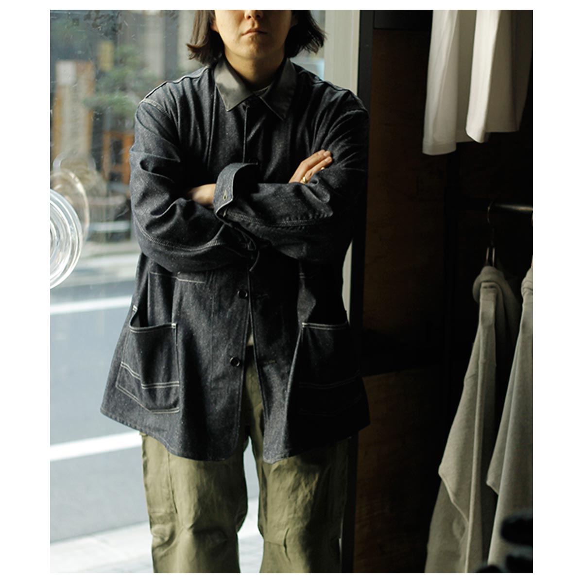 大戦期のカバーオールをベースに気負わず羽織れるパターンワークで仕上げたカバー オール。所謂ビンテージの色落ちとはまた違ったムードを目指し、手作業と洗い加工を いくつも組み合わながら、奥行きのあるフェードや色彩の濃淡を細かく調整して仕上げています。今季はさらに全体の色落ちを強くし、アタリ感やフェード感を強く反映させてアップデートしています。