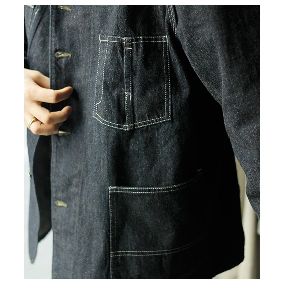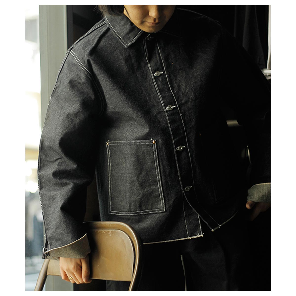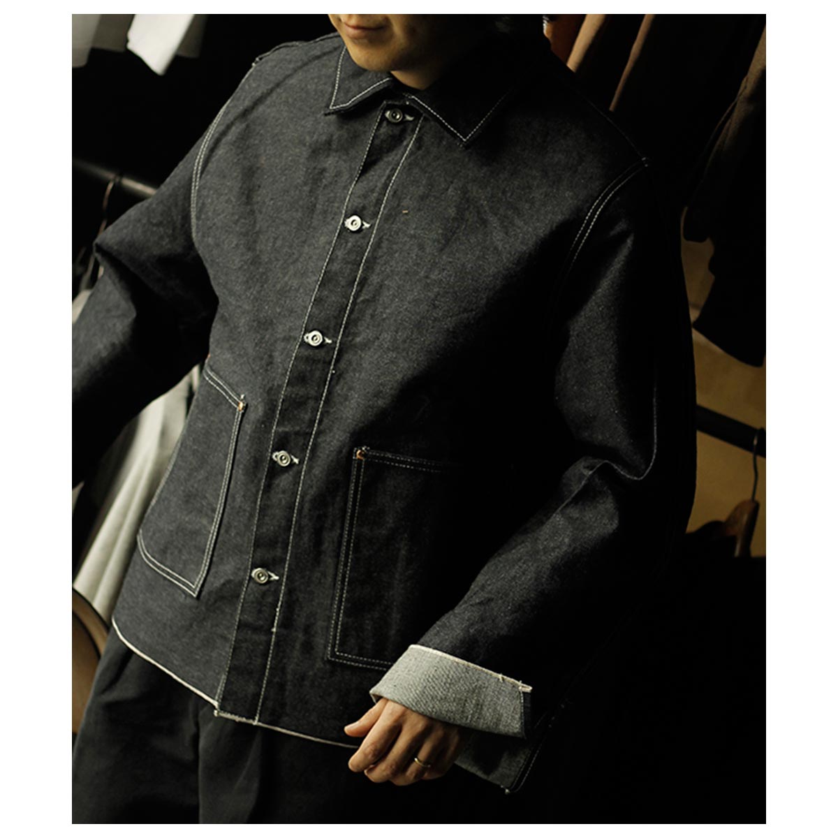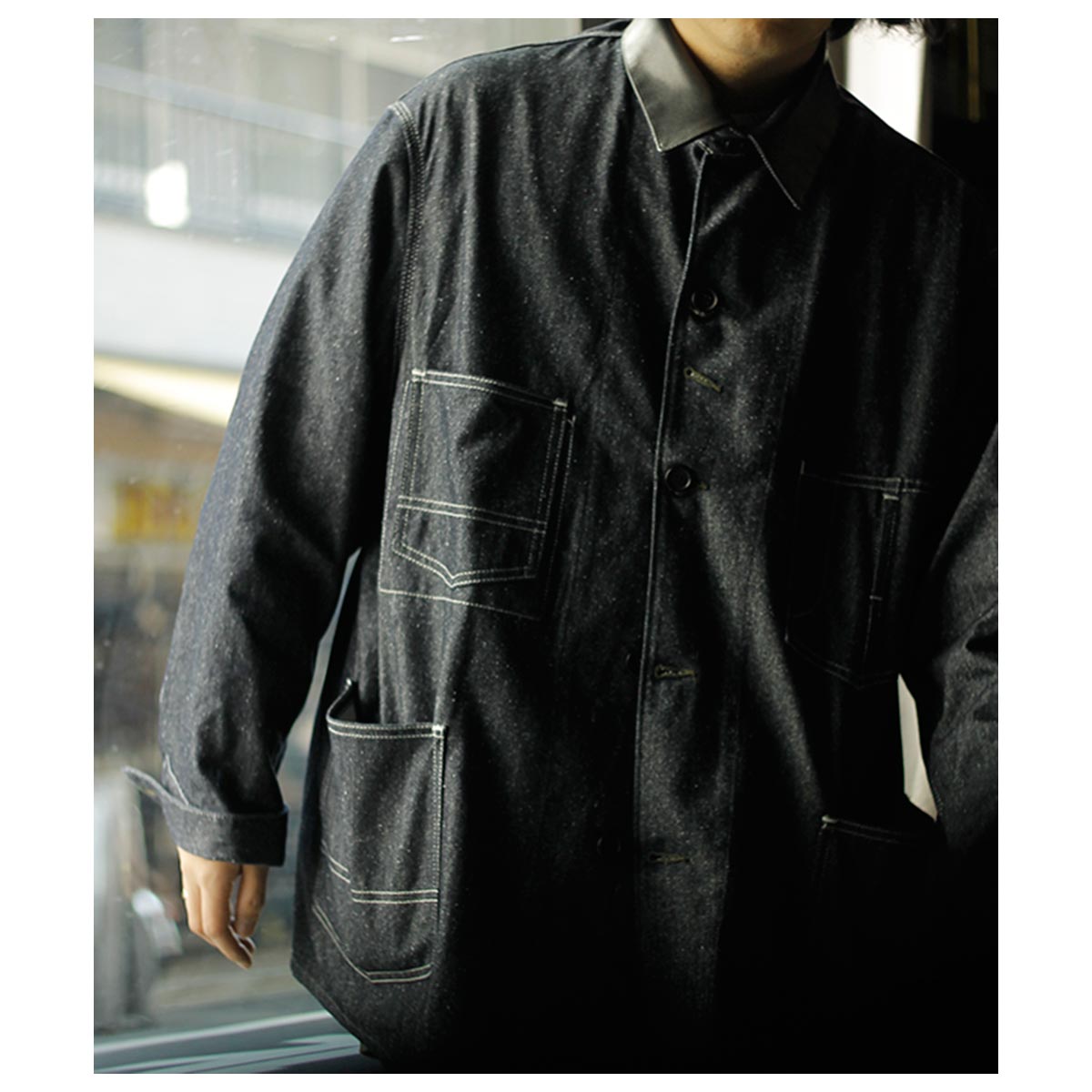 大戦期のカバーオールをベースに気負わず羽織れるパターンワークで仕上げたカバー オール。所謂ビンテージの色落ちとはまた違ったムードを目指し、手作業と洗い加工を いくつも組み合わながら、奥行きのあるフェードや色彩の濃淡を細かく調整して仕上げています。今季はさらに全体の色落ちを強くし、アタリ感やフェード感を強く反映させてアップデートしています。