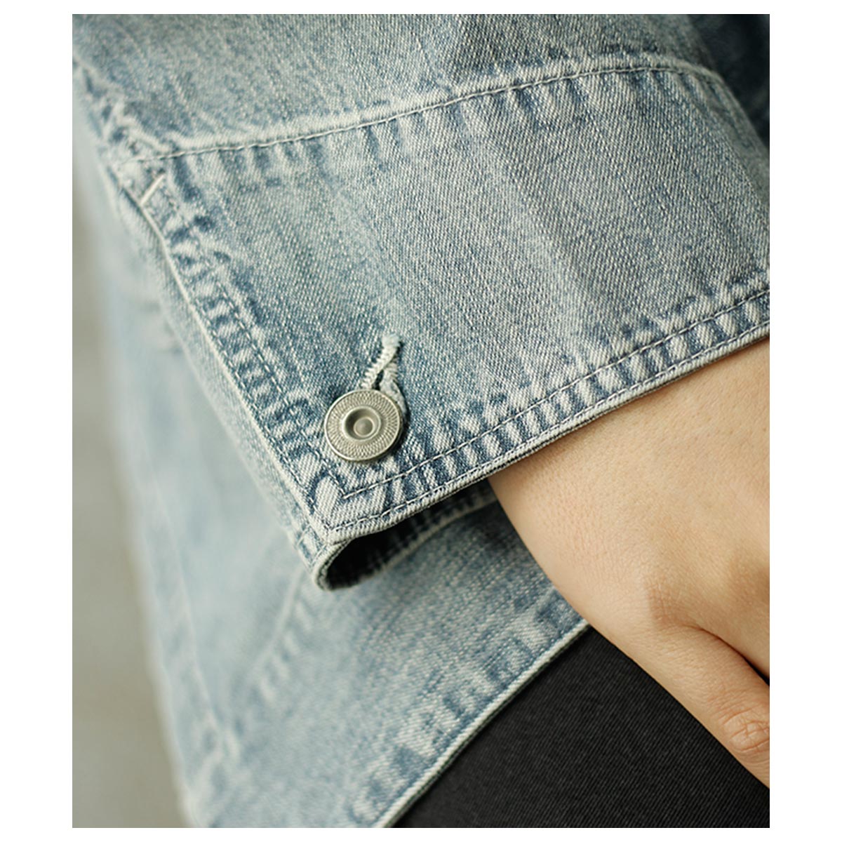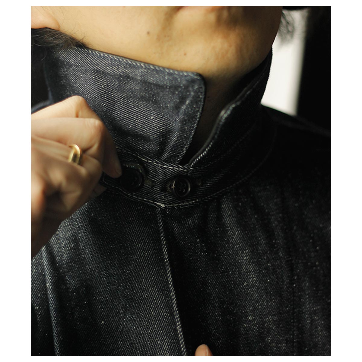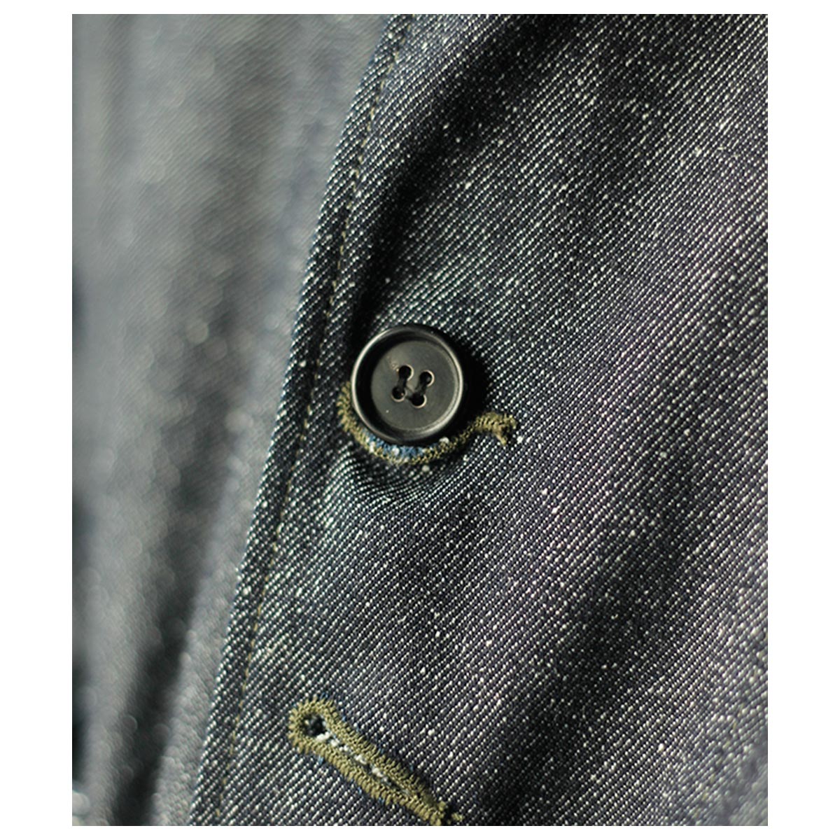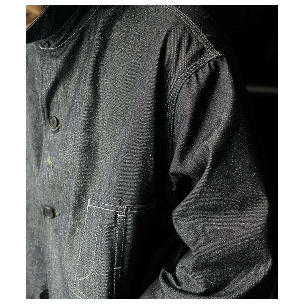 チンストは当時特有のクラシックな形状を踏襲し、左胸には変形ポケットを配置。裾はわずかにラウン ドし、ポケット内側には補強布を当てるなど細部までヴィンテージ仕様を再現しています。ステッチはホワイトとグリーンを使い分け、配色と運針に変化を持たせました。さらに、旧式織機によるセルヴィッチデニムを採用し、別注の鉄製+真鍮メッキボタンで経年変化も楽しめます。