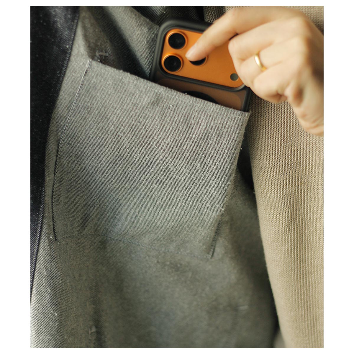 大きめに付いたサイドポケットに携帯をすっぽり入れてラフに適当に着て欲しい。
